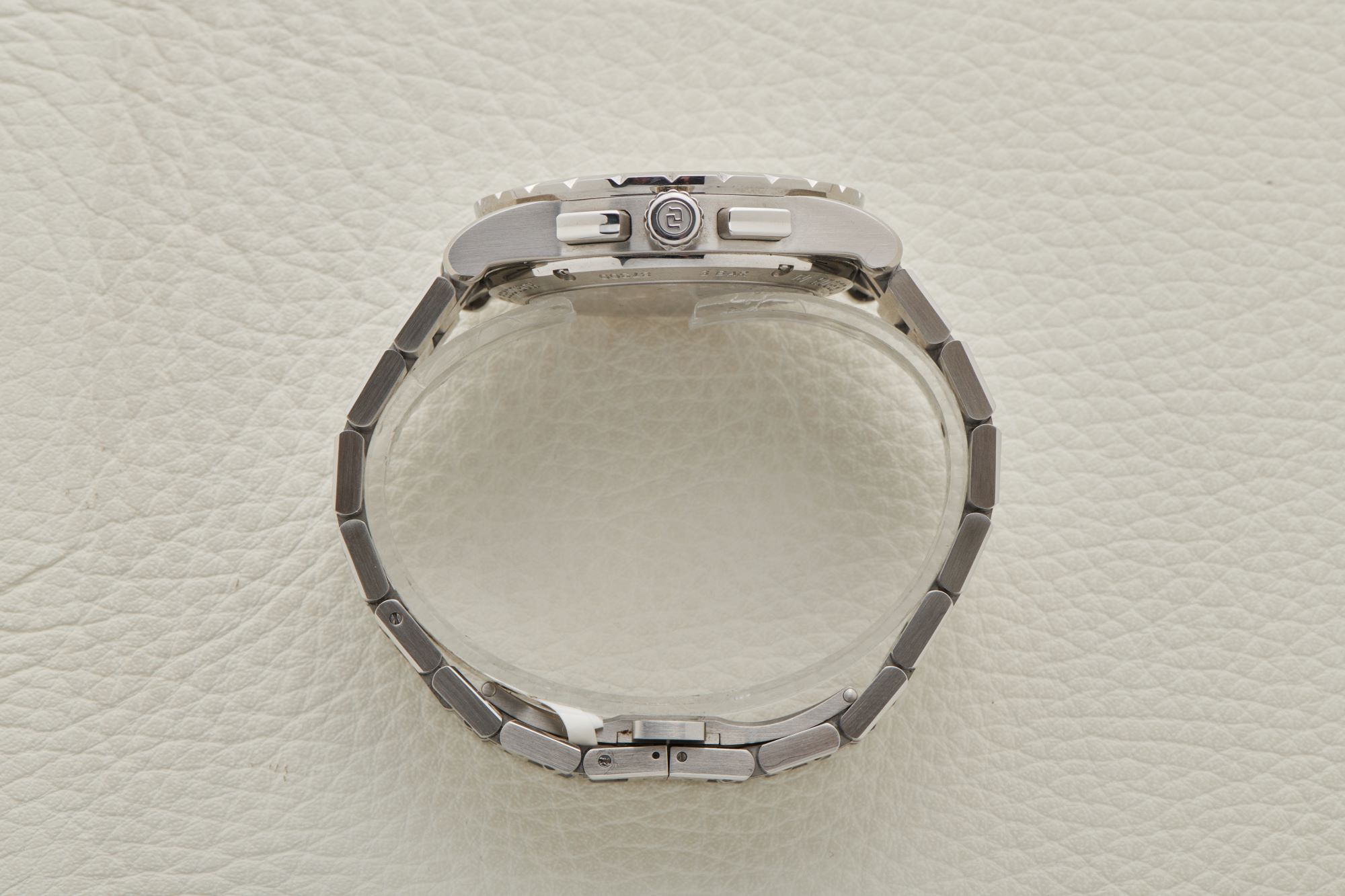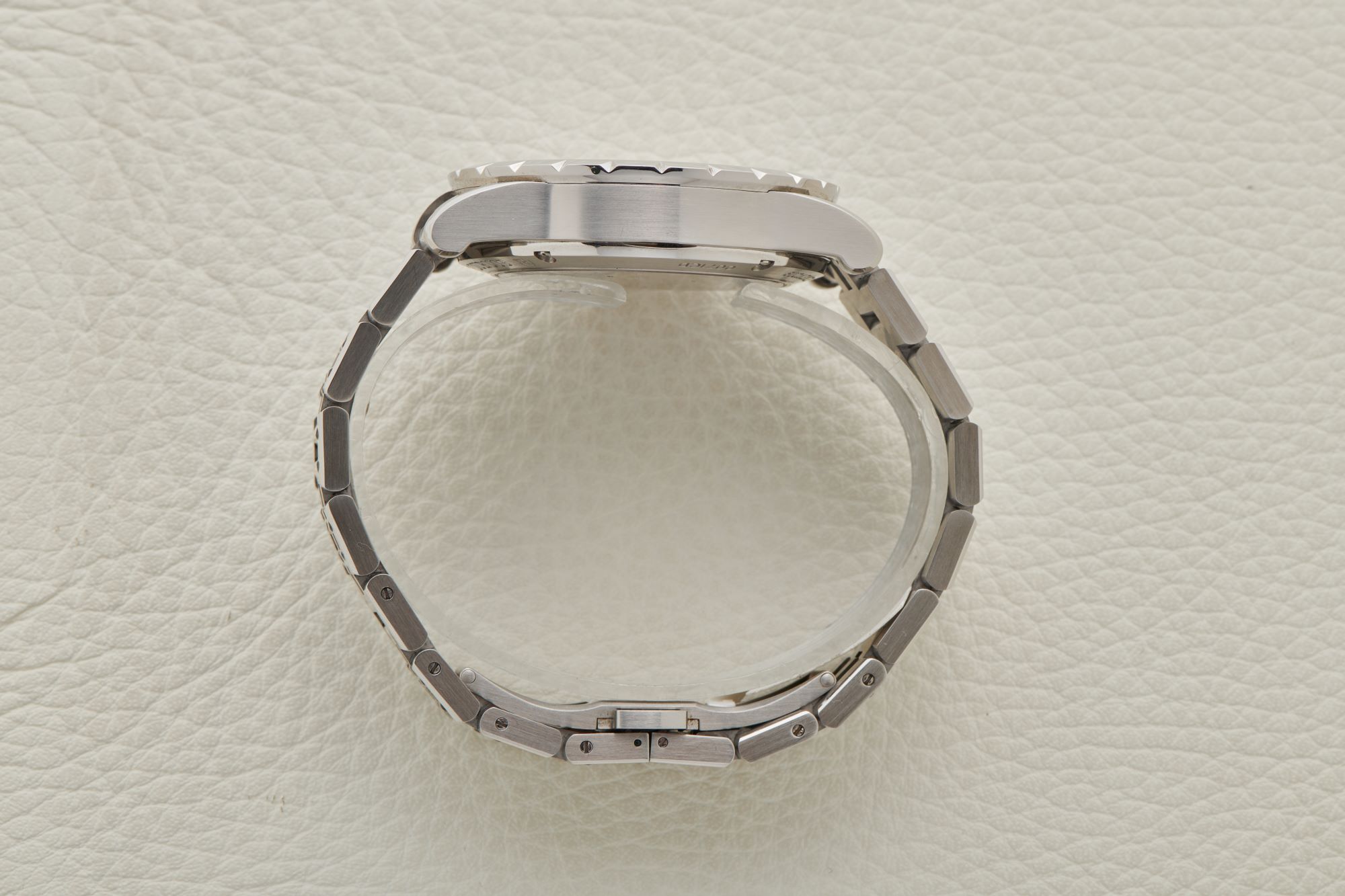 CaseRound stainless steel case, brushed with polished chamfer on the lugs. Polished stainless steel bezel with triangular flutes. Crown at 3 o'clock, chronograph pushers at 2 and 4 o'clock.