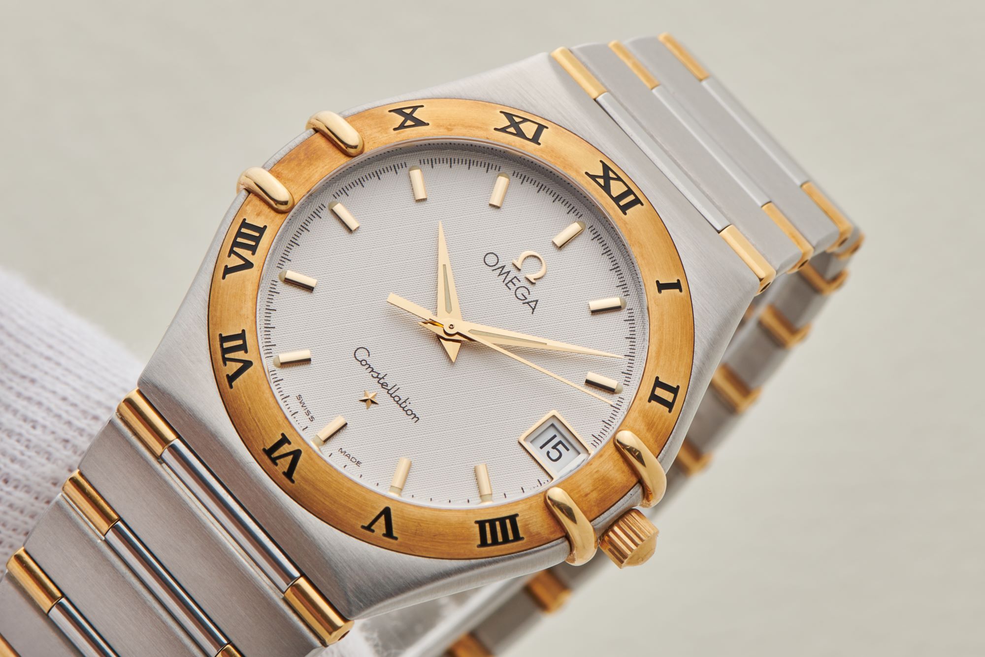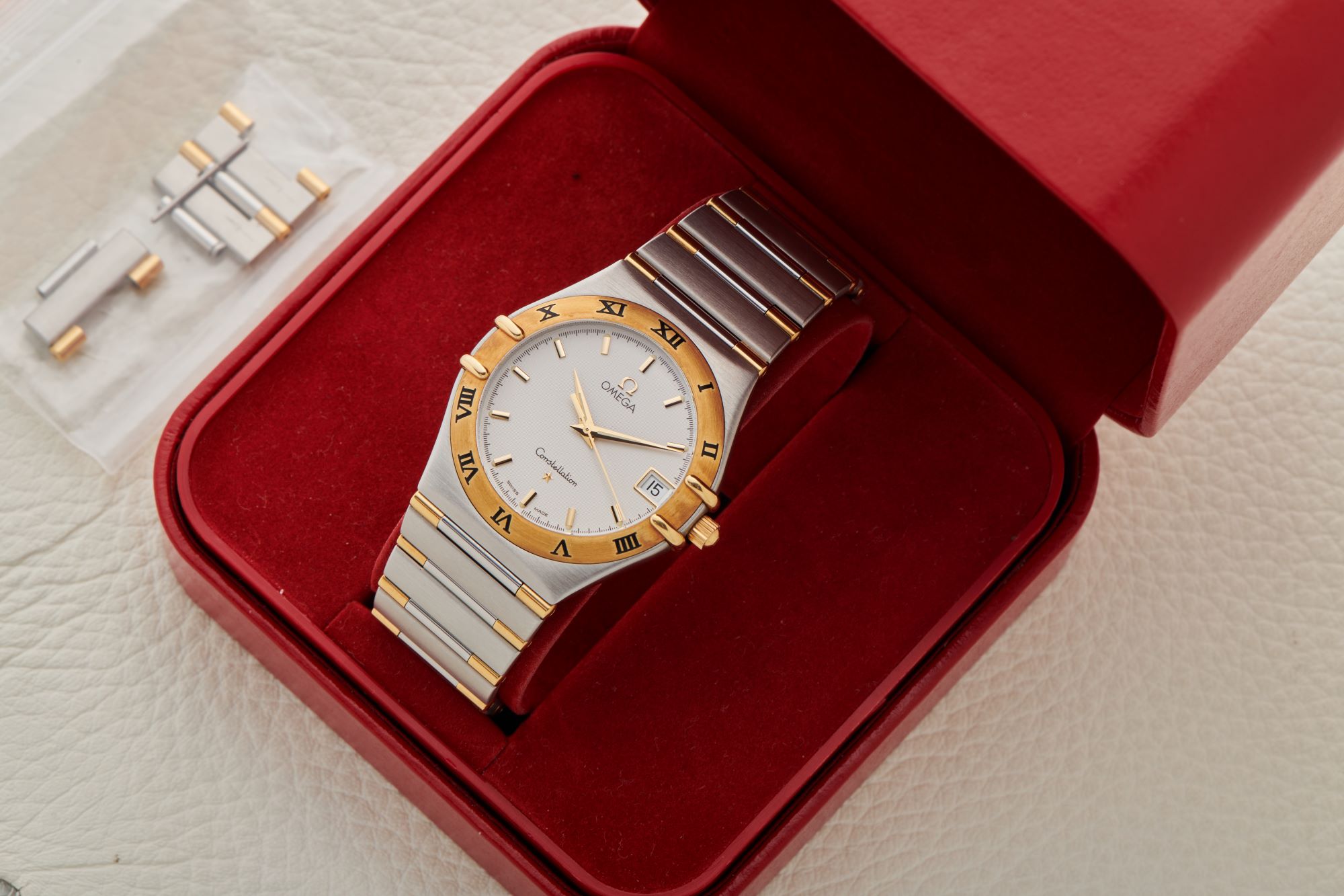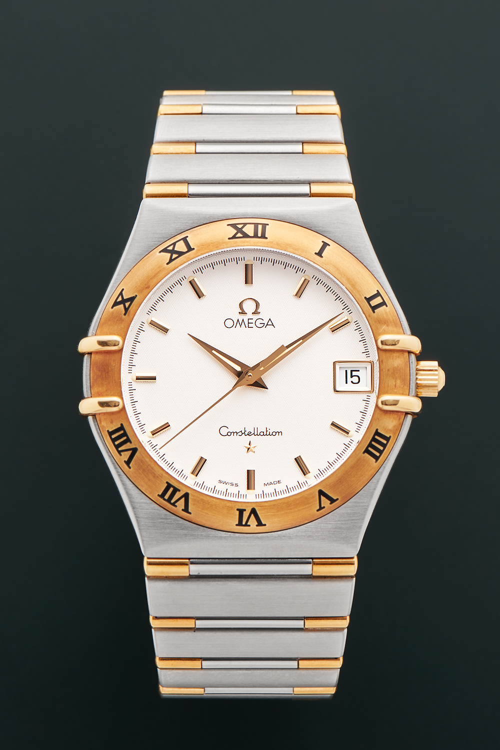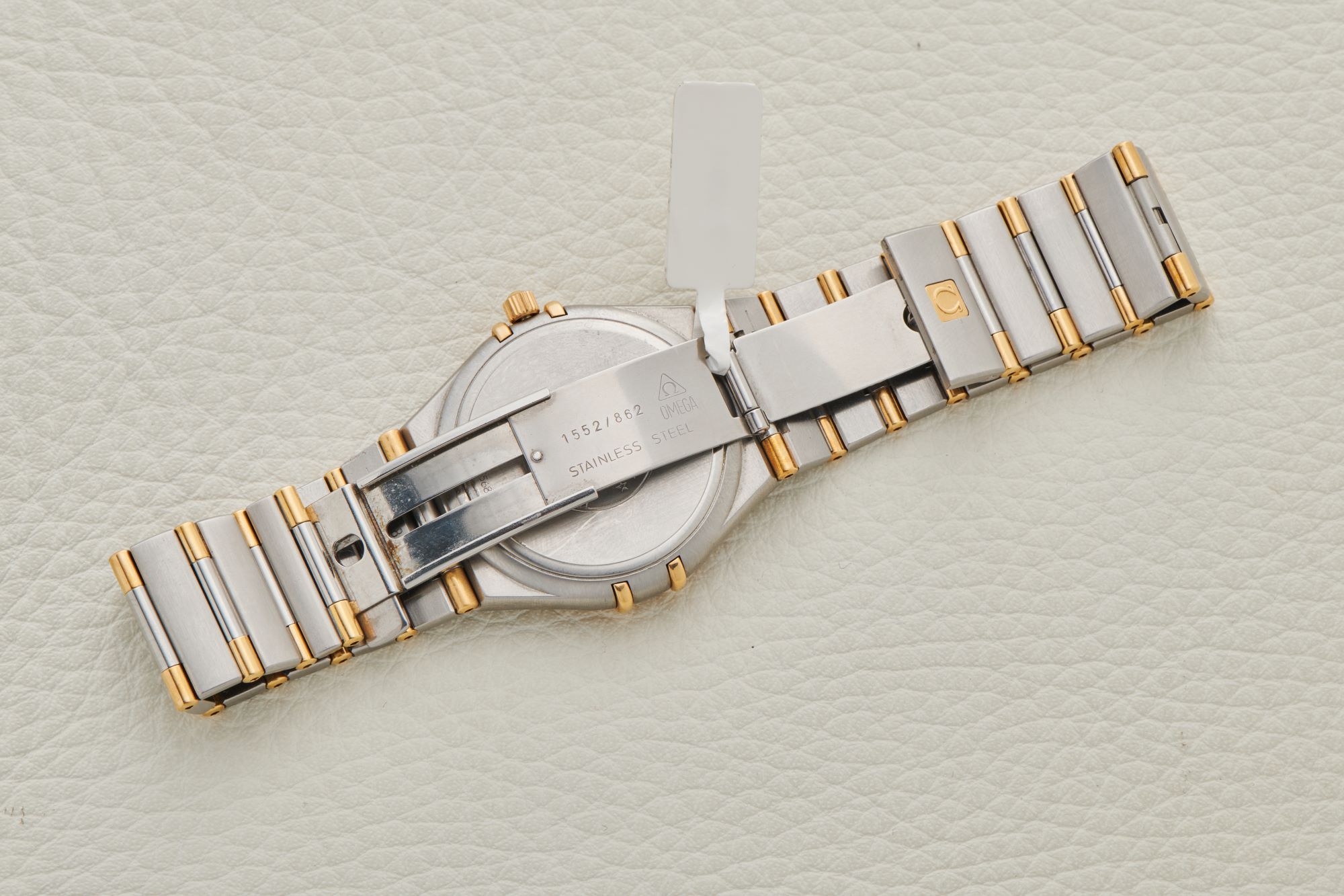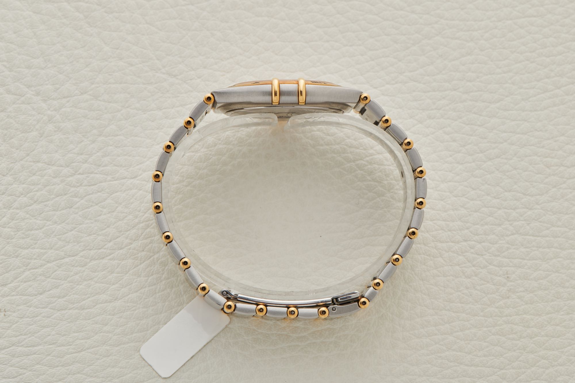 CaseStainless steel case with gold bezel, white dial with stick indices and dauphine hour and minute hands, stick seconds hand, crown 3 o'clock