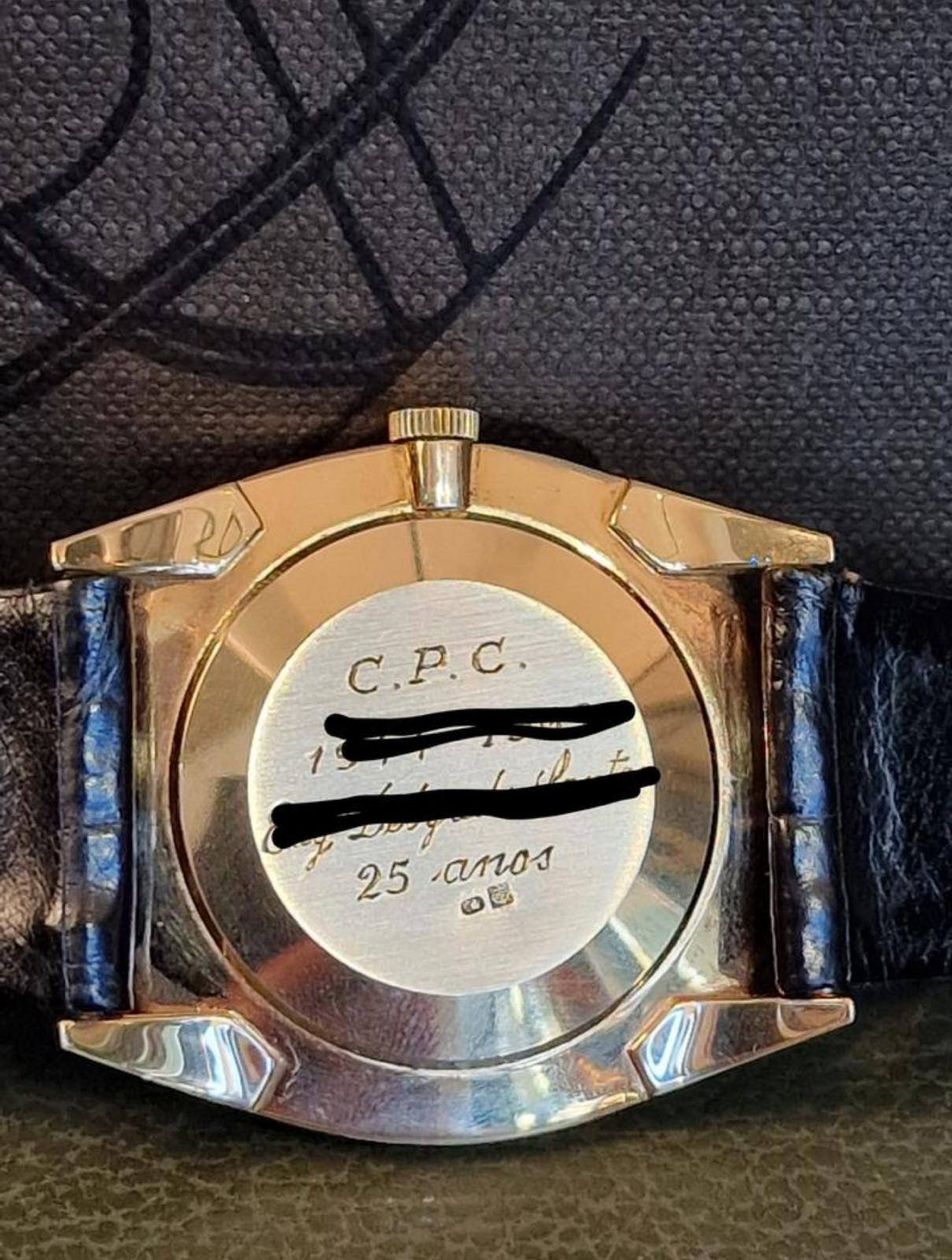CaseRounded cushion-shaped case in 18k yellow gold, polished, tapered lugs, fixed bezel in 18k yellow gold, polished, snap-on solid gold caseback, polished, with dedication engraving, winding crown at 3 o’clock