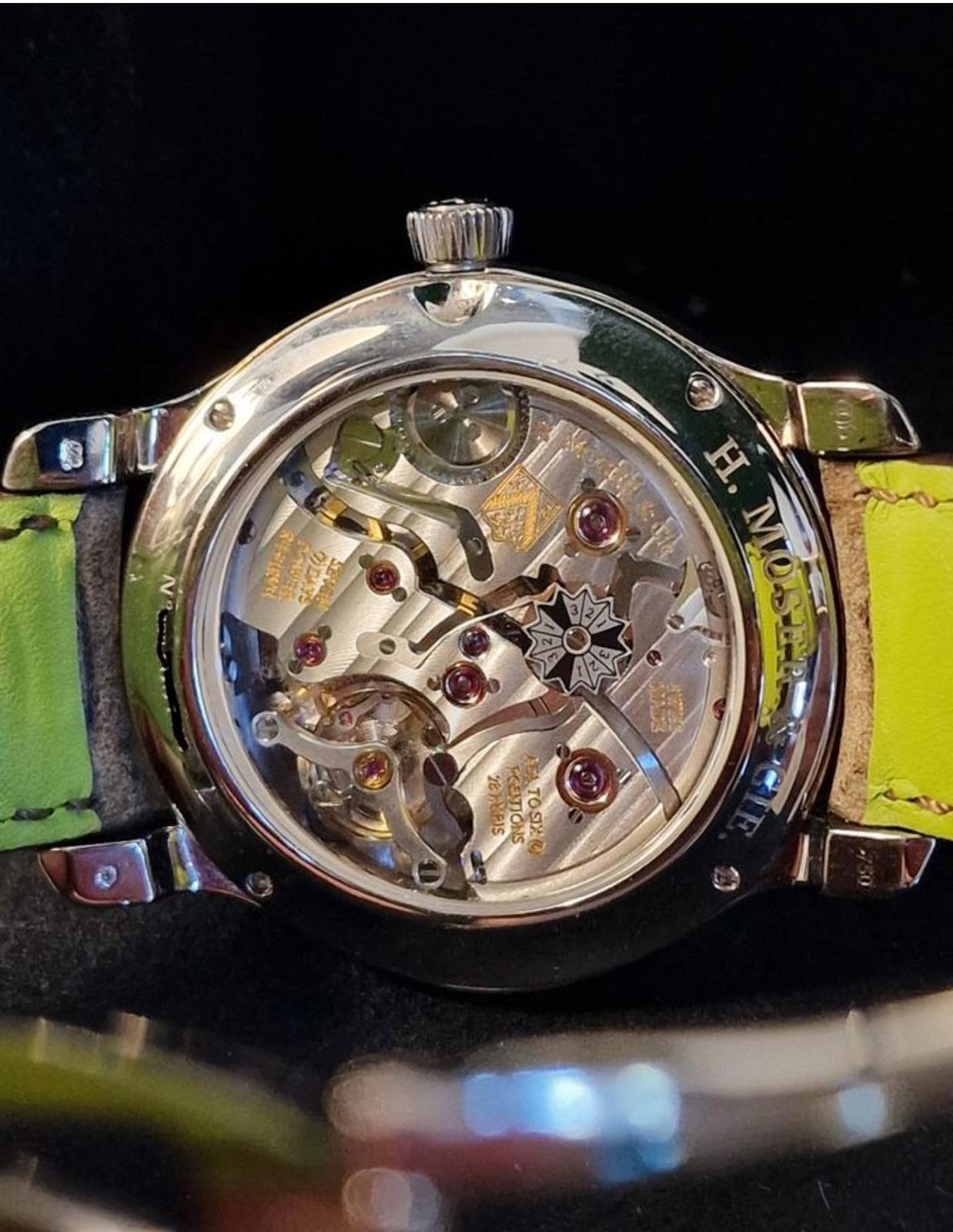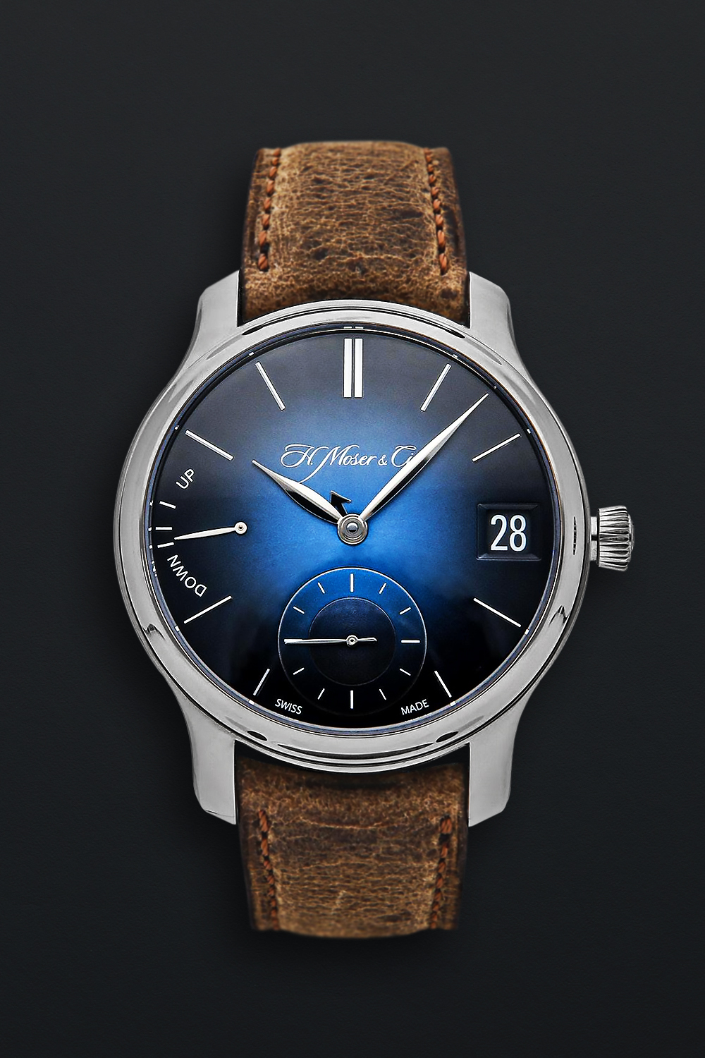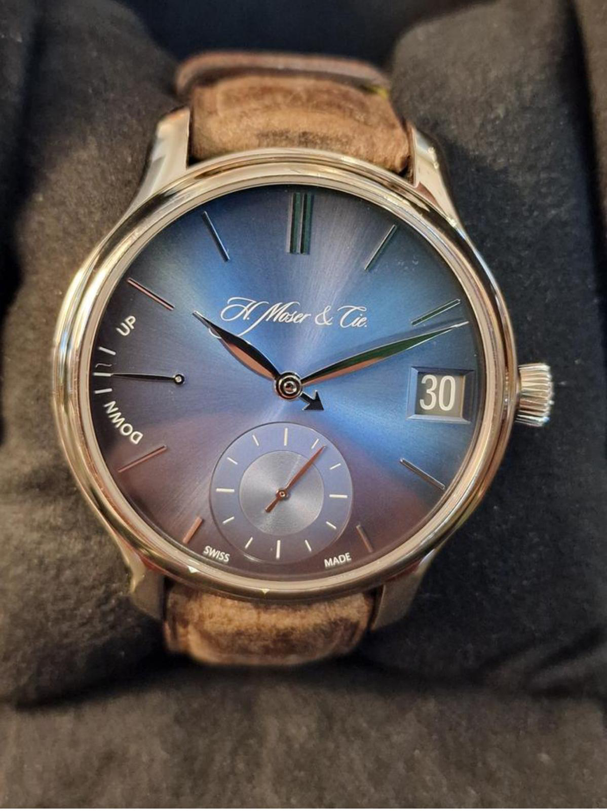 DialBlue ‘fume’ sunburst dial, signed ‘H. Moser & Cie’, ‘leaf’ hour and minute hands, applied ‘stick’ indexes, recessed small seconds sub-dial at 6 o’clock, date aperture at 3 o’clock, power reserve at 9 o’clock, small central ‘arrowhead’ hand to indicate the month