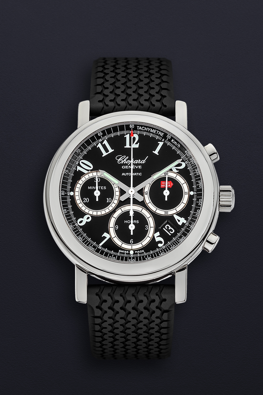 DialBlack dial, signed ‘Chopard Geneve’, 1000 Miglia red flag emblem at 3 o’clock, white luminous Arabic numerals, ‘obelisk’ hour and minute hands, luminous, white ‘stick’ central chrono seconds hand with red arrow, recessed and grooved sub-dials for small seconds at 3 o’clock, 30-minute counter at 9 o’clock, 12-hour counter at 6 o’clock, date aperture between 4 and 5 o’clock, tachymeter scale on rehaut