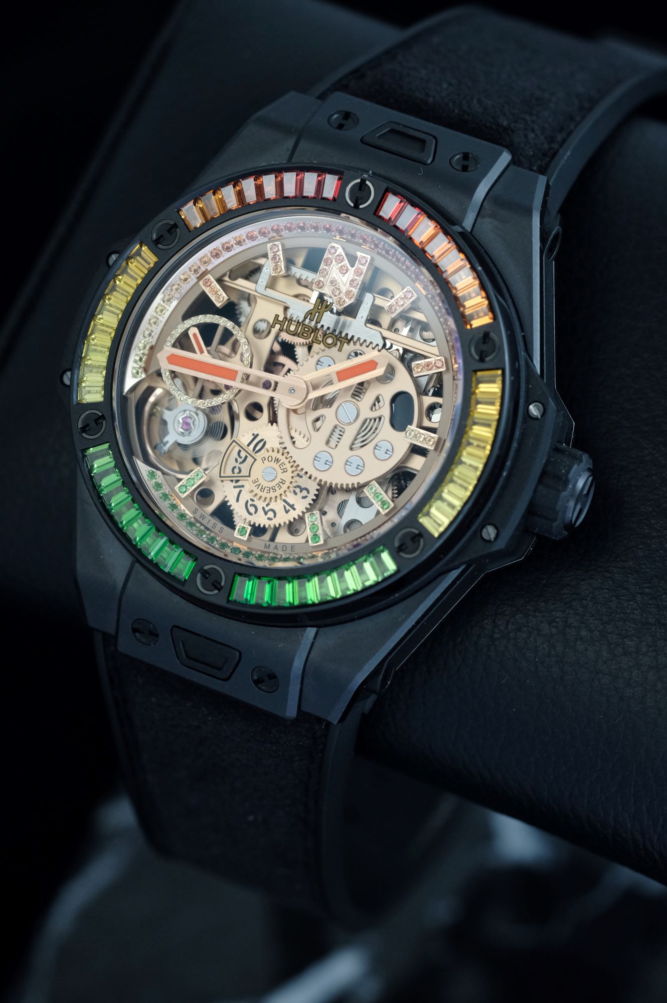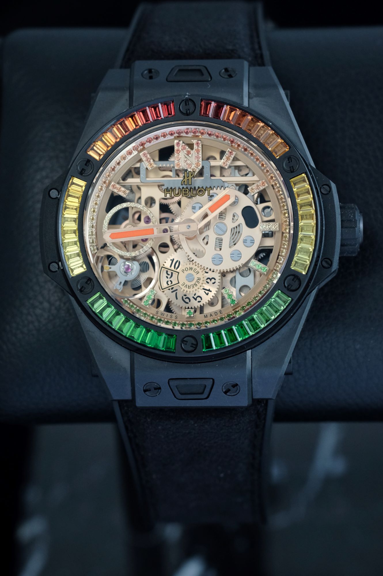 CaseRound case in black ceramic, black bezel fixed on 6 screws, set with 48 baguette orange and yellow sapphires and tsavorites, exhibition caseback fixed on 6 screws, with ‘Hublot Big Bang Limited Edition’ and limited-edition number engraved and sapphire crystal with Nicky Jam signature, winding crown with embossed ‘H’ logo at 3 o’clock, strap quick change system with two pushers at 12 and 6 o’clock