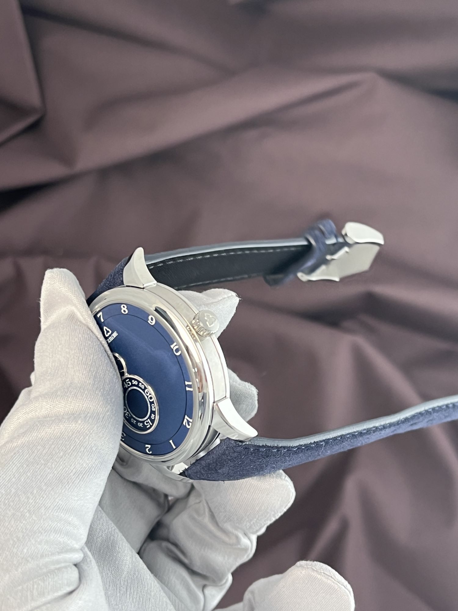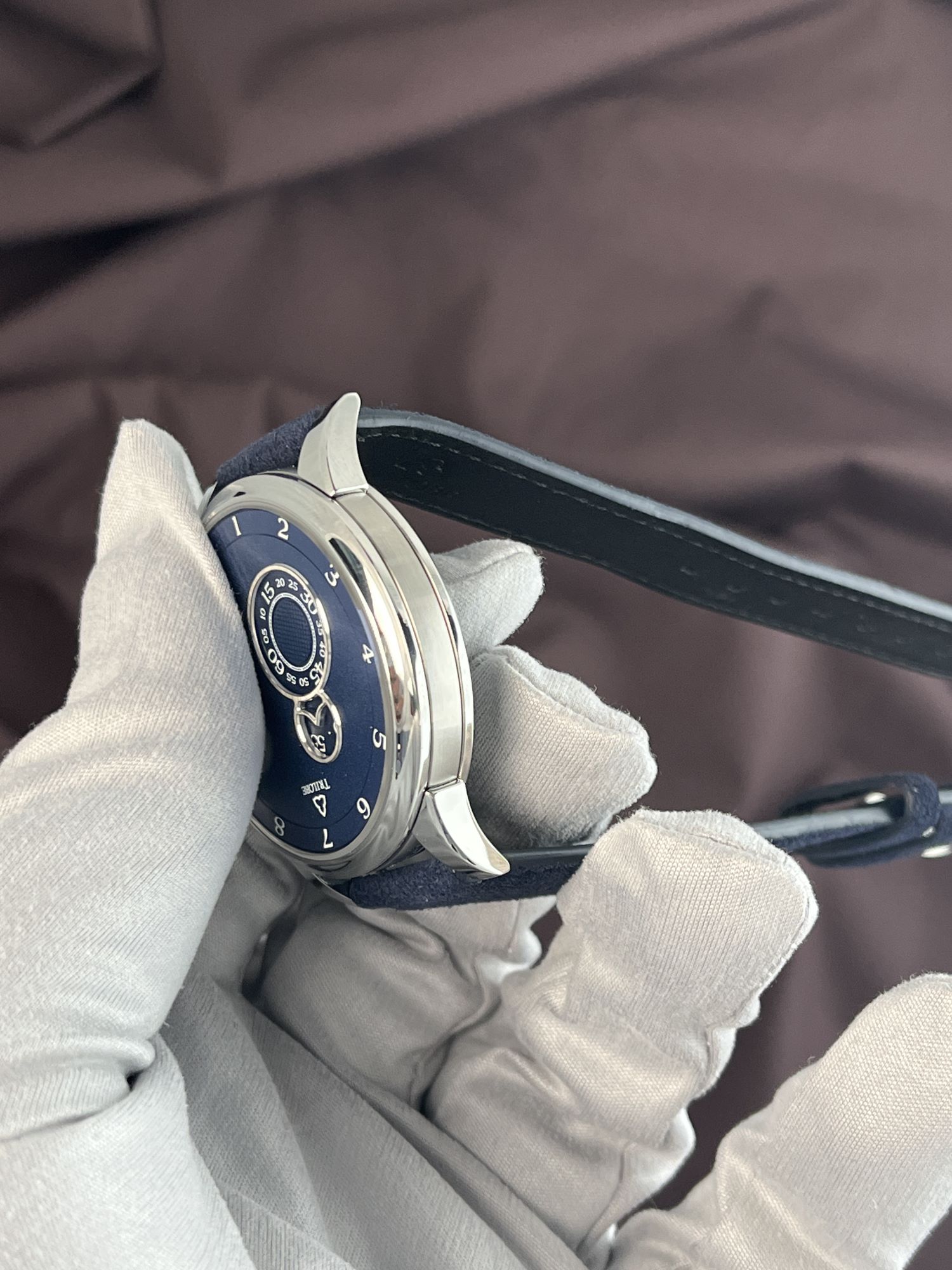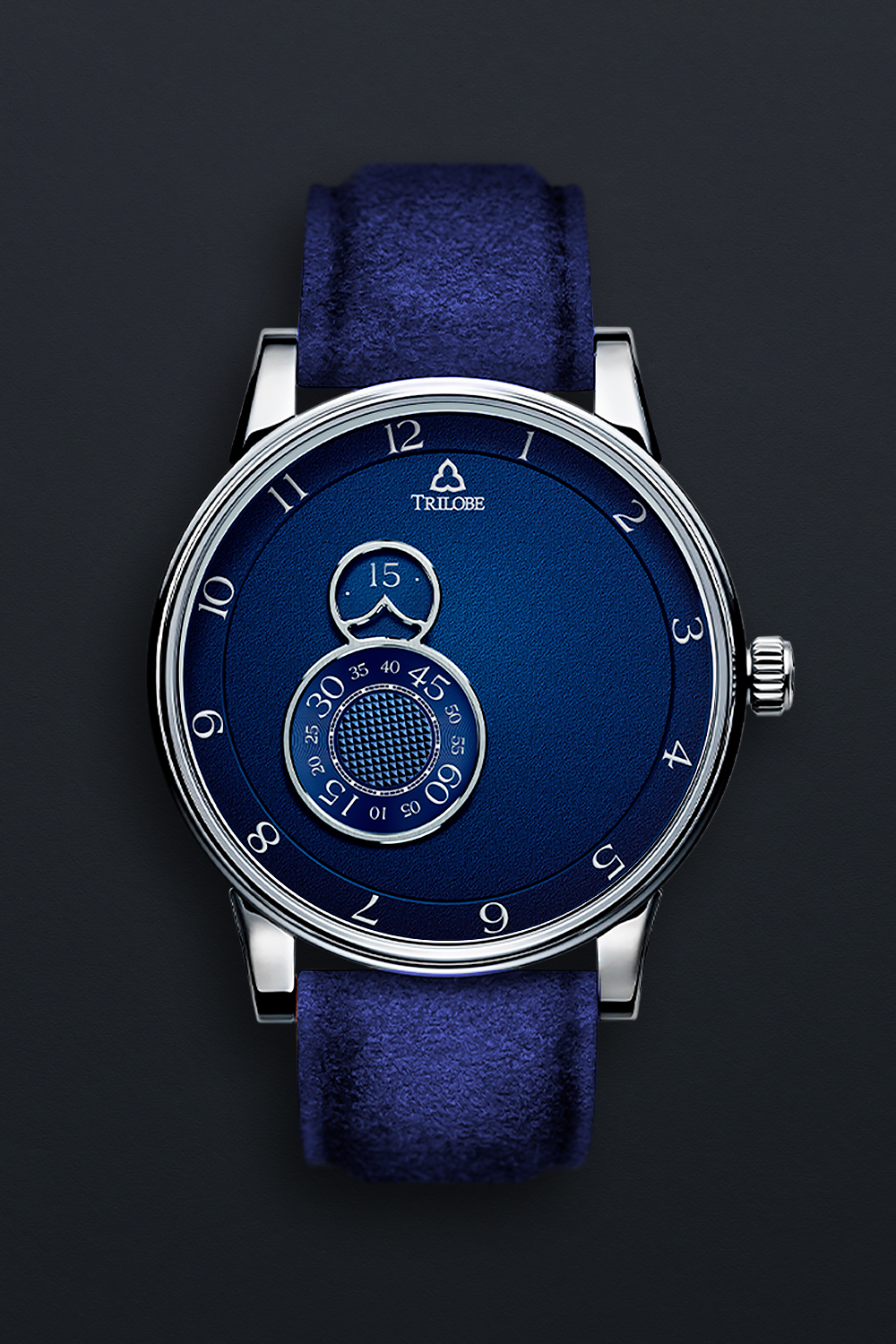 DialDark blue grained dial, signed Trilobe, with peripheral rotating ring displaying hour, aperture for wandering minute at 10 o’clock, small seconds on rotating ring at 8 o’clock