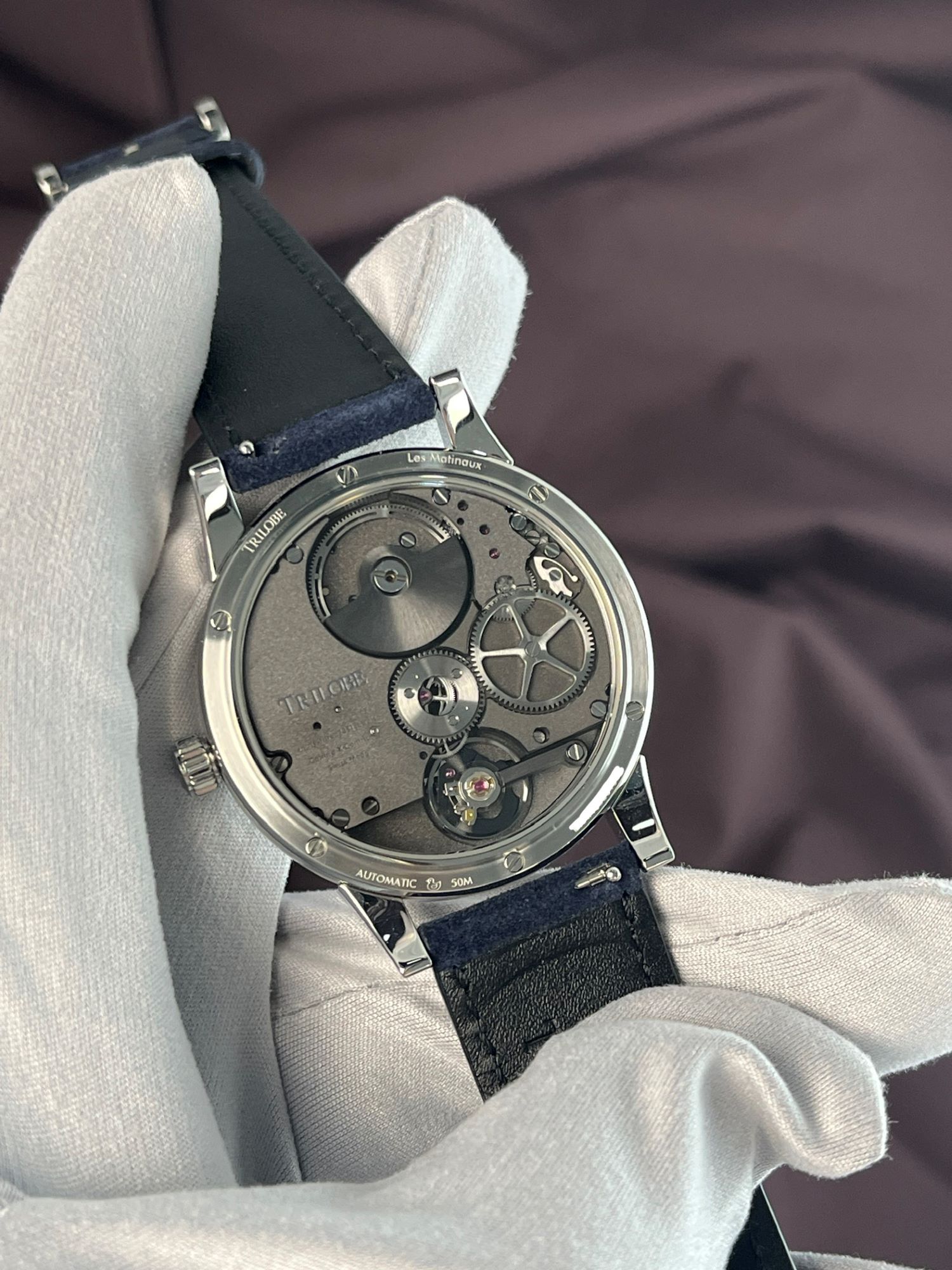 MovementSelf-winding mechanical movement, signed Trilobe, self-winding mechanism with mini-rotor, grey coated bridges and mainplate with grained decoration, engraved inscriptions, functions: hours, minutes, seconds