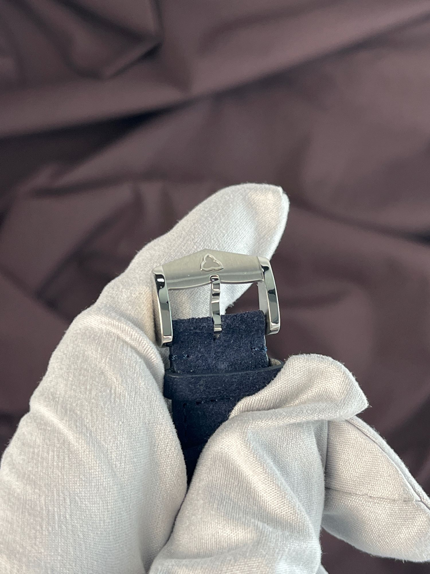 StrapDark blue leather strap, pin buckle in titanium, polished and brushed, with embossed ‘trefoil’ logo