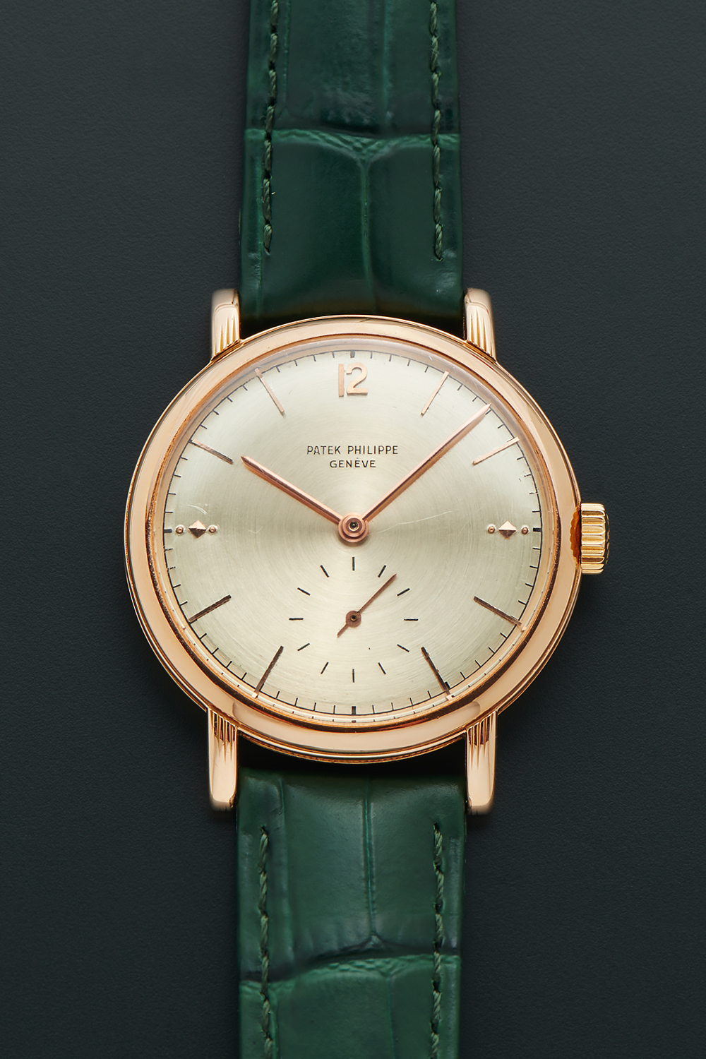 DialChampagne dial with radial brushing, applied rose gold indices, rose gold hands, small seconds subdial at 6 o'clock