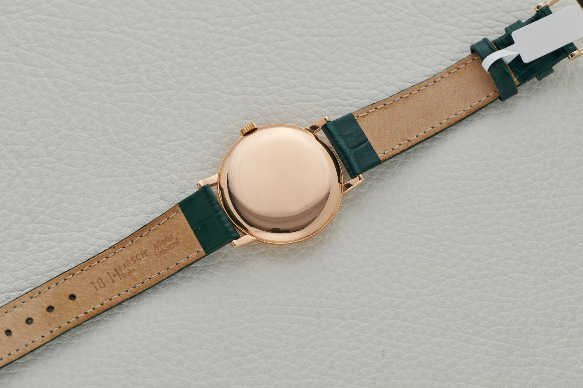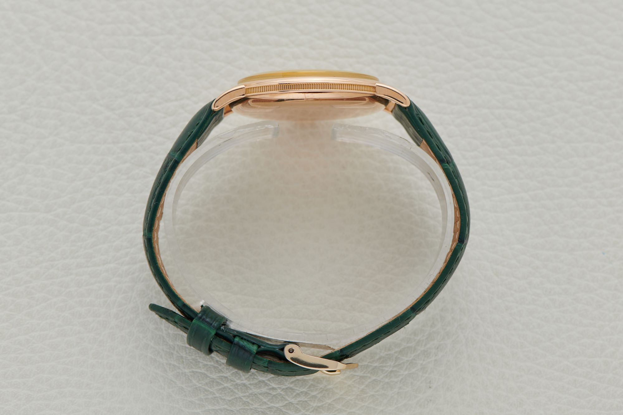 CaseRound case in 18k rose gold with engraved lugs, fluted coin-edge case flanks, winding crown at 3 o'clock