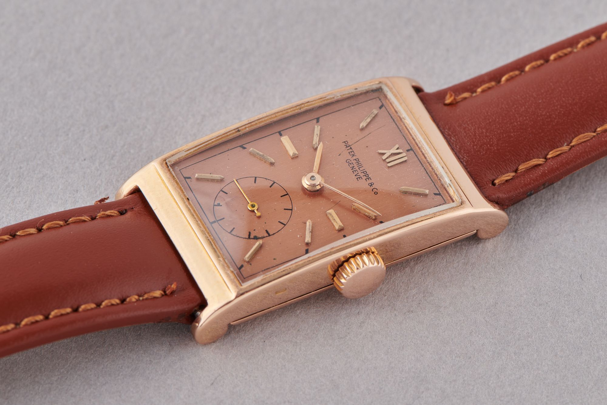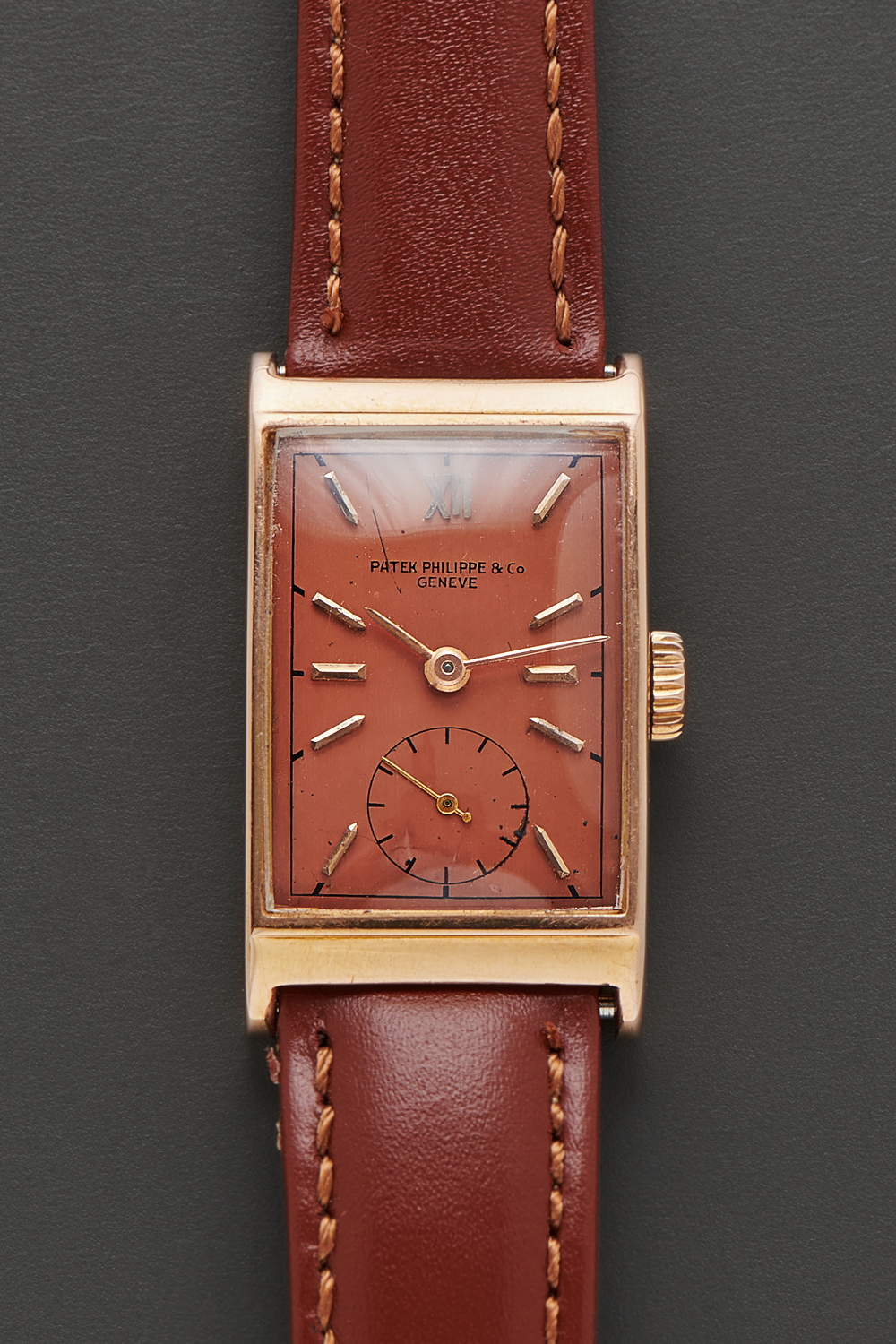 DialCopper-colored dial with applied yellow gold indices and yellow gold hands, small seconds subdial at 6 o'clock, signed 'Patek Philippe Genève' at 12 o'clock