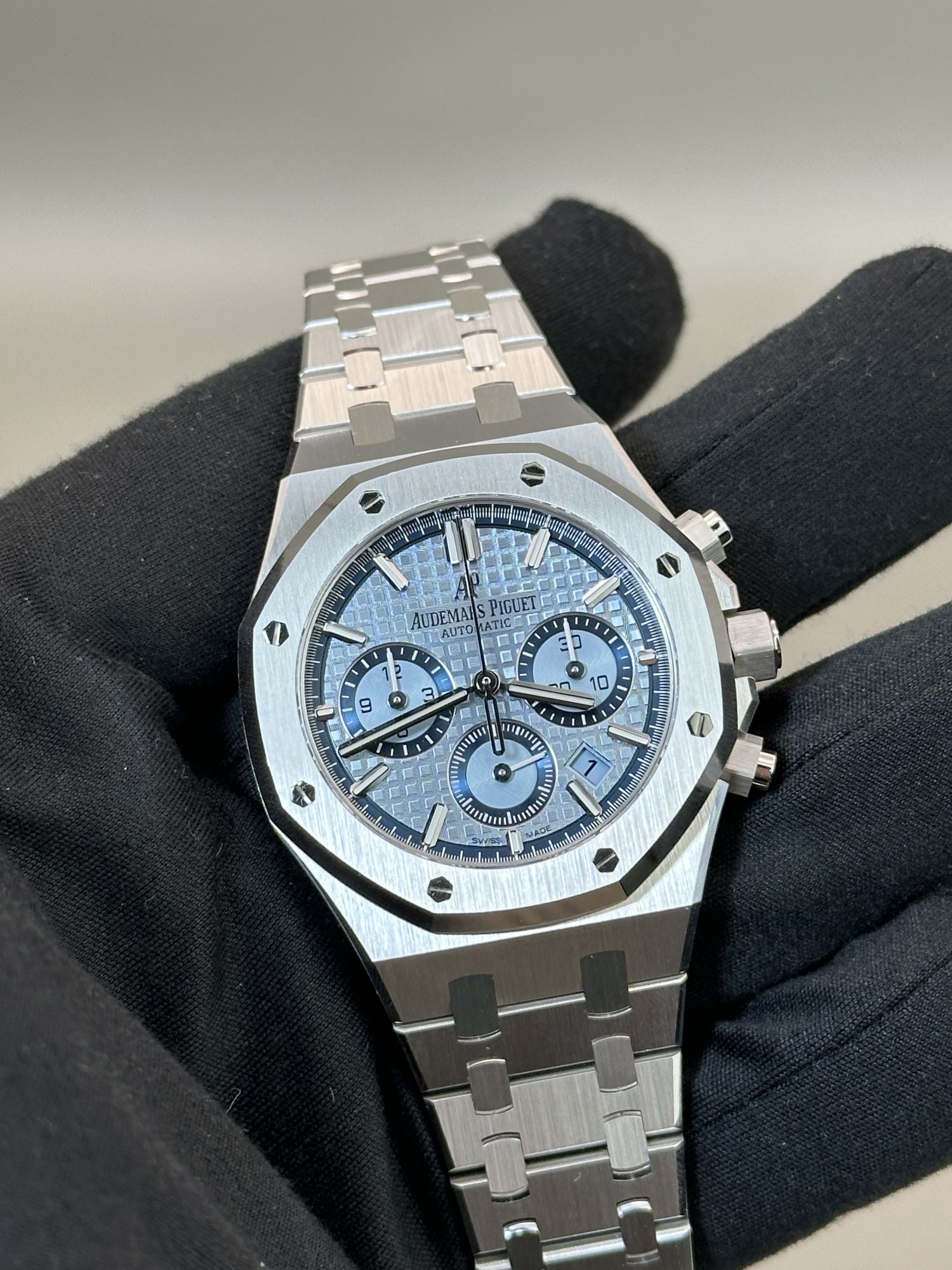 DialLight blue dial with tapisserie relief pattern, signed Audemars Piguet, applied ‘AP’ logo at 12 o’clock, applied ‘baguette’ indexes, luminous, white gold Royal Oak ‘baguette’ hands, luminous, ‘stick’ chrono central seconds hand with ‘baguette’ counterweight, date aperture between 4 and 5 o’clock, recessed counters with dark blue grooved outline: 30-minute at 3 o’clock, 12-hour at 9 o’clock, small seconds sub-dial at 6 o’clock