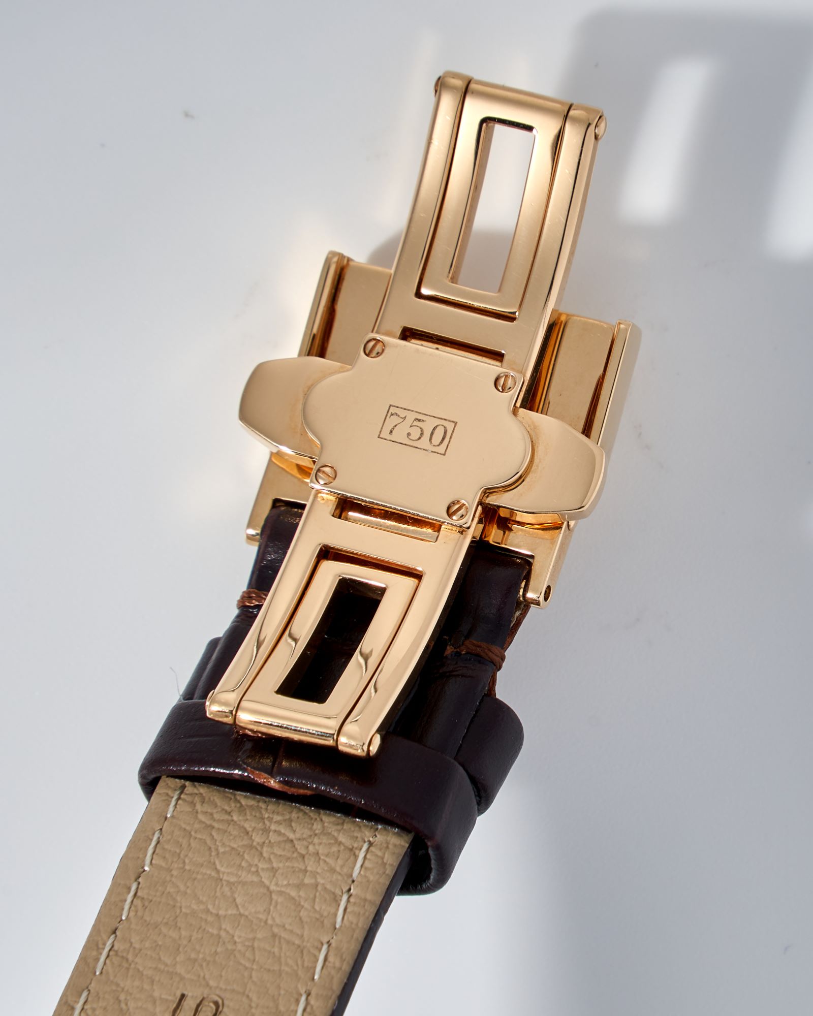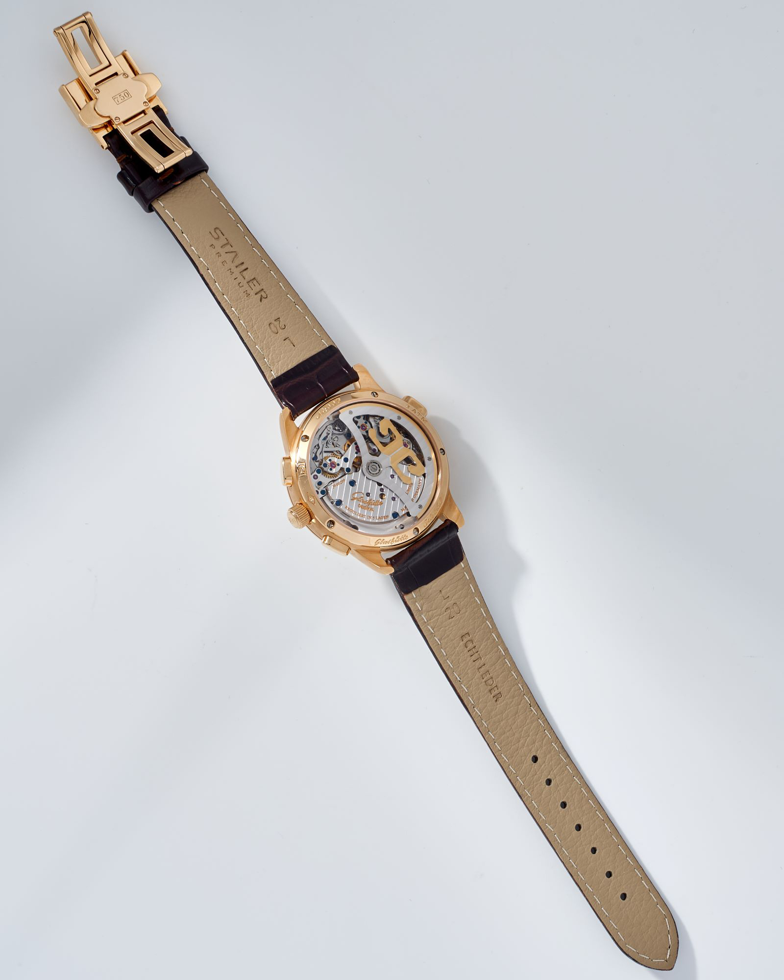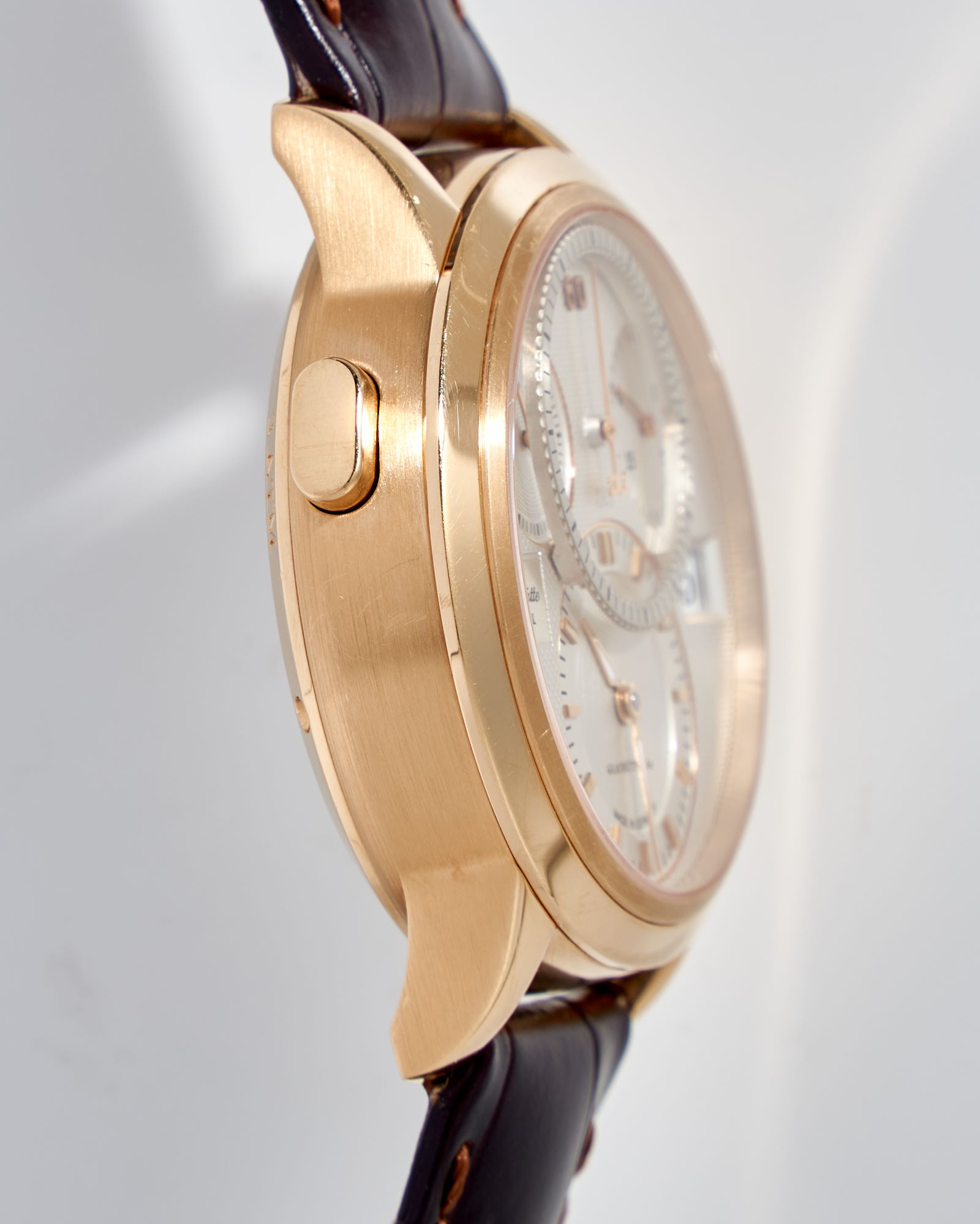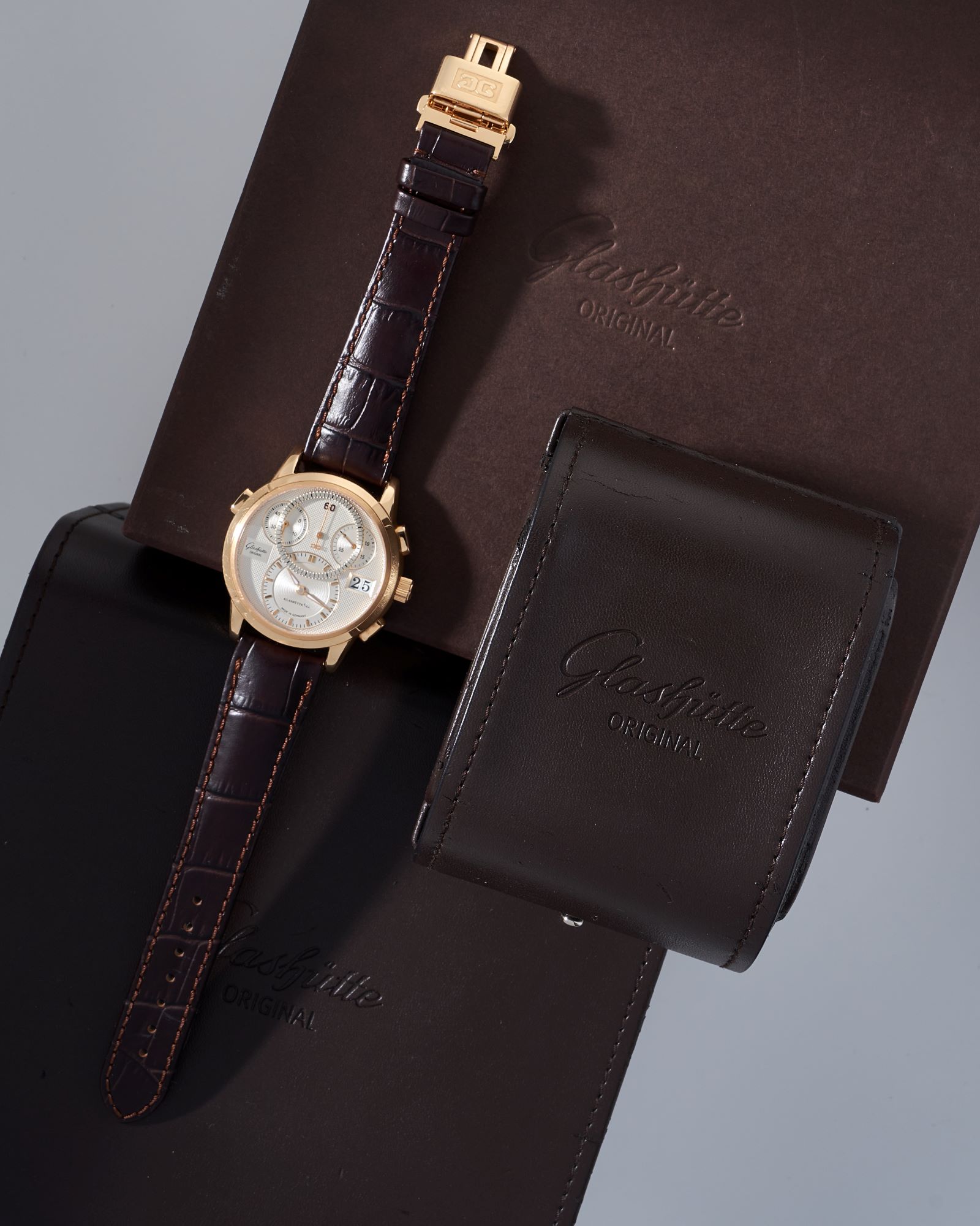 CaseRound case in 18k rose gold, polished and brushed, fixed bezel in 18k rose gold, polished, exhibition caseback fixed on 5 screws, with ‘Glashütte Original’ and case number engraved, winding crown at 3 o’clock with ‘GG’ logo embossed, chrono pushers at 2 and 4 o’clock, pusher at 10 o’clock to quickset the large date display