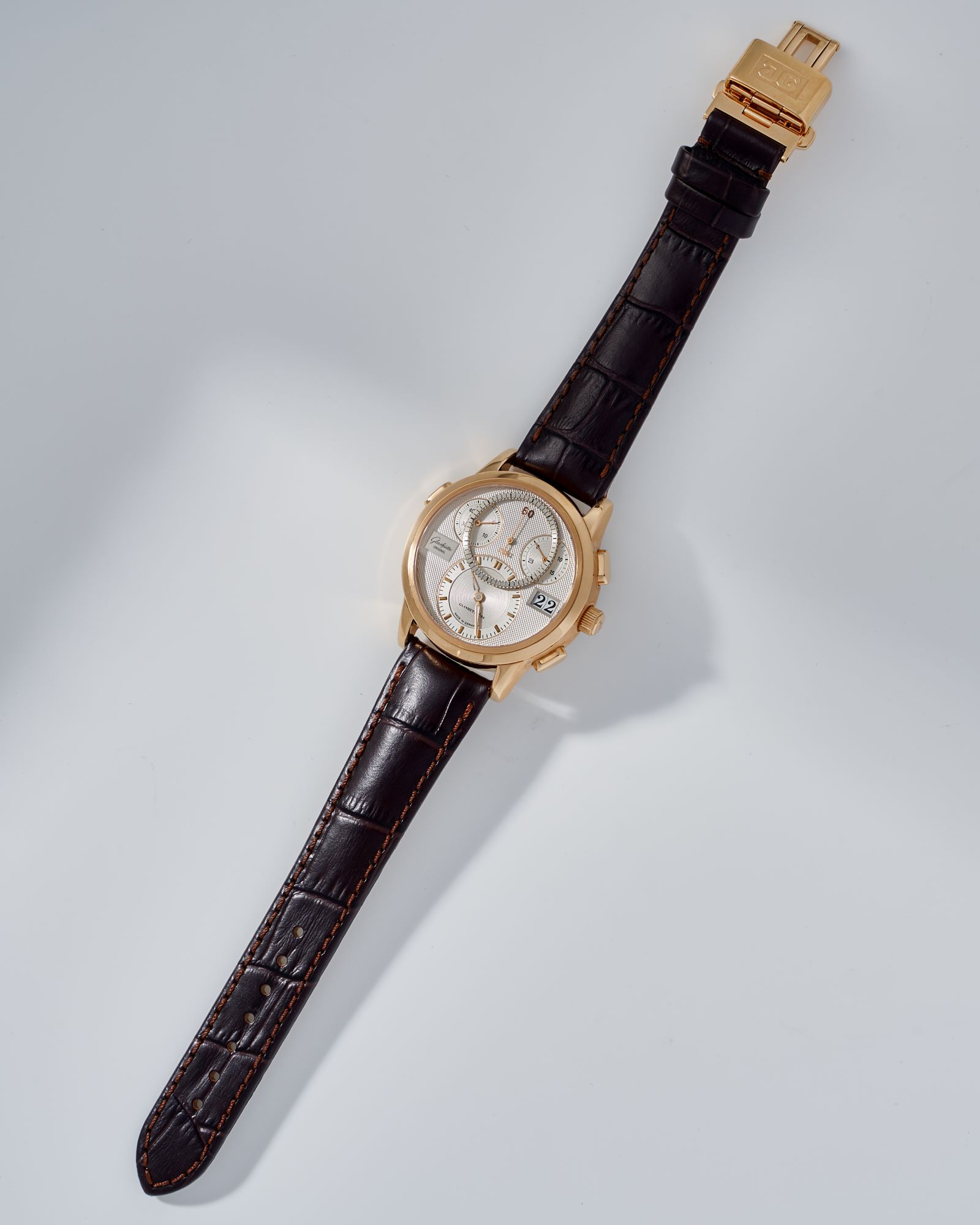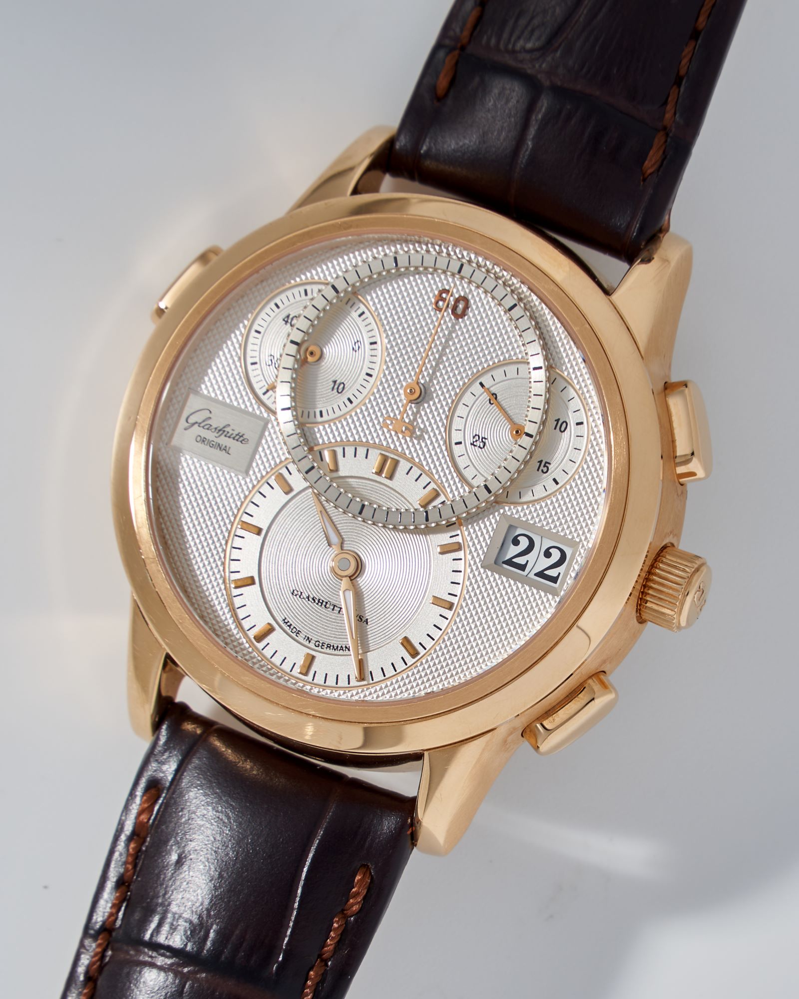 DialSilver plated dial, signed ‘Glashütte Original Glashütte I/SA’, with ‘Clous de Paris’ guilloche pattern, grooved main time sub-dial at 6 o’clock with ‘alpha’ hour and minute hands, luminous, raised sub-dial at 12 o’clock with ‘stick’ central chrono seconds hand with GG logo counterweight, grooved small seconds sub-dial at 10 o’clock, grooved 30-minute counter at 2 o’clock, big date aperture at 3 o’clock
