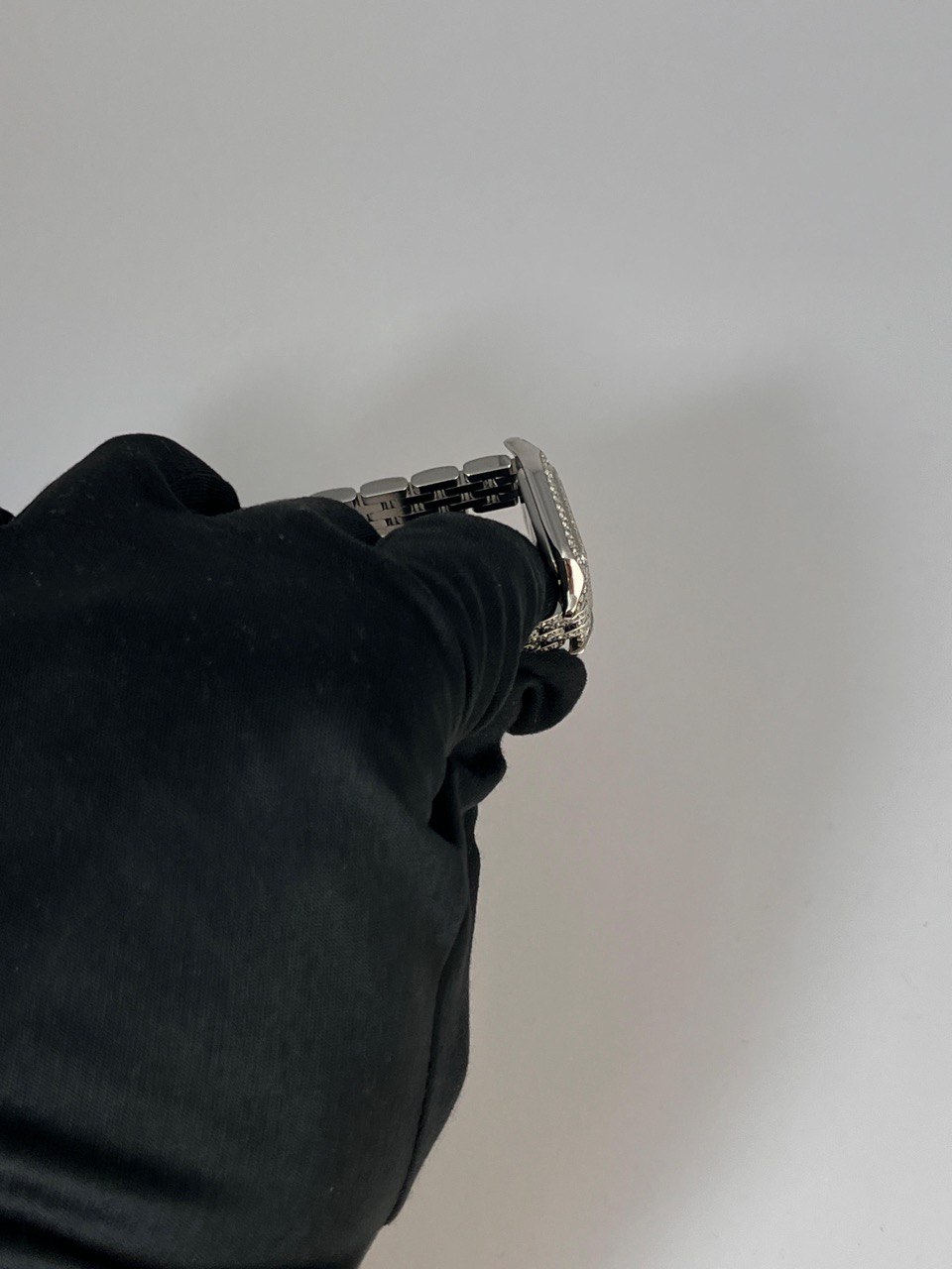 CaseRounded square case in stainless steel, custom diamond-set, fixed bezel in stainless steel, custom diamond-set, brushed stainless steel caseback, fixed on 4 screws, with ‘Cartier Stainless Steel Swiss Made’, reference and case number engraved, setting crown at 3 o’clock between protective shoulders of the case set with diamond