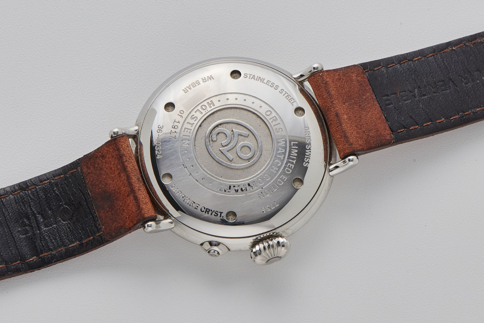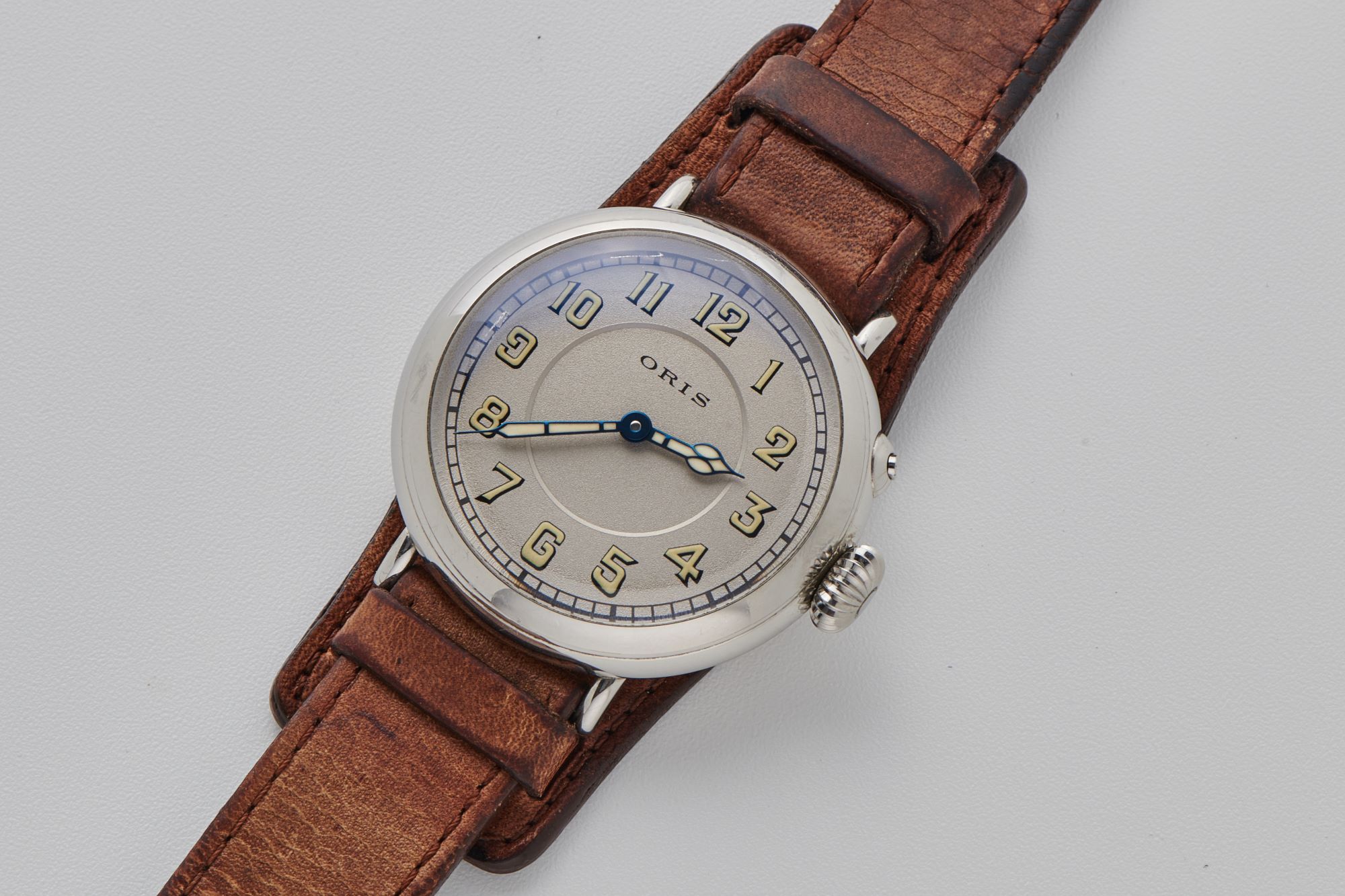 DialSilver sandblasted dial with printed numerals in vintage font with yellow luminous compound, cathedral hands with yellow luminous compound, outer minute track, signed 'ORIS' at 12 o'clock