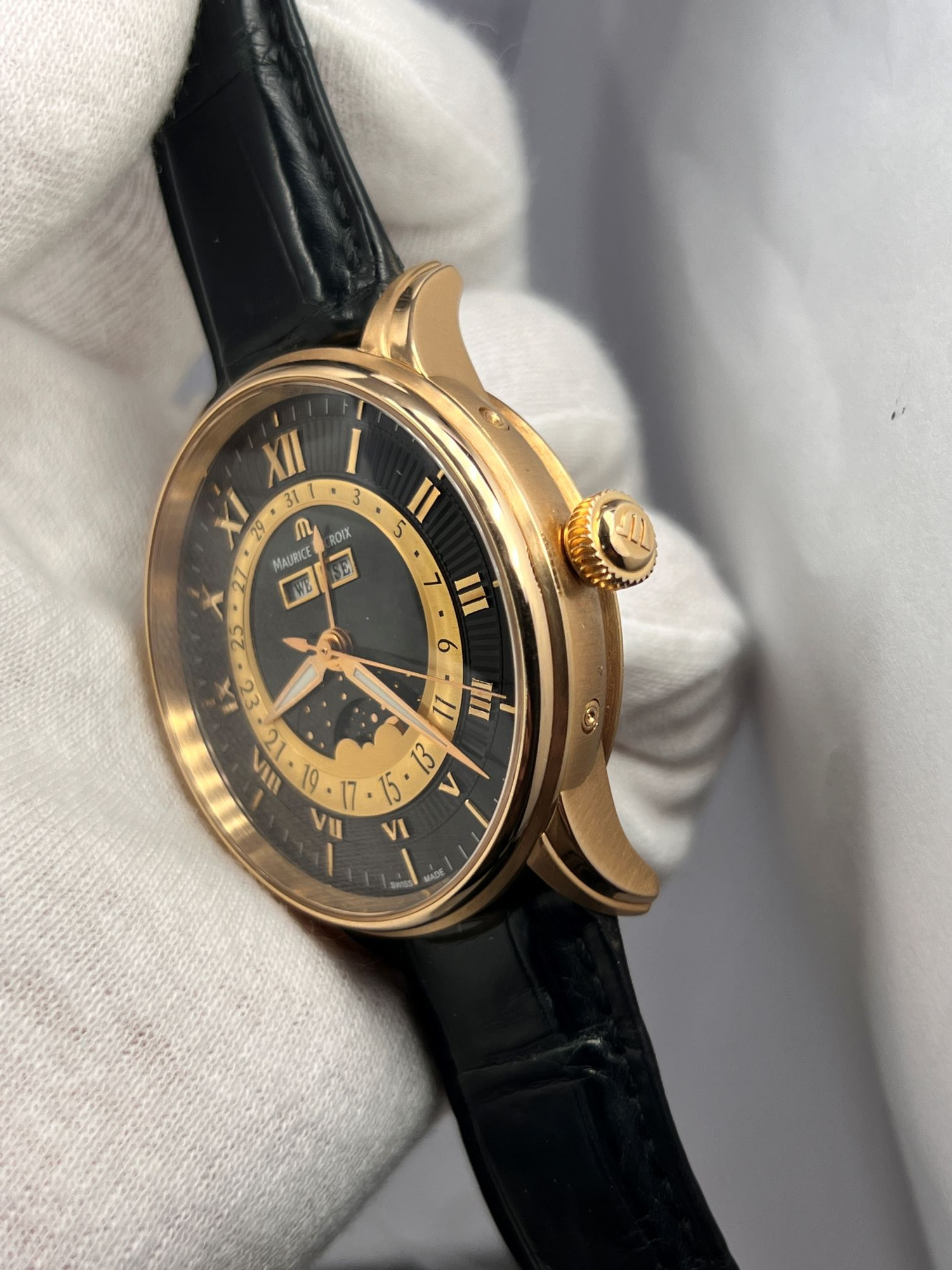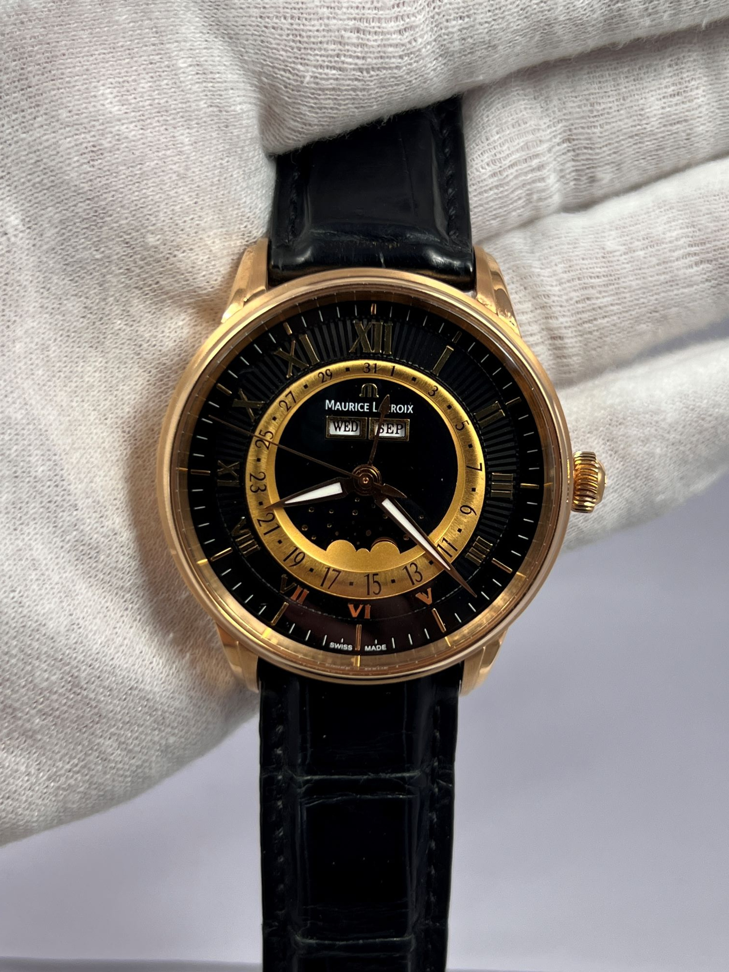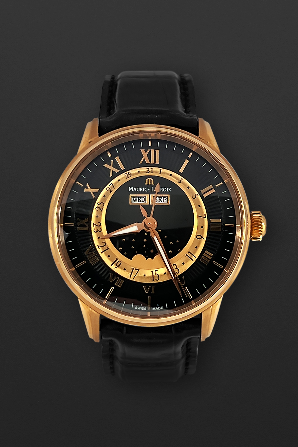 DialBlack dial with ‘sunrays’ relief pattern, signed ‘Maurice Lacroix’, applied ‘M’ logo at 12 o’clock, applied Roman numerals, ‘Alpha’ hour and minute hands, luminous, ‘stick’ central seconds hand, central hand showing a date on gold colored ring with Arabic numerals, moonphase at 6 o’clock, apertures of weekday and month at 12 o’clock