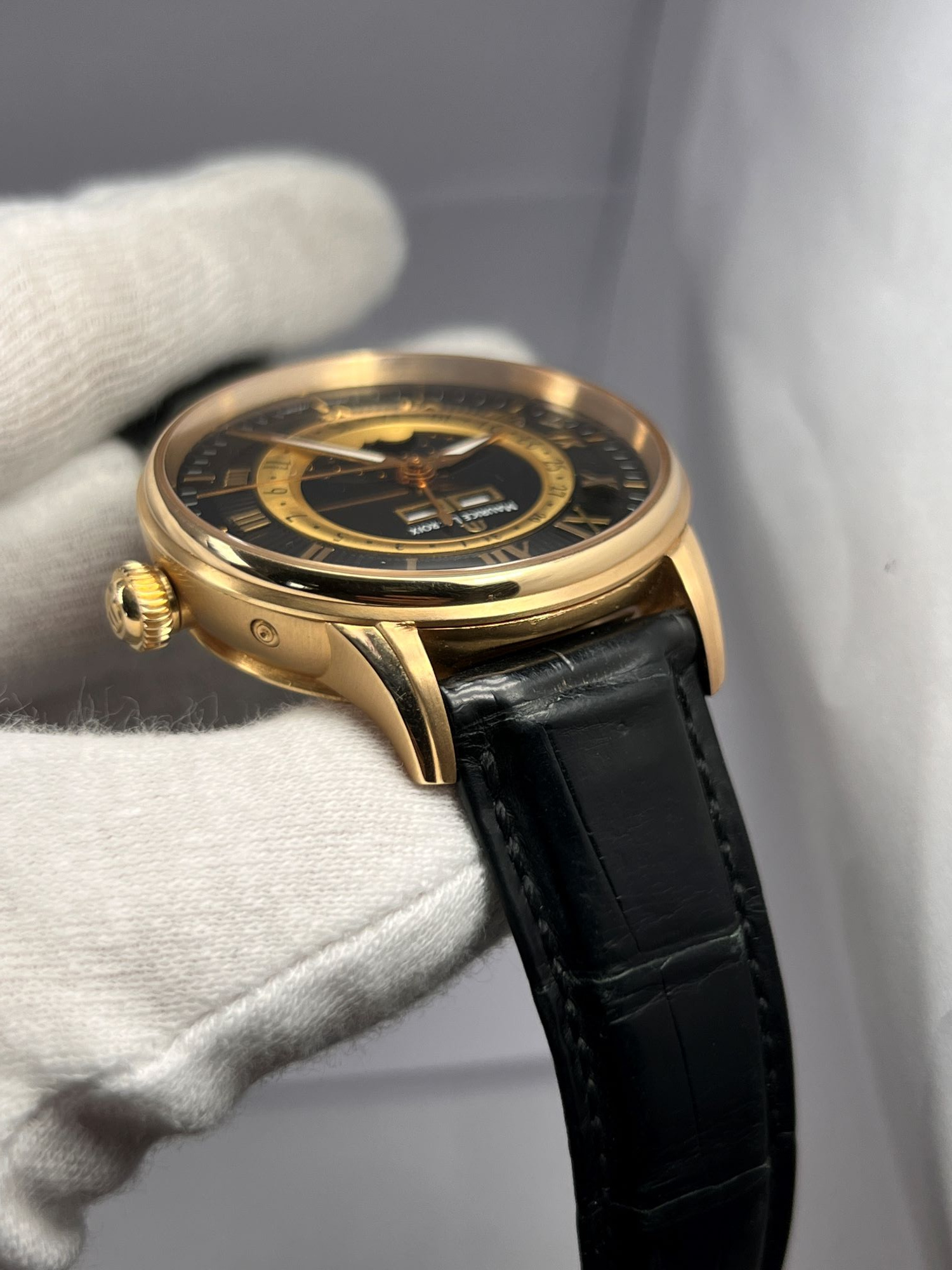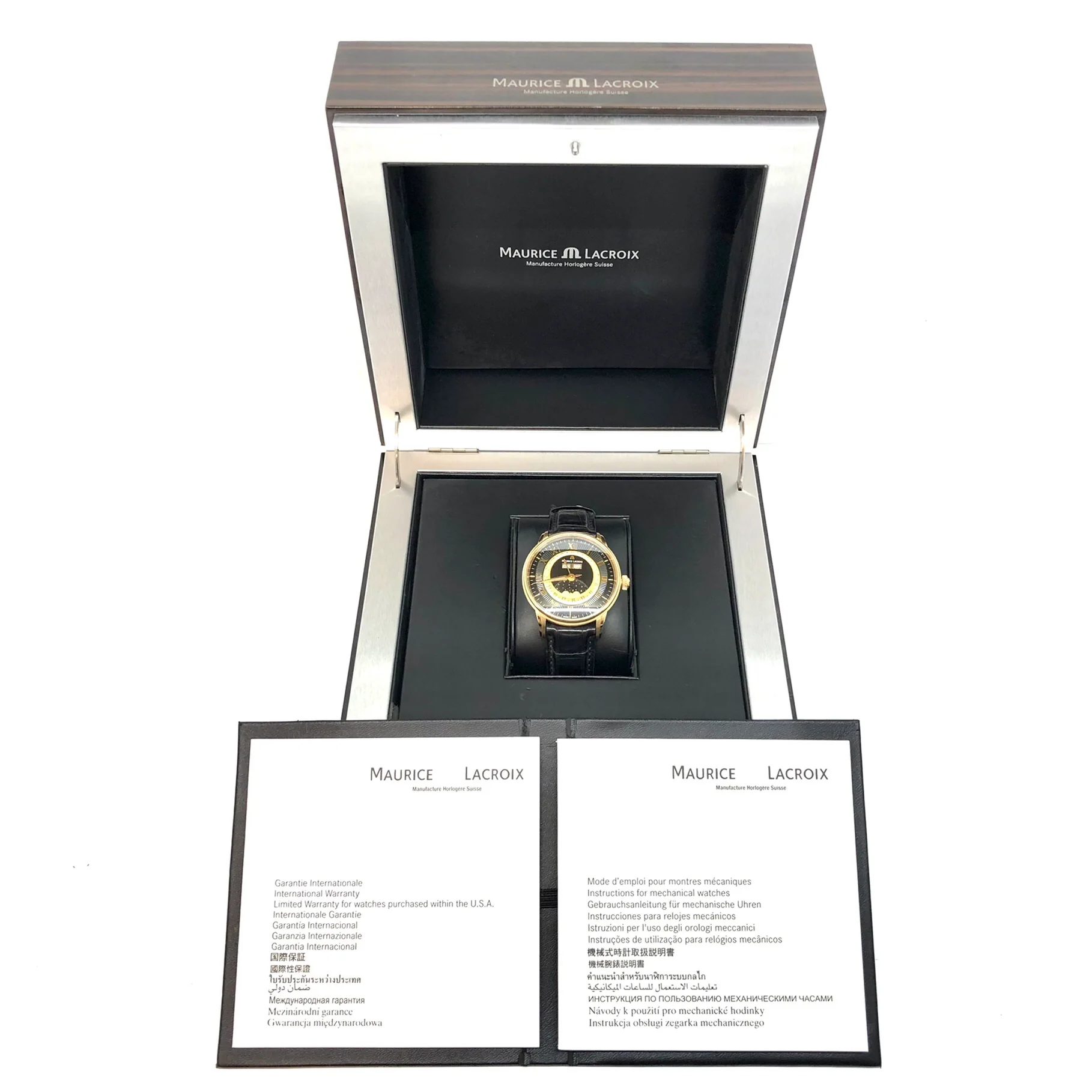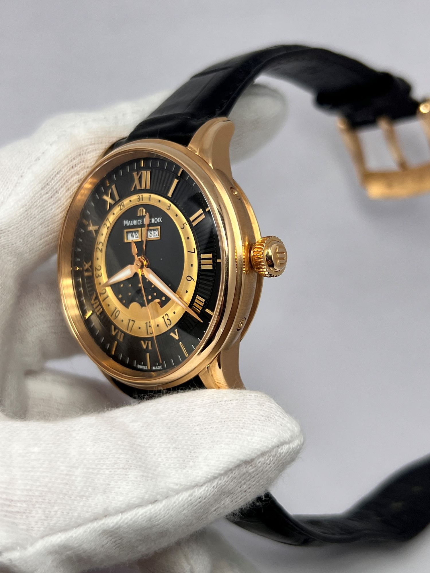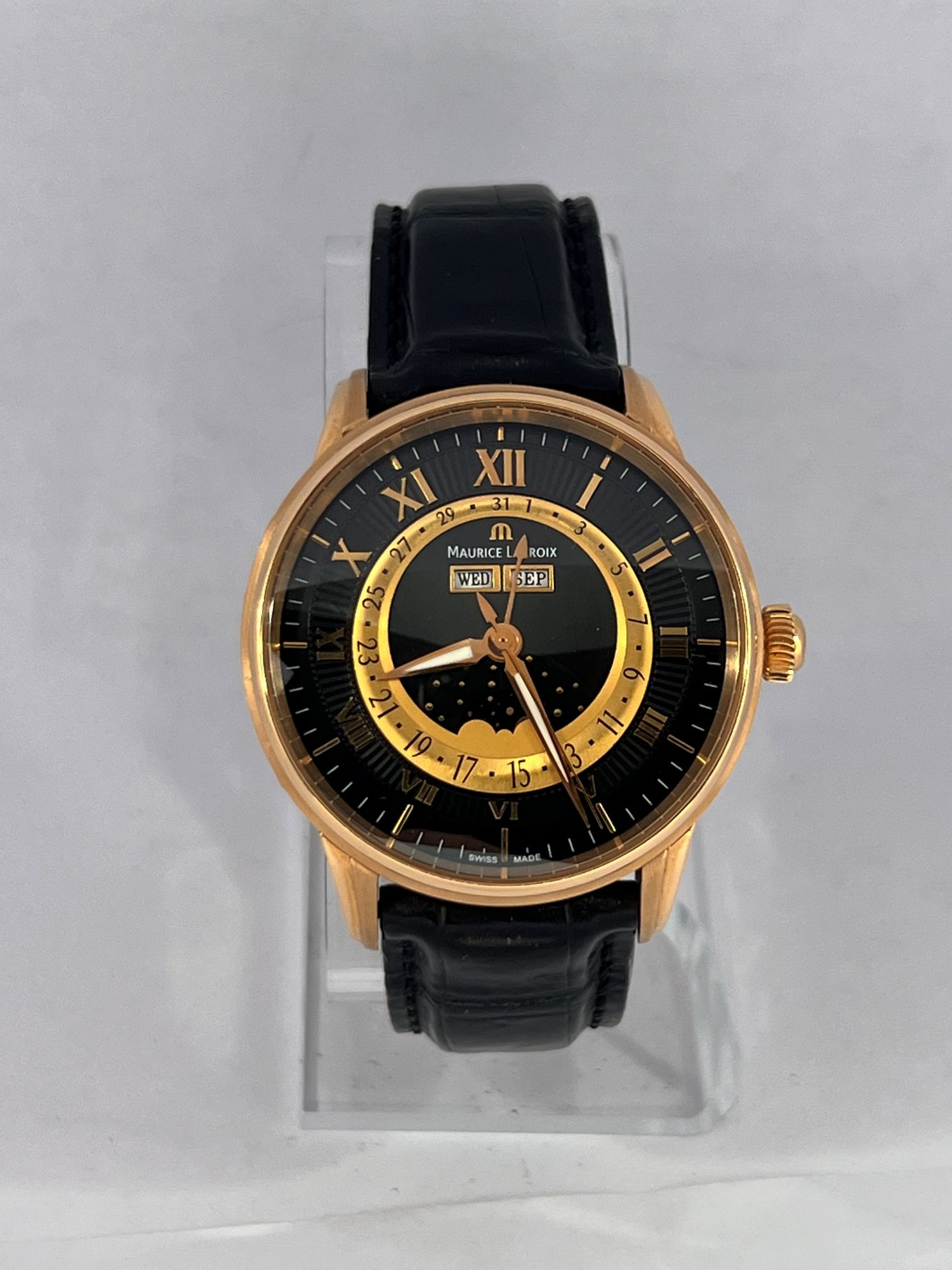 DialBlack dial with ‘sunrays’ relief pattern, signed ‘Maurice Lacroix’, applied ‘M’ logo at 12 o’clock, applied Roman numerals, ‘Alpha’ hour and minute hands, luminous, ‘stick’ central seconds hand, central hand showing a date on gold colored ring with Arabic numerals, moonphase at 6 o’clock, apertures of weekday and month at 12 o’clock