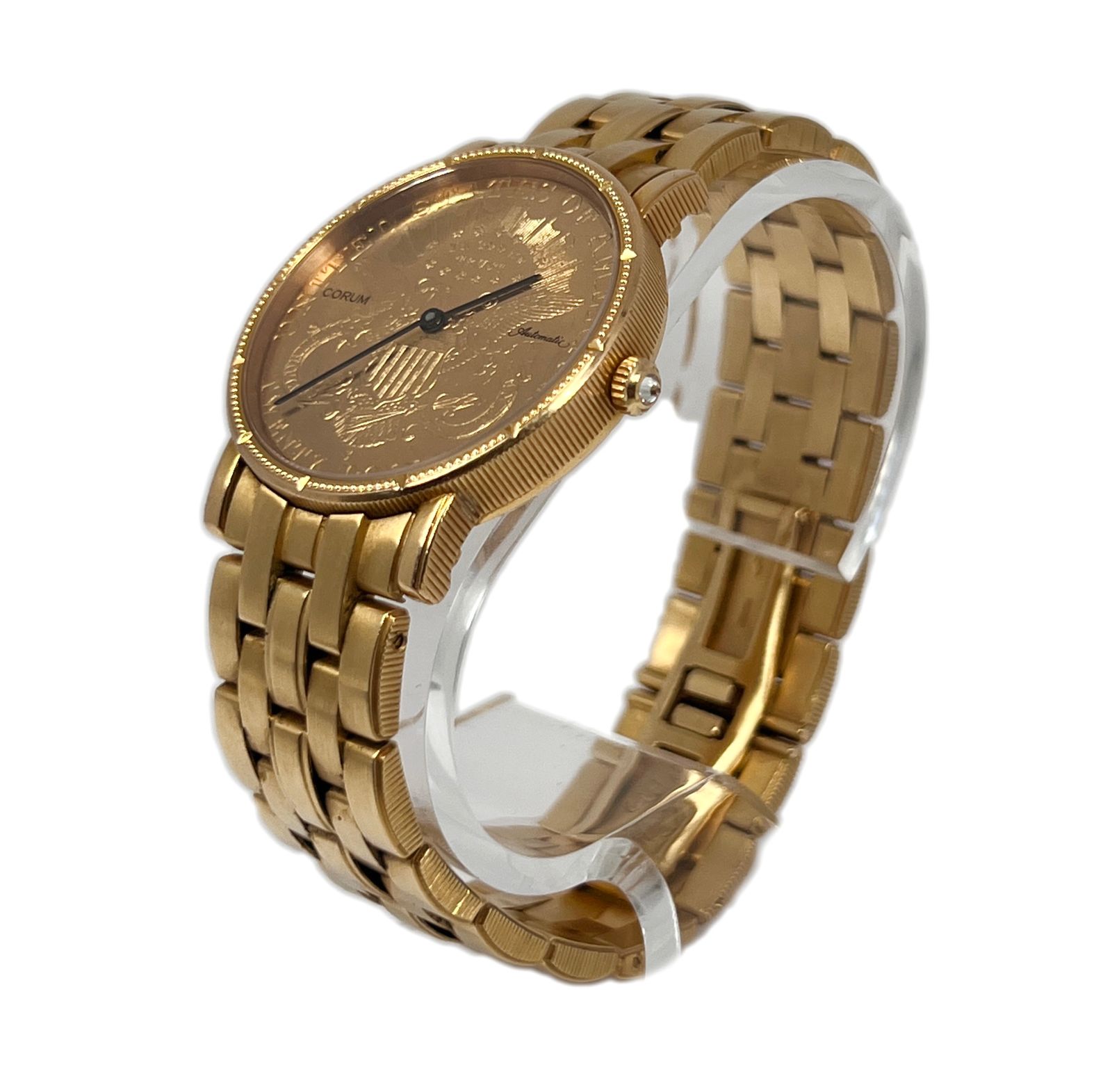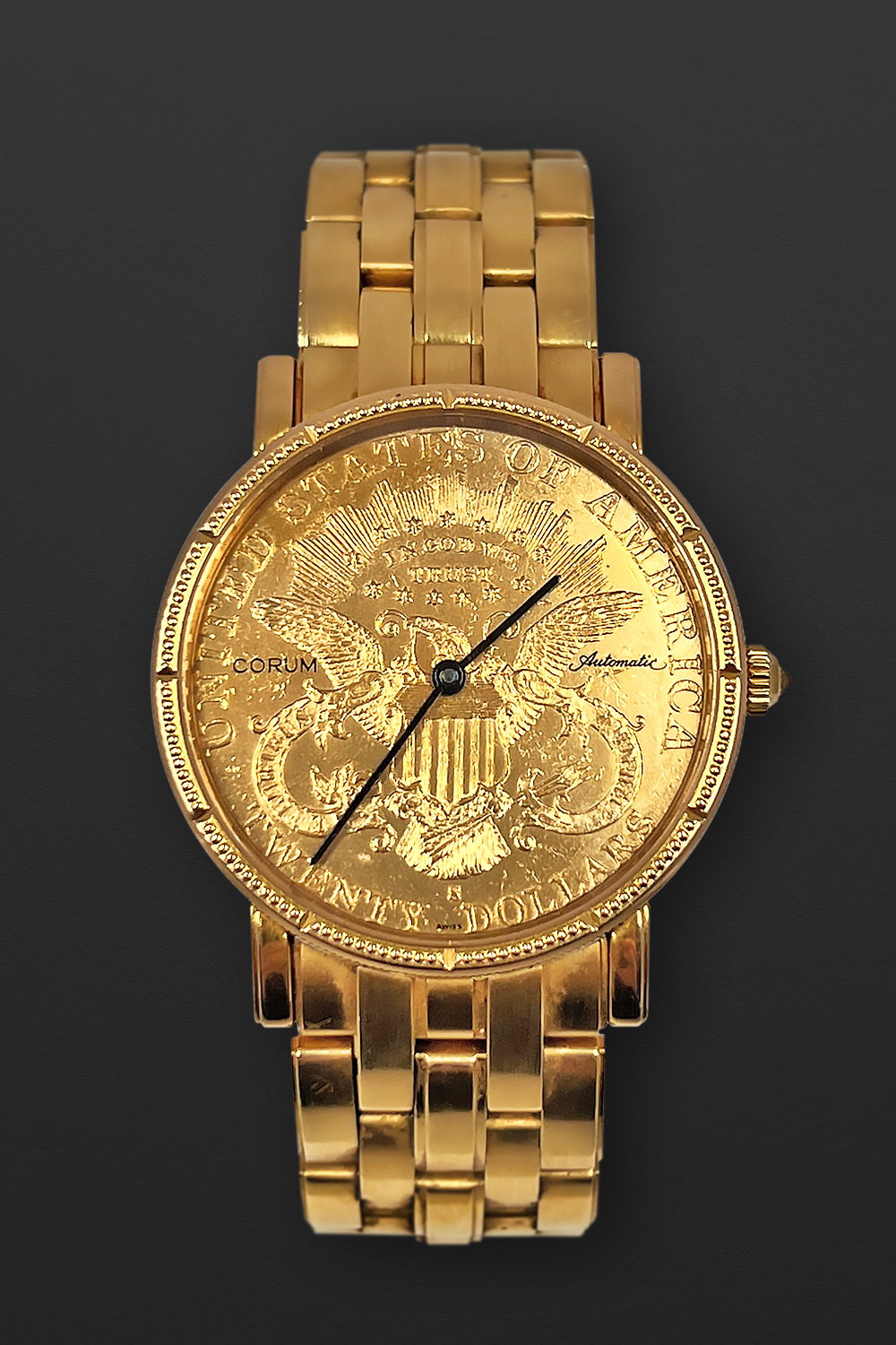 DialDial milled from solid-gold USA 20-dollar coin, signed ‘Corum Automatic’, black ‘stick’ hour and minute hands