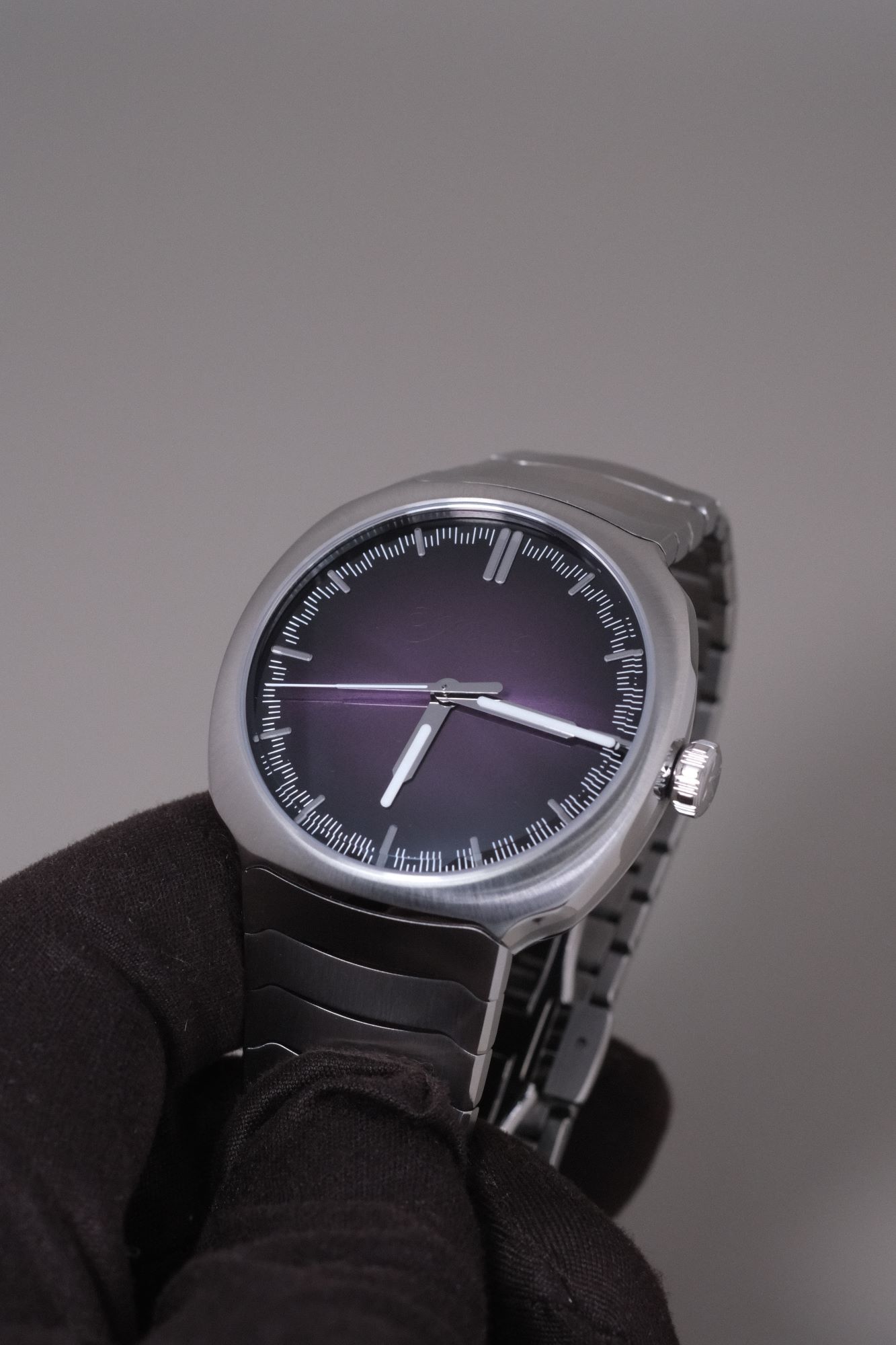 DialPurple gradient and sunburst dial, signed ‘H. Moser & Cie’ with transparent lacquer, H. Moser ‘double baguette’ hour and minute hands, luminous, ‘stick’ central seconds hand, luminous, applied baguette indexes, outer ‘racing’ seconds track