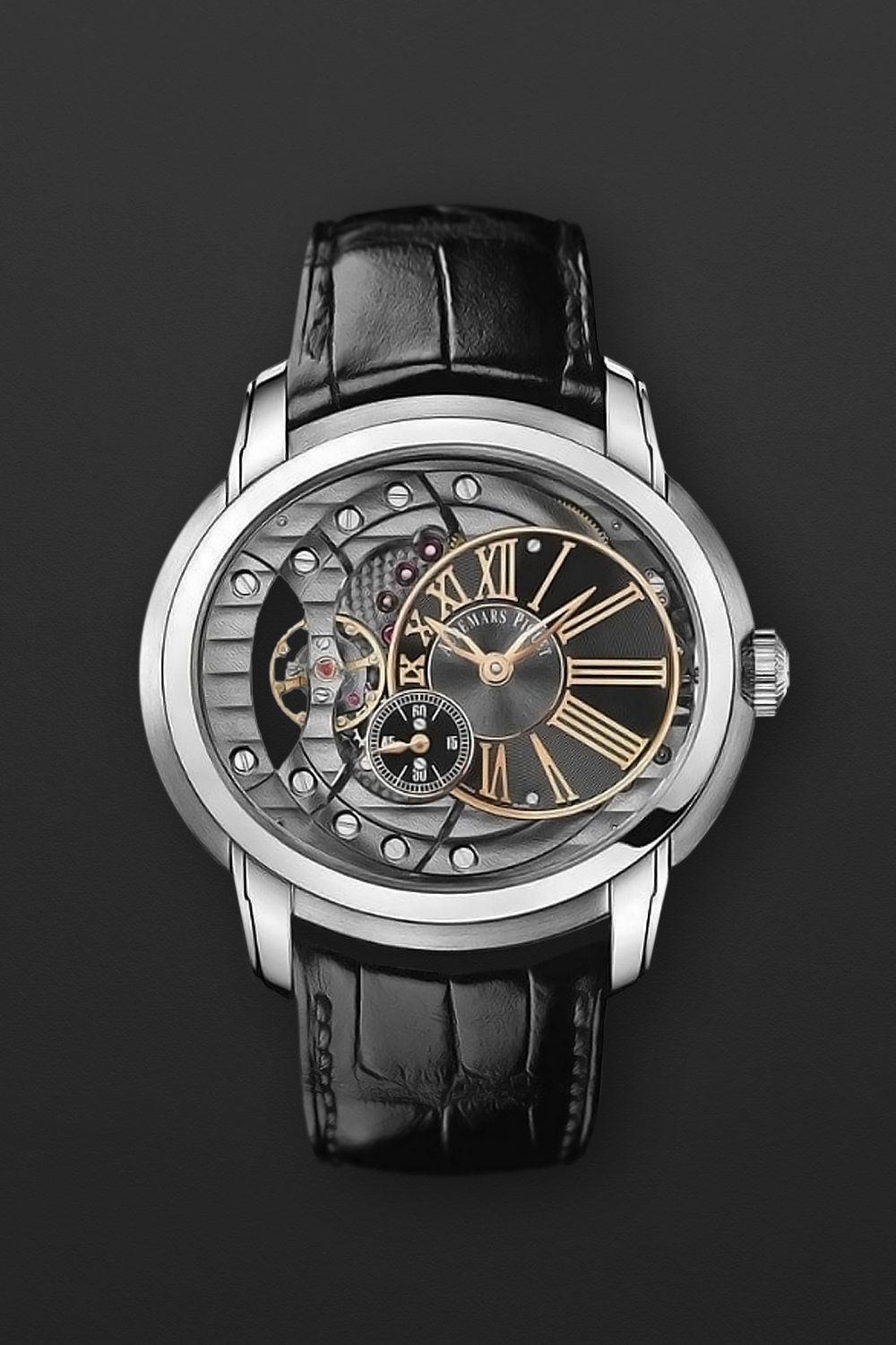 DialOpen-worked dial with visible balance and grey-coated bridges, signed Audemars Piguet, oval off-center chapter ring with rose gold colored outline, rose gold colored Roman numeral and luminous ‘sword’ hour and minute hands at 3 o’clock, small seconds at 8 o’clock