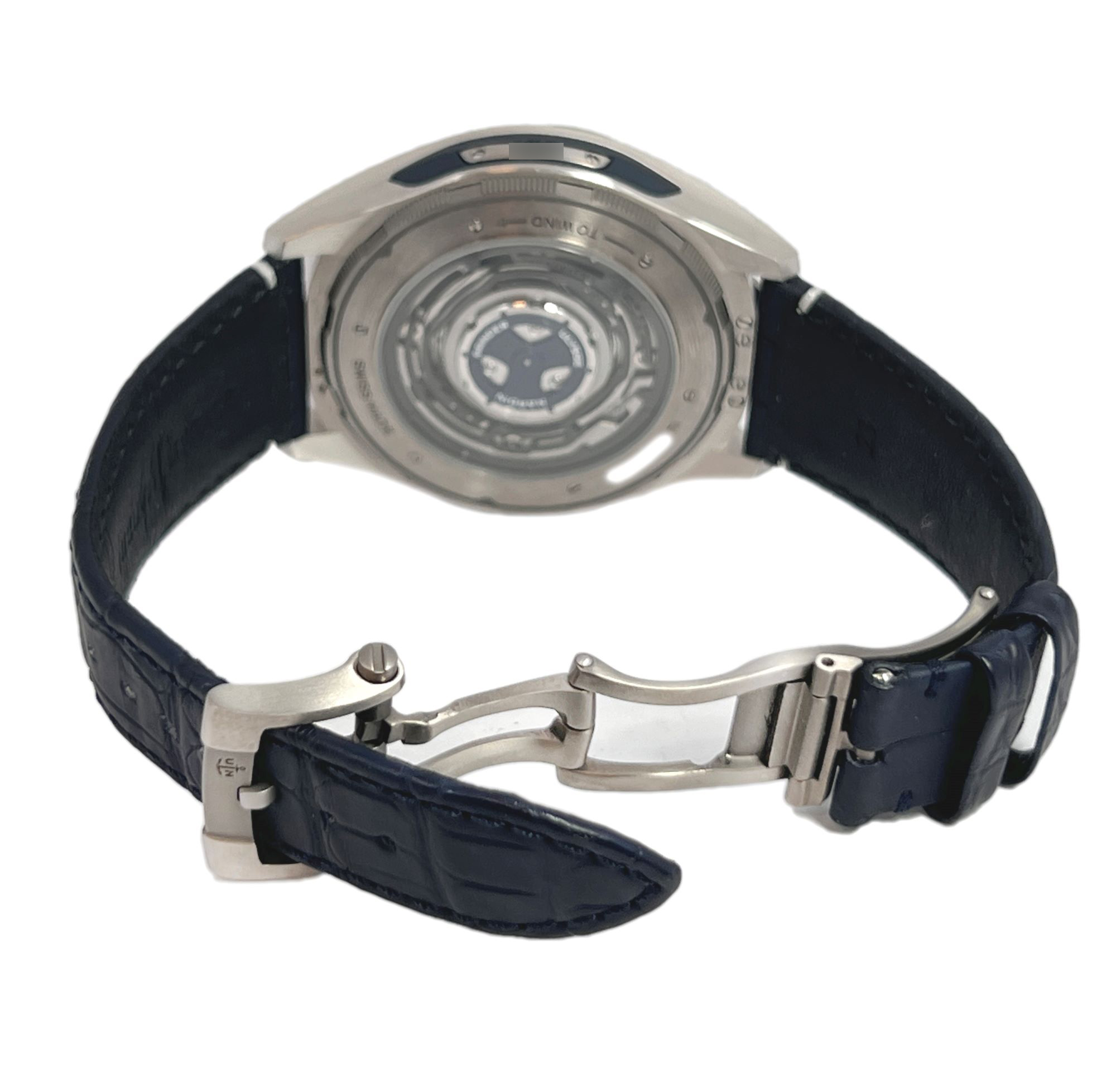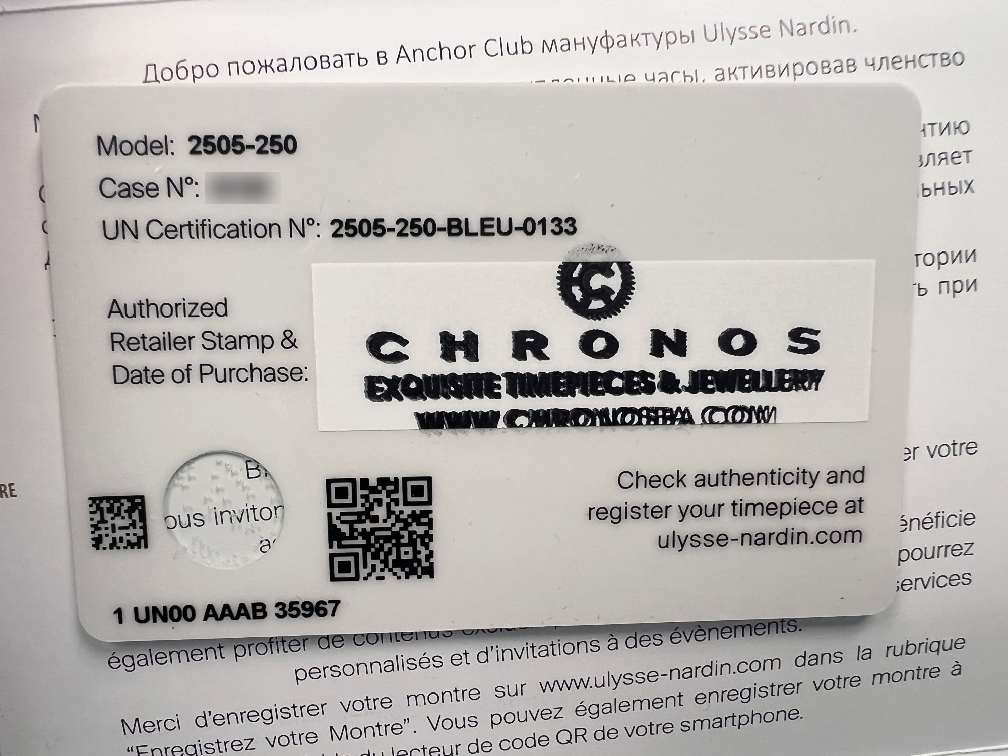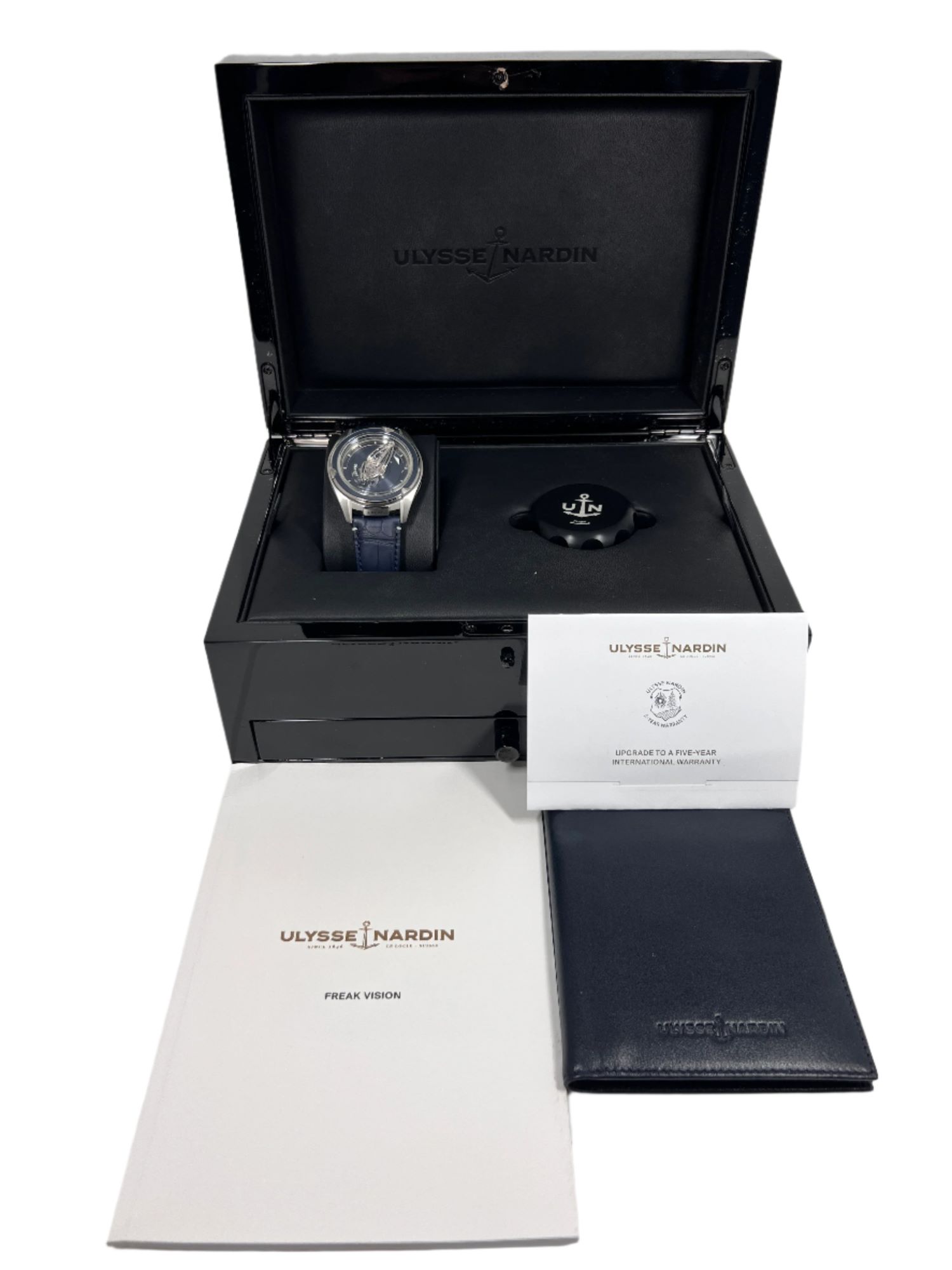 DialDark blue circularly brushed dial, signed with ‘Ulysse Nardin’ logo on a movement plate, exposed rotating movement parts acting as hour and minute hands, applied rectangular indexes