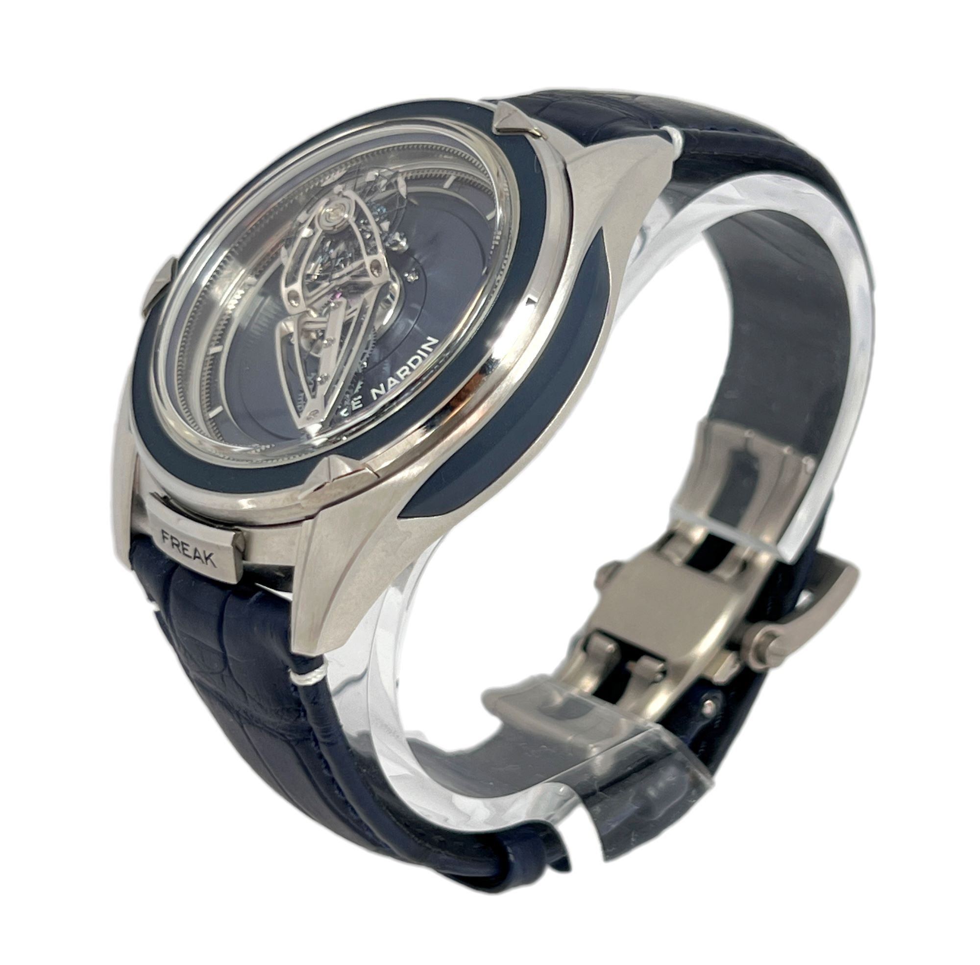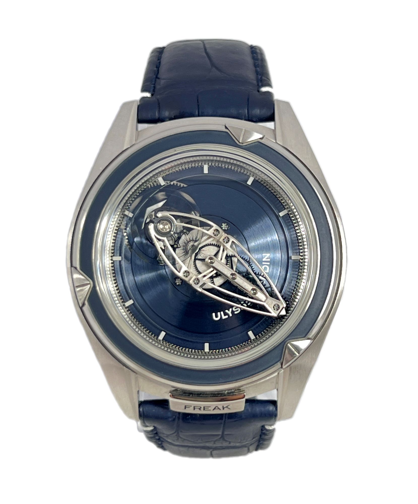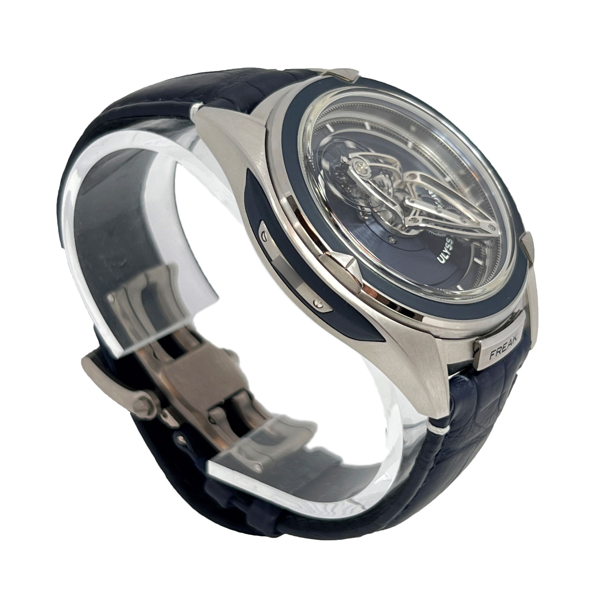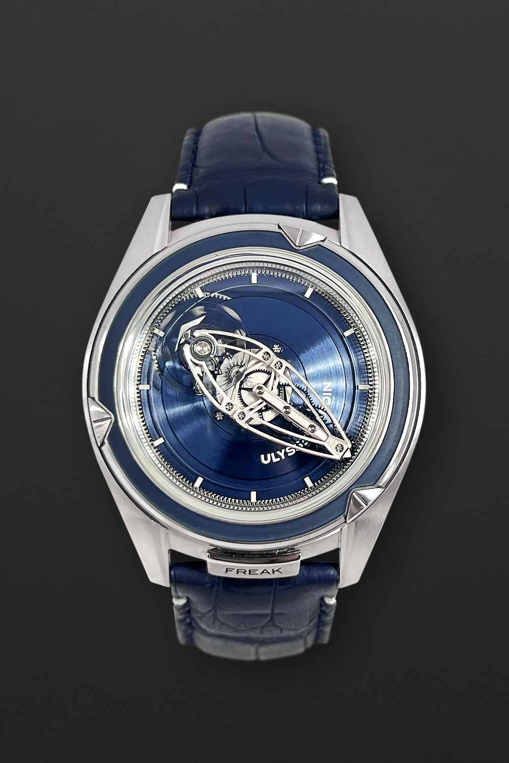 CaseRound case in platinum 950, rotating bezel in platinum 950, knurled, used to set the hands, with fixing lever at 6 o’clock, signed ‘Freak’, rotating exhibition caseback to wind the watch, plate with case number engraved fixed on 2 screws on caseband at 9 o’clock