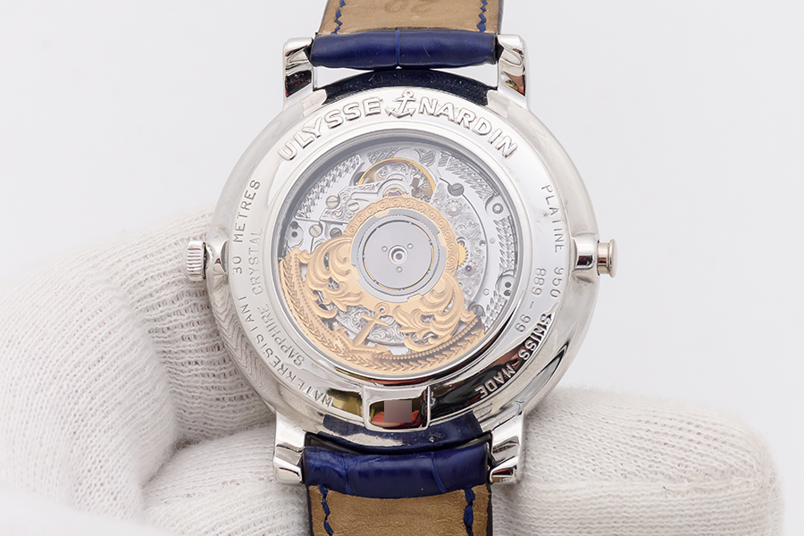 CaseRound case in platinum 950, polished, fixed bezel in platinum, polished, with applied Roman numerals at 3, 6, 9, sun symbol at 12, and Arabic numerals, all engraved and blue filled, snap-on exhibition caseback, with ‘Ulysse Nardin anchor’ logo, case and reference numbers engraved, winding crown at 3 o’clock, with ‘anchor’ symbol embossed, pusher in 18k white gold to set astronomic functions at 9 o’clock