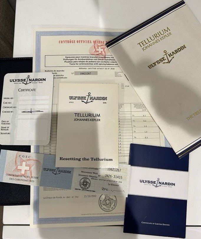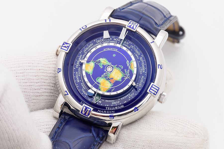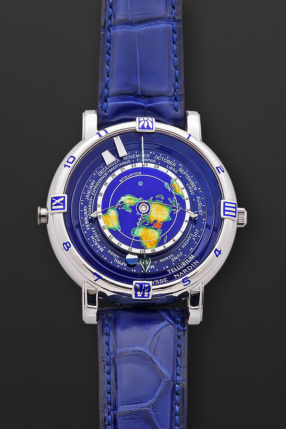 DialBlue dial, signed ‘Ulysse Nardin Tellurium’, peripheral white ‘trapeze’ hour and minute hands, white and blue peripheral Moon hand, green peripheral Dragon hand, peripheral ring with calendar and zodiac markings, raised central disc with Northern hemisphere depicted by cloisonne enamel technique and flexible terminator indicator