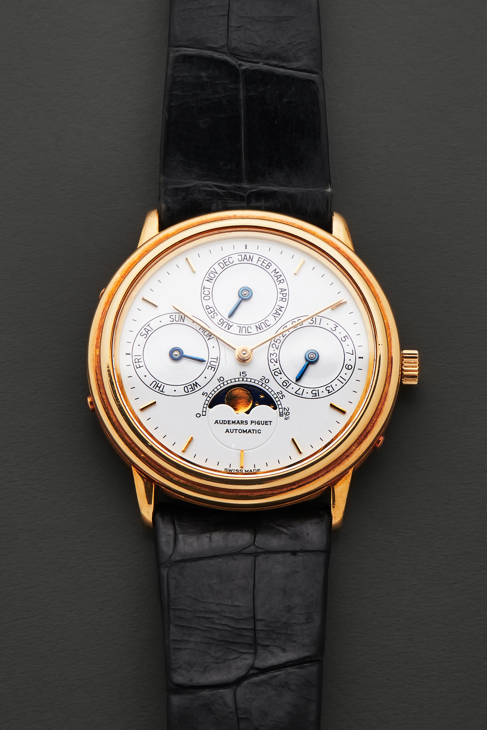 DialWhite dial with applied indices in yellow gold, yellow gold hands, month at 12 o'clock, date at 3 o'clock, moonphase at 6 o'clock, day at 9 o'clock, signed 'Audemars Piguet' at 6 o'clock