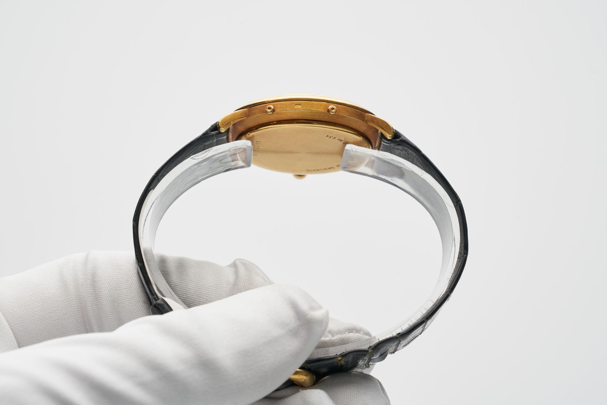 CaseRound case in 18k yellow gold with calendar setting pushers at 4, 8, and 10 o'clock, crown at 3 o'clock