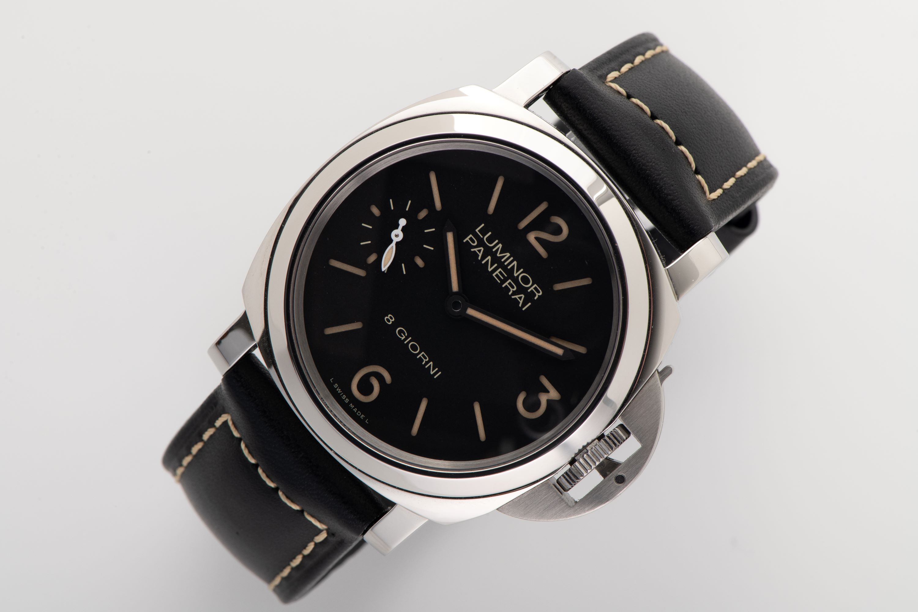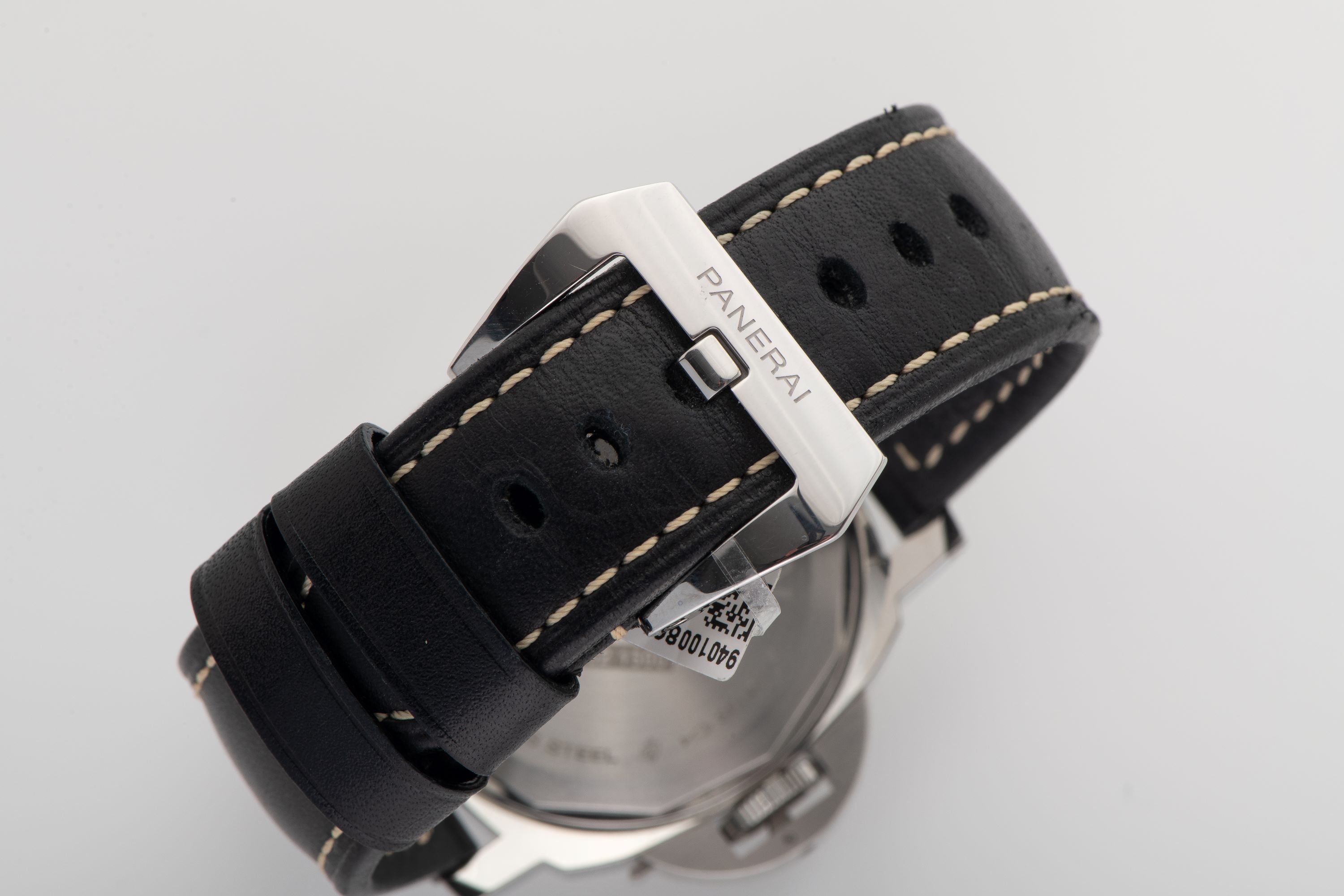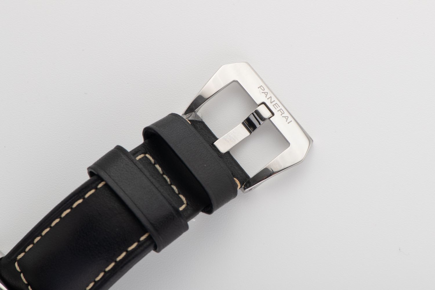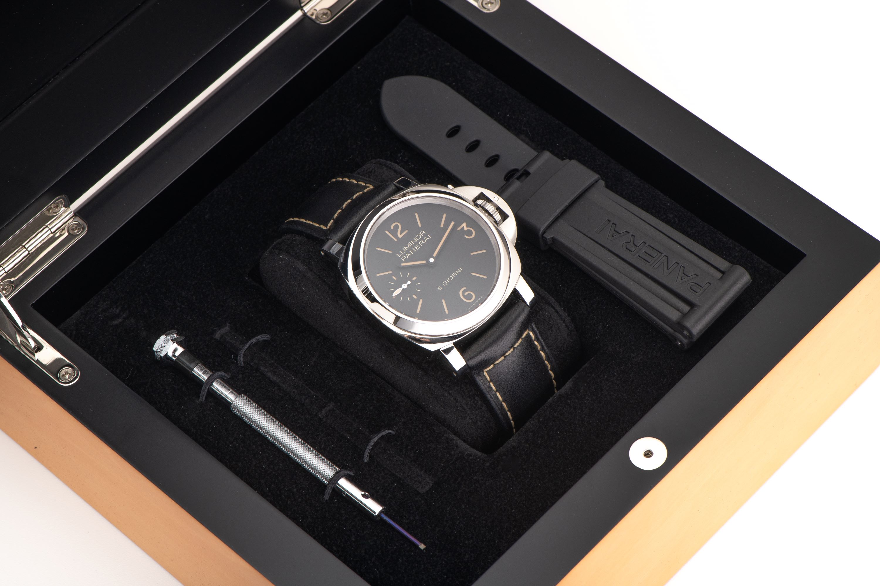DialMatte black sandwich dial with fauxtina luminous numerals and hands, small seconds at 9 o'clock, signed 'Luminor Panerai' at 12 o'clock