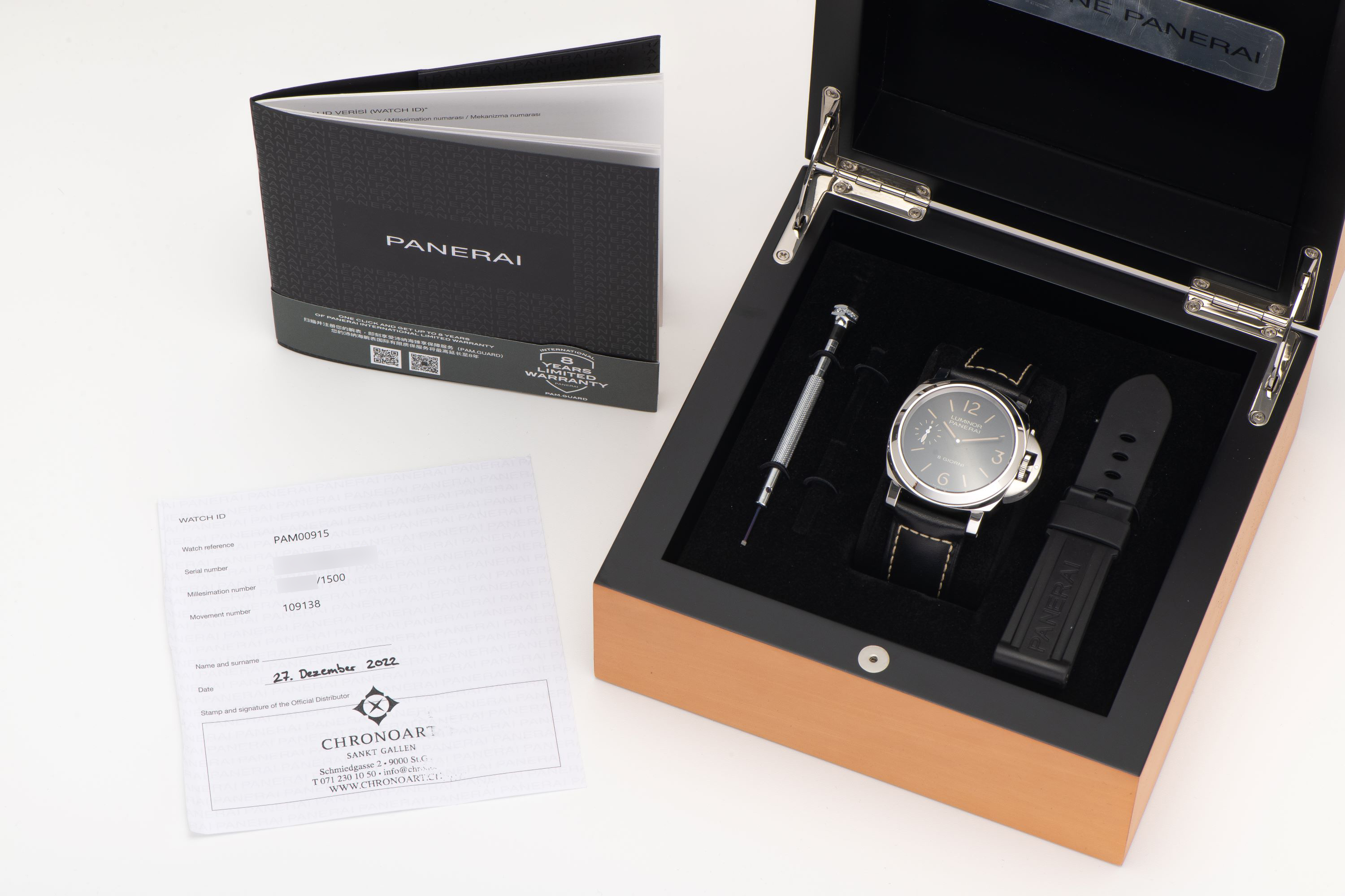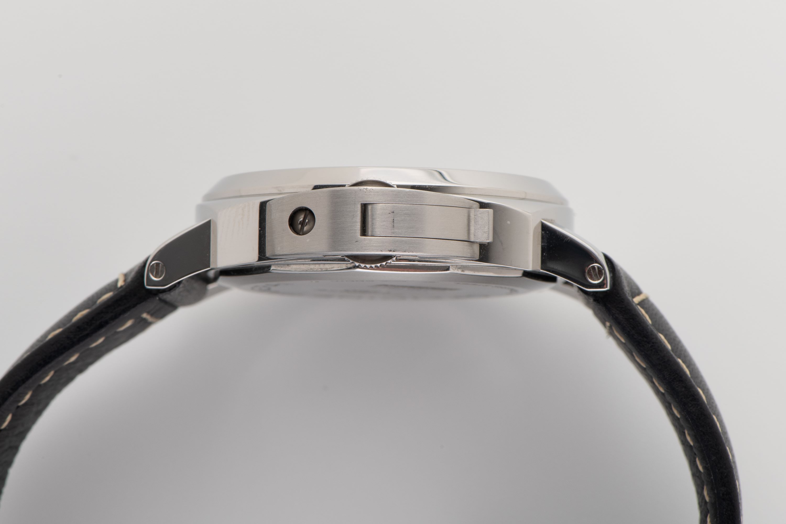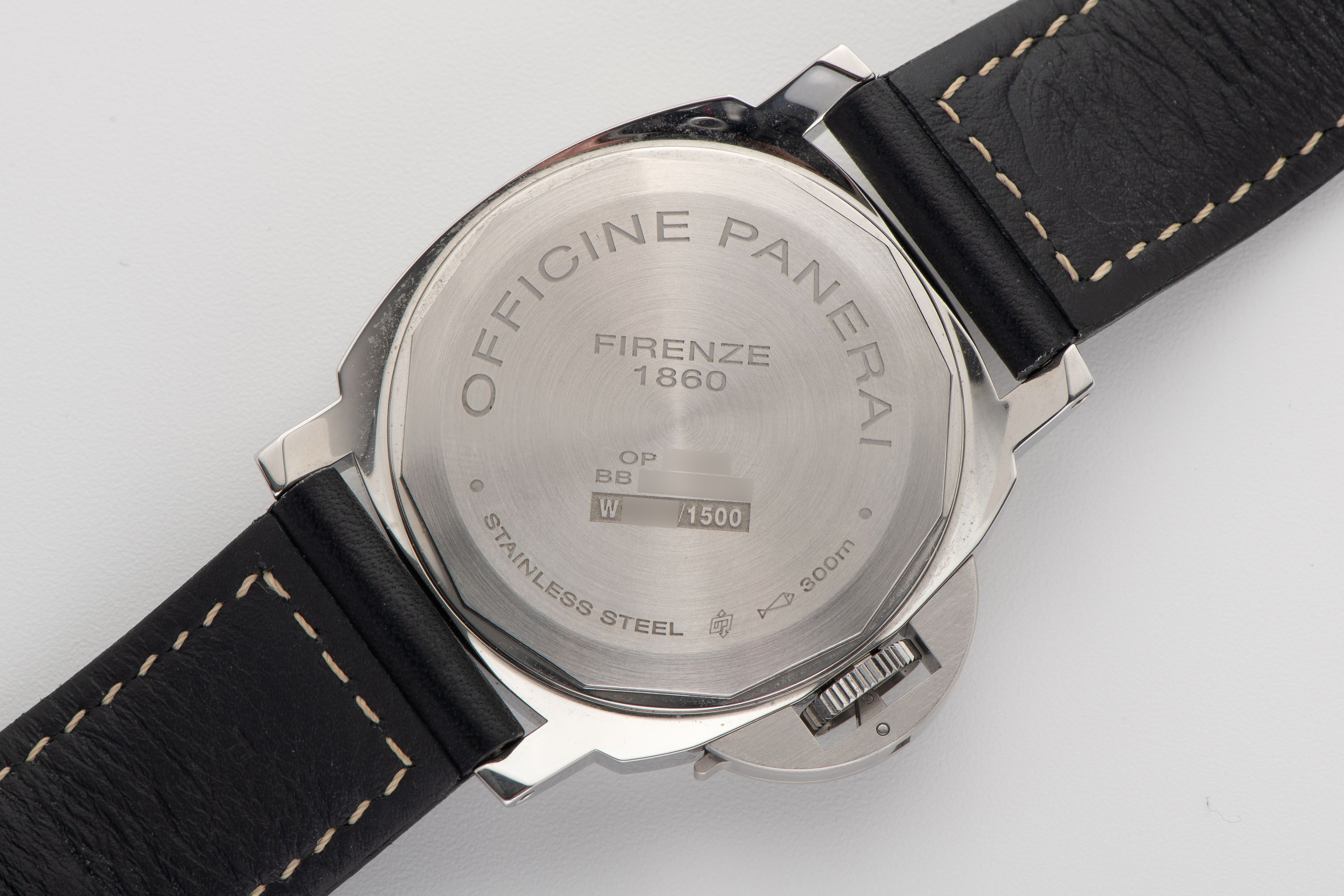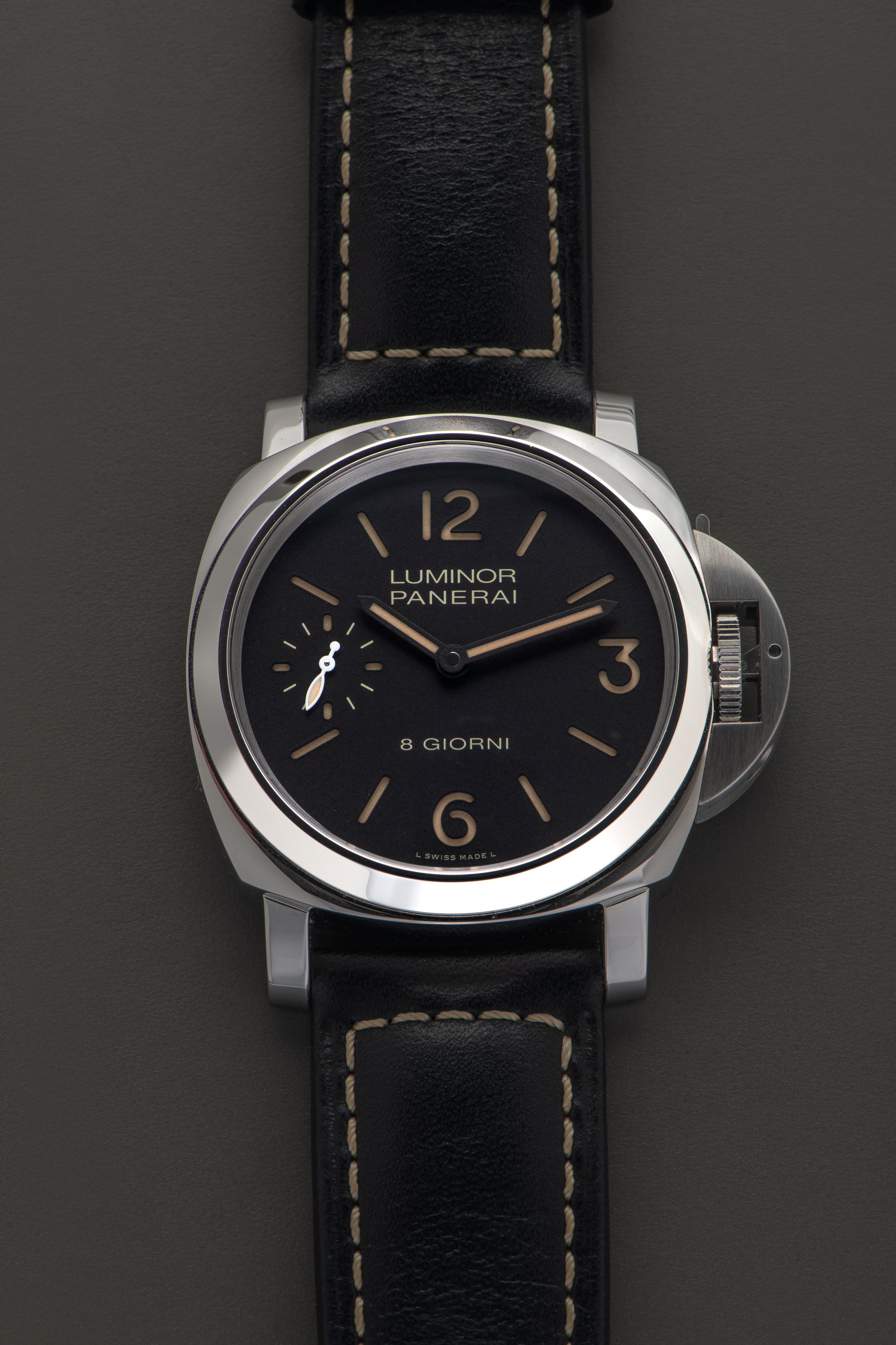 DialMatte black sandwich dial with fauxtina luminous numerals and hands, small seconds at 9 o'clock, signed 'Luminor Panerai' at 12 o'clock