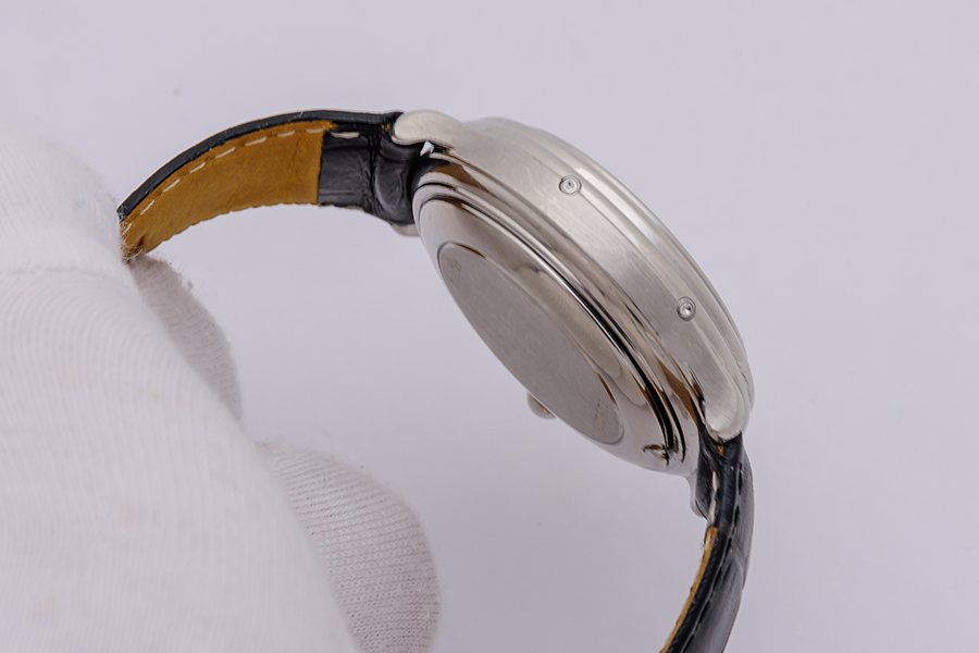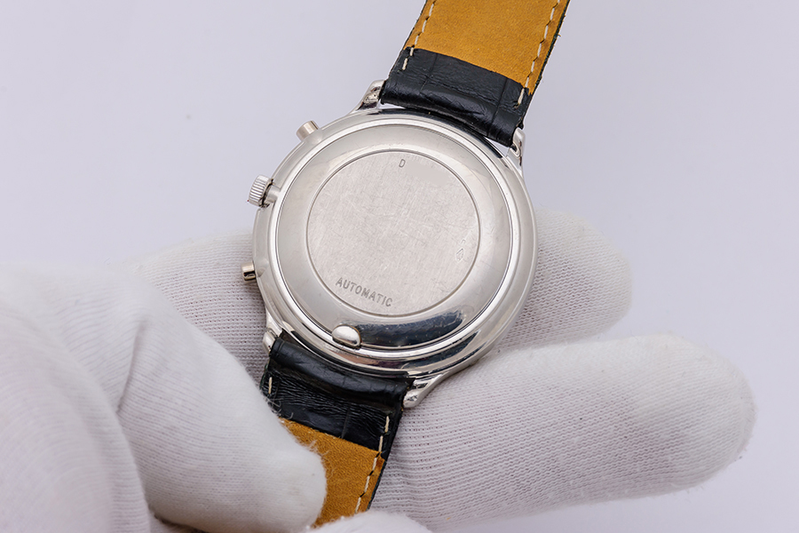 CaseRound case in platinum 950, polished, fixed bezel in platinum 950, polished, with Audemars Piguet logo at 12 o’clock, solid platinum 950 snap-on caseback, brushed and polished, with ‘Automatic’ and case number stamped, winding crown at 3 o’clock, ‘pump’ chrono pushers at 2 and 4 o’clock