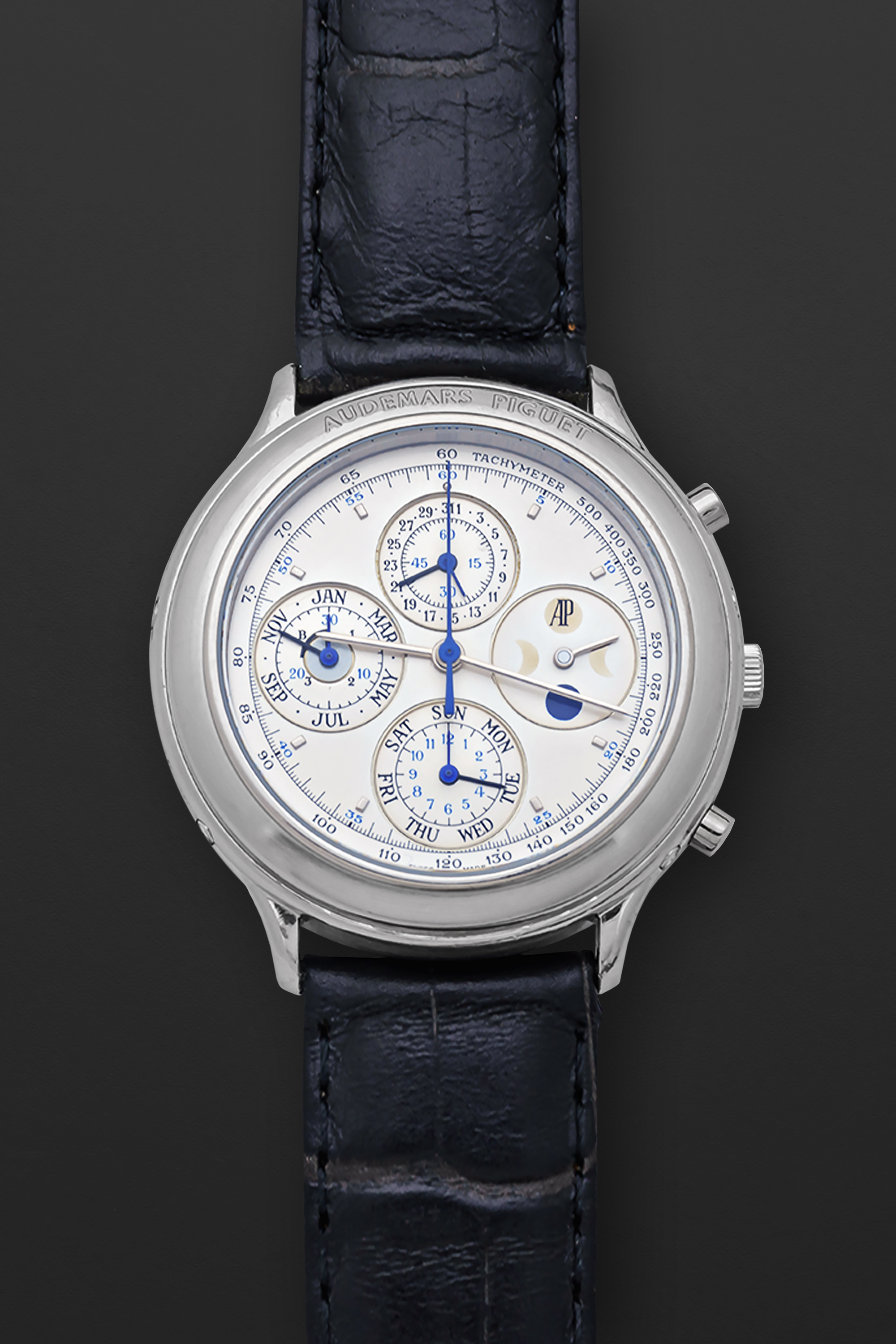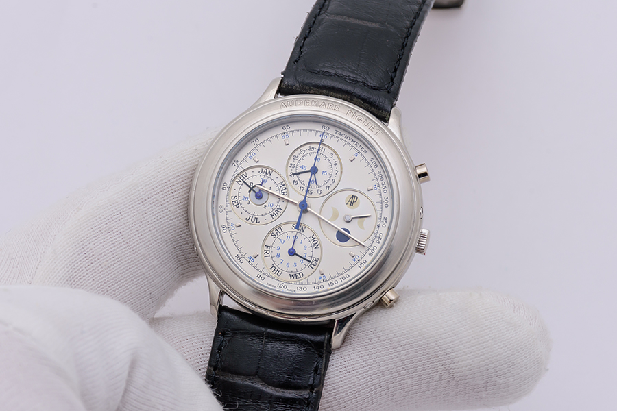 DialSilvered dial, ‘AP’ logo on moonphase sub-dial at 3 o’clock, ‘stick’ hour and minute hands, blued ‘stick’ central chrono seconds hand, applied faceted rectangle indexes, recessed sub-dials for small seconds and date at 12 o’clock, 30-minute counter, month and leap year at 9 o’clock, 12-hour counter and day of the week at 6 o’clock, outer tachymeter scale