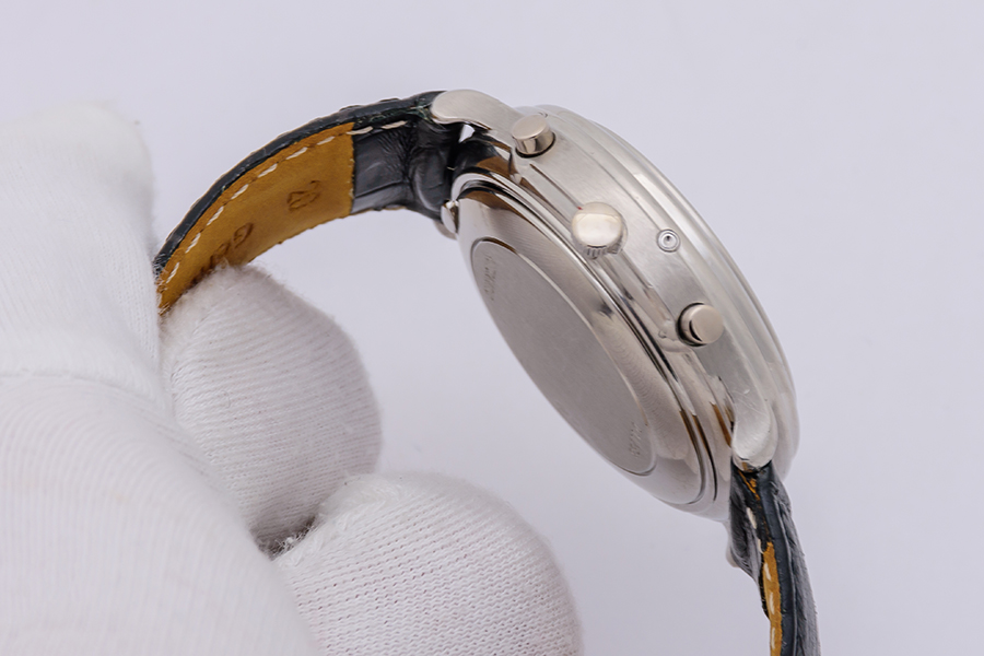 MovementSelf-winding mechanical movement, rhodium-coated, chronograph mechanism, bridges with Cotes de Geneve, mainplate with perlage, engraved and gilt inscriptions, functions: hours, minutes, seconds, moonphase, chronograph with central chrono seconds hand ,30-minute and 12-hour counters, perpetual calendar with date, day of the week, month and leap year