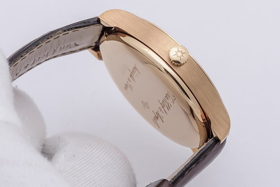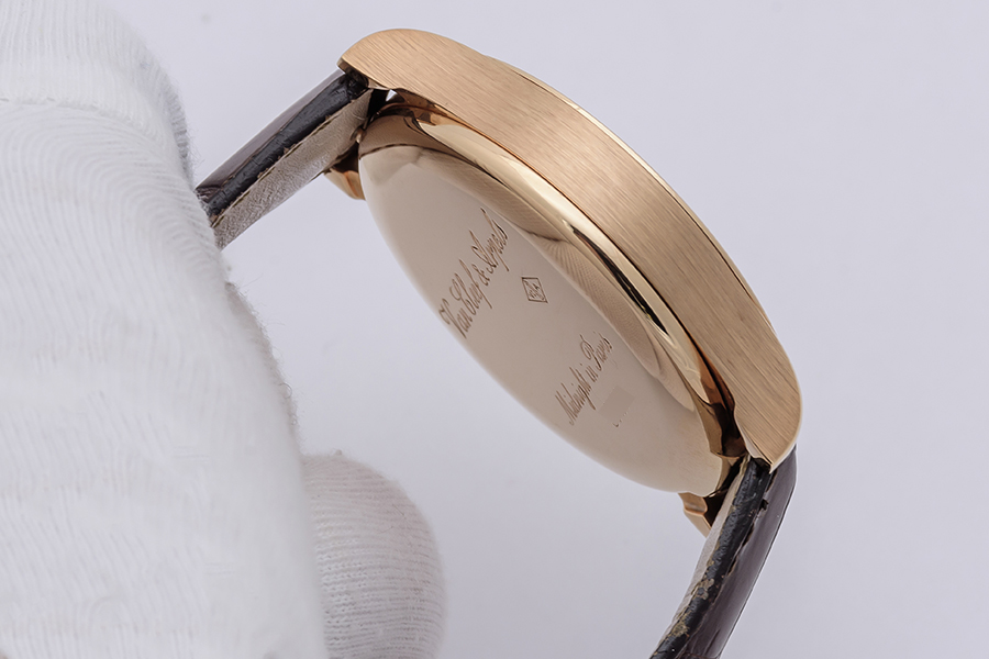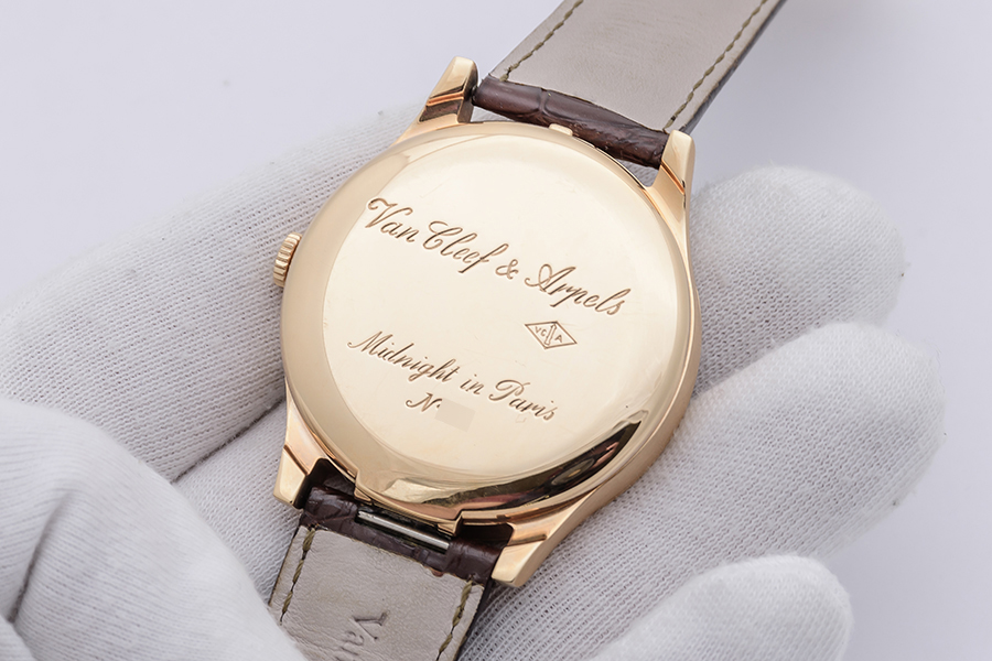 CaseRound case in 18k rose gold, polished and brushed, fixed bezel in 18k rose gold, polished, snap-on solid gold caseback with ‘Van Cleef & Arpels Midnight in Paris’, ‘VCA’ logo and case number engraved, winding crown at 3 o’clock with ‘sun’ emblem engraved