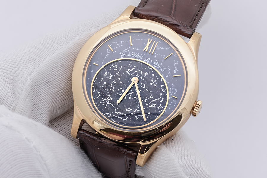 DialMatt crystal dial forming a horizon oval opening for a star map, signed ‘Van Cleef & Arpels’ with applied ‘stick’ indexes and XII Roman numeral, thin ‘obelisk’ hour and minute hands, rotating blue aventurine disk with starry sky map over Paris