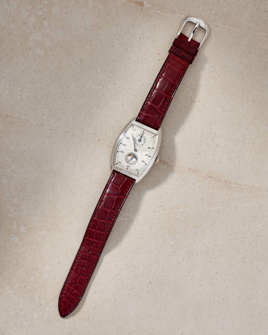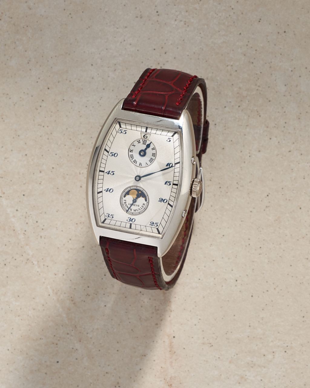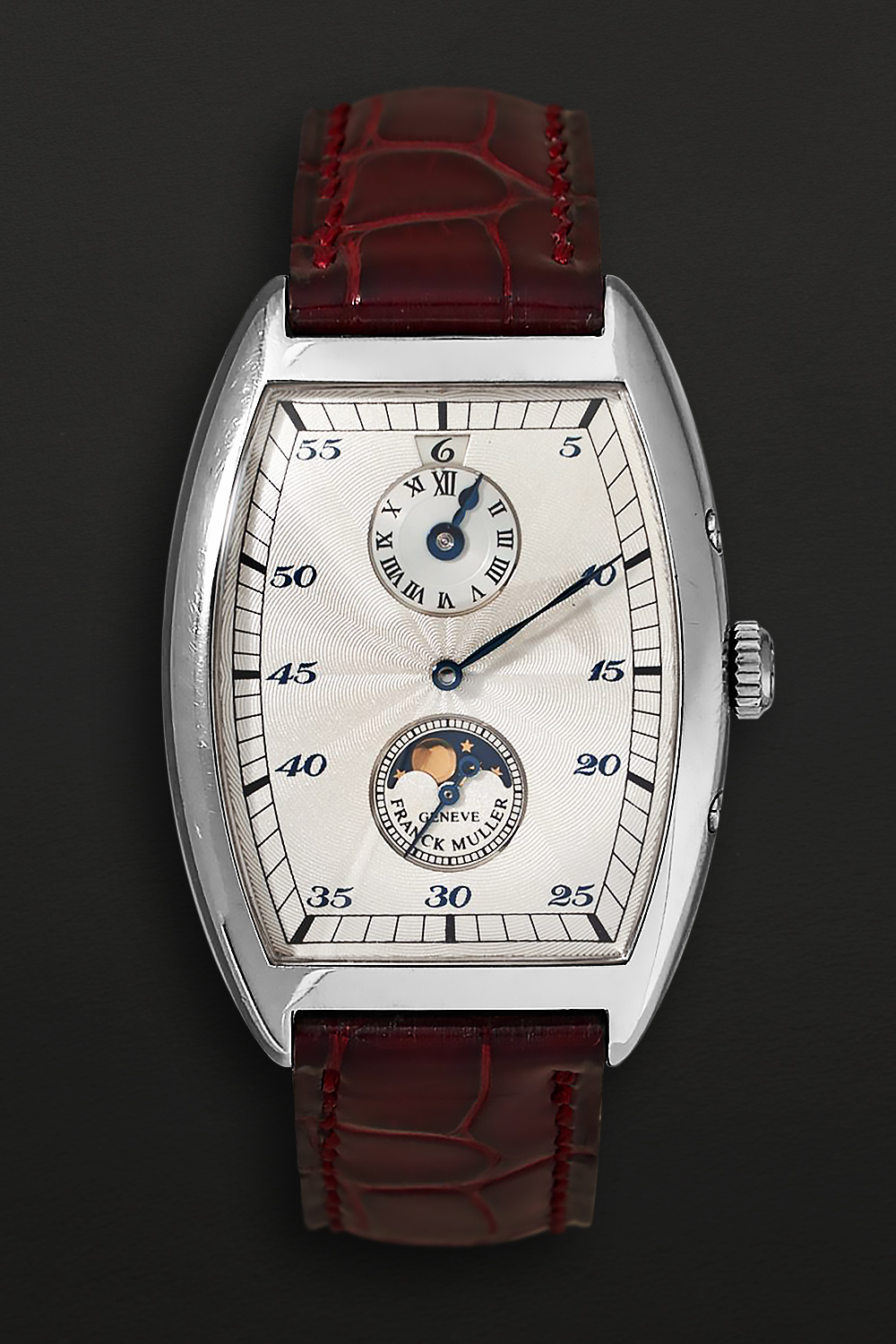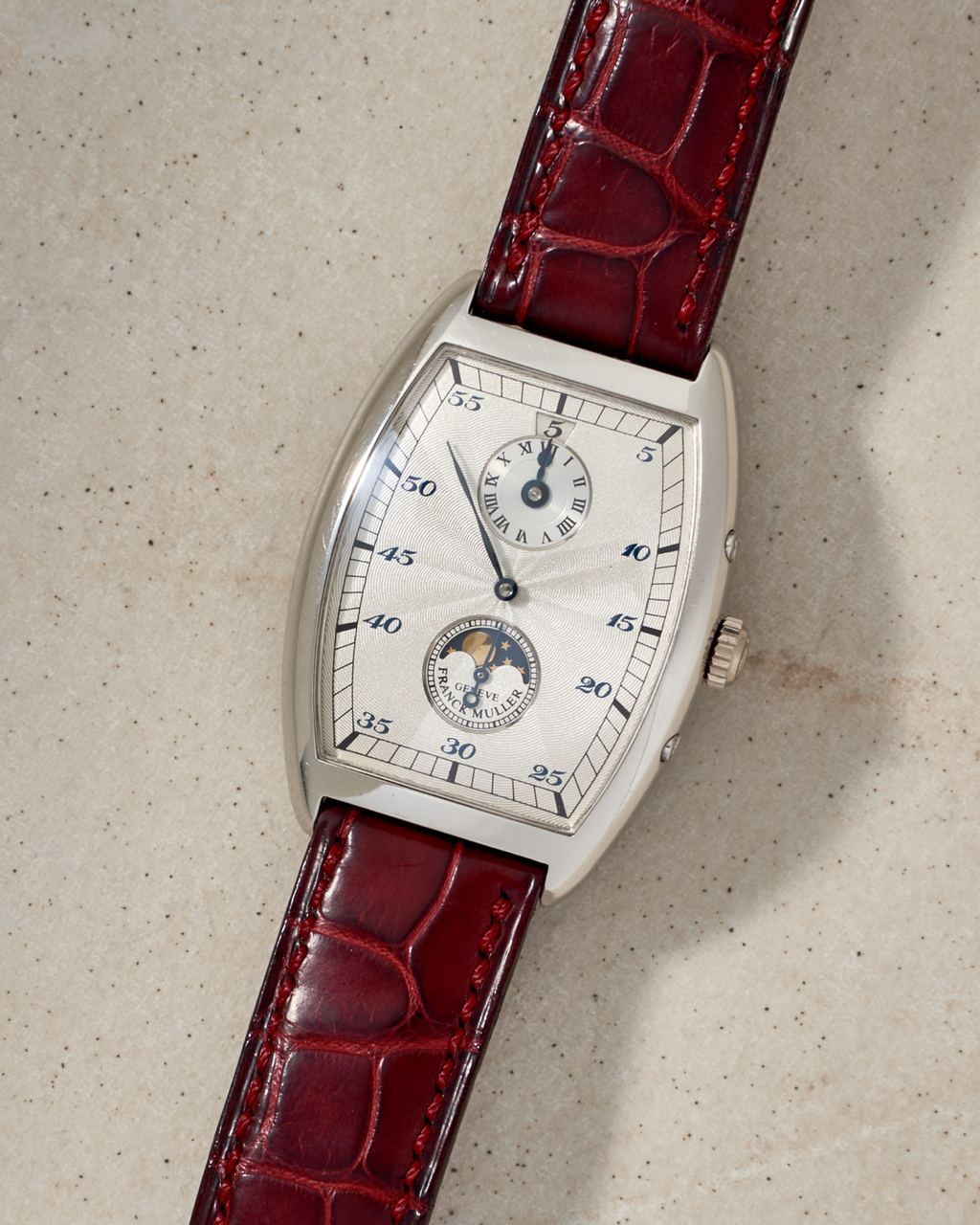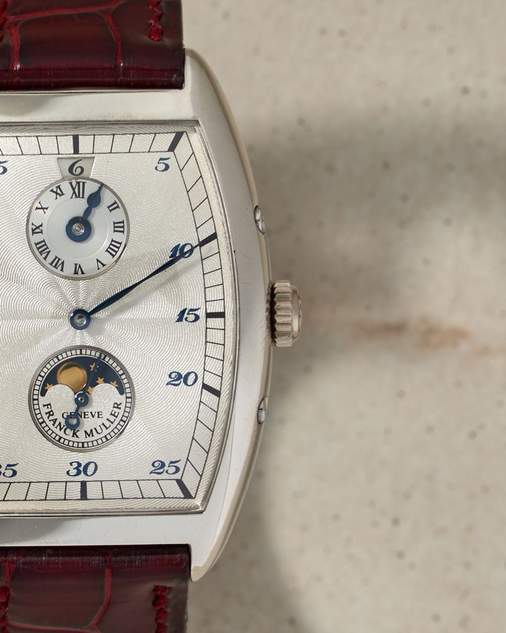 DialWhite silvered ‘regulator’ dial with ‘lotus’ guilloche motif, signed ‘Franck Muller Geneve’, blue ‘spade and whip’ hour and minute hands with hours at 6 o’clock, central minutes and small seconds hand and moonphase at 6 o’clock, ‘jumping’ digital hour indicator of second time zone in apertures at 12 o’clock, ’railway’ minute track with blue Arabic numerals