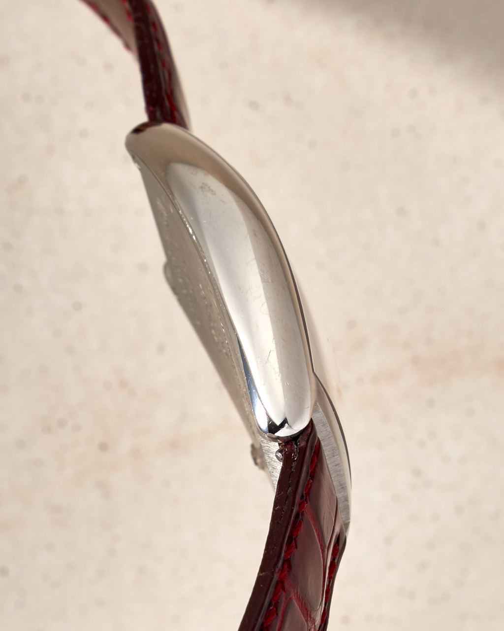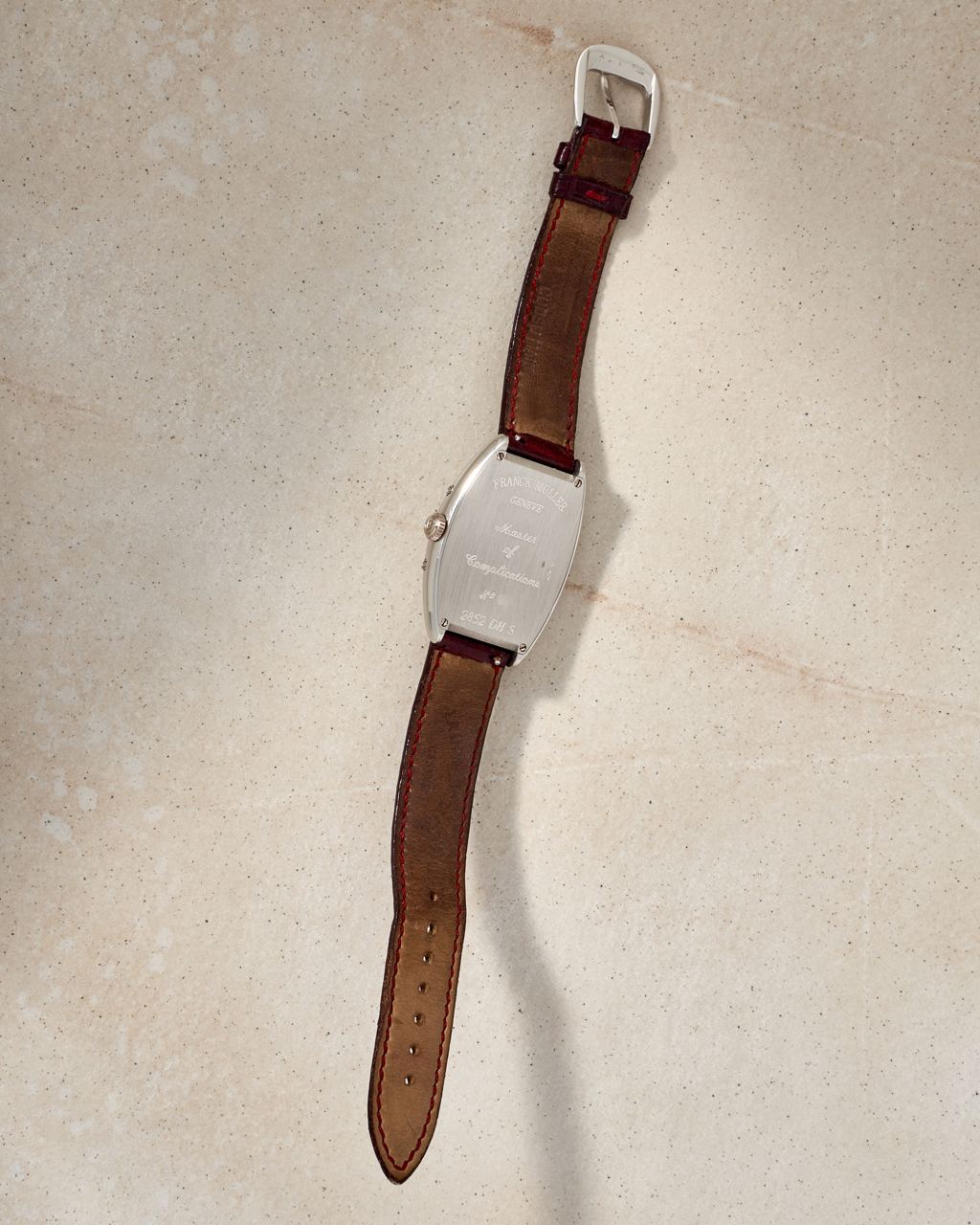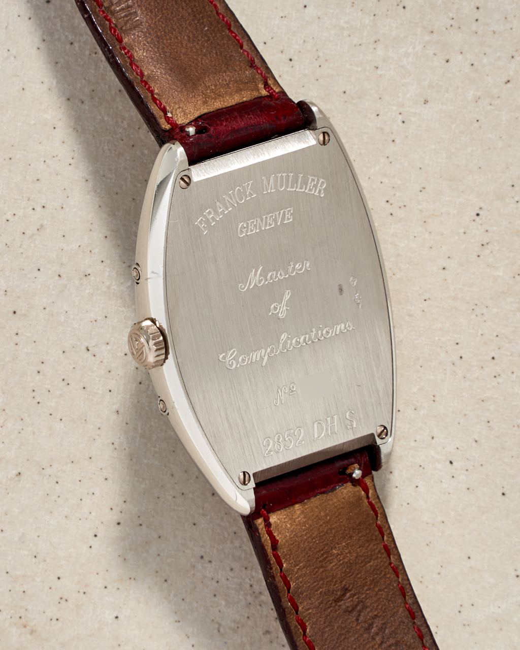 CaseTonneau ‘cintree curvex’ case in platinum 950, polished, fixed bezel in platinum 950, polished, solid platinum caseback fixed by 4 screws engraved with ‘Franck Muller Geneve Master of Complications’ case and reference numbers, winding crown at 3 o’clock in white gold with ‘FM’ logo embossed