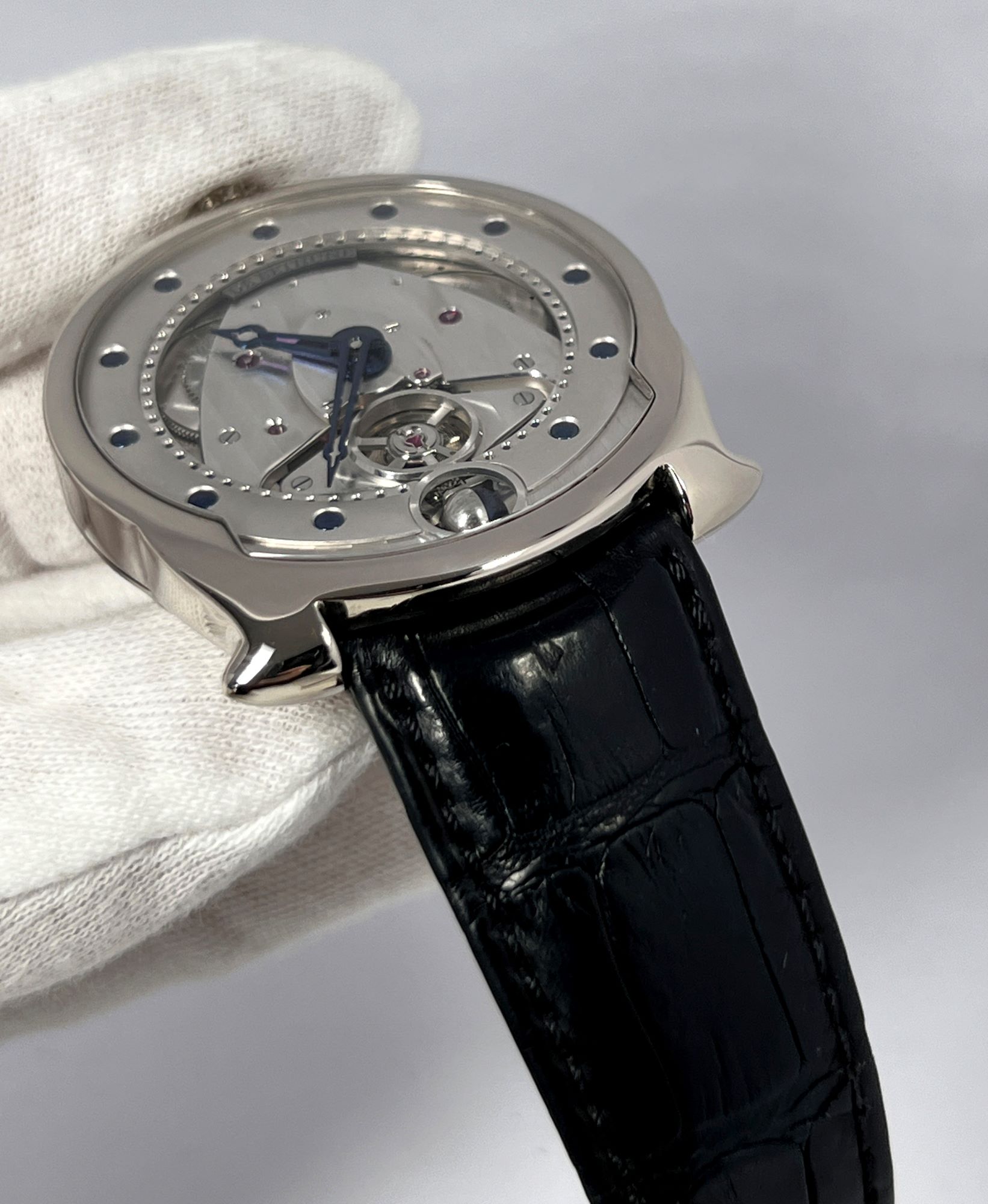 DialOpen-worked dial, convex chapter ring with blued half-sphere indexes, pierced minute track, first-generation blued steel open-worked ‘avant-garde Breguet’ hour and minute hands, platinum and blued steel spherical moonphase indicator at 6 o’clock