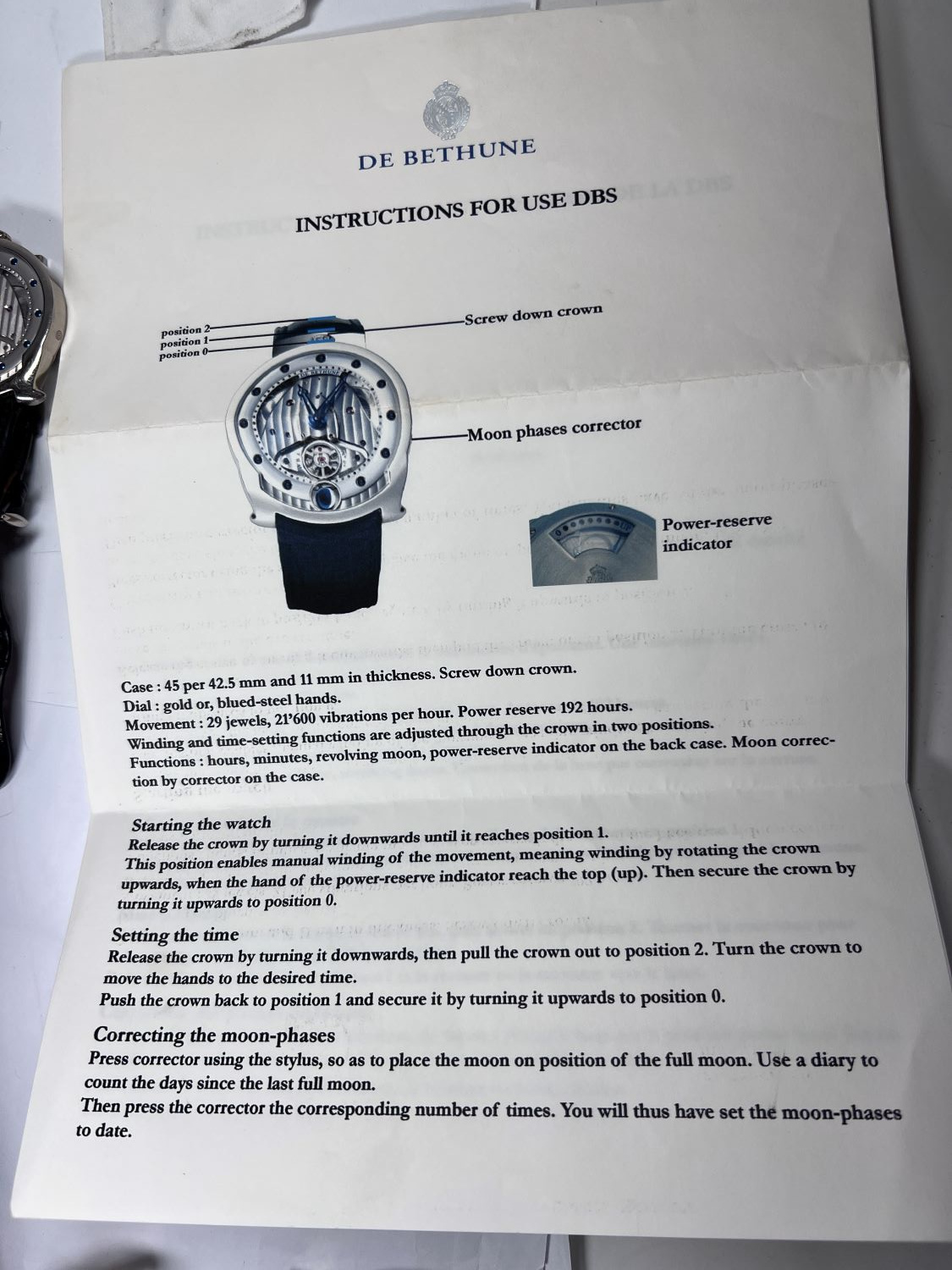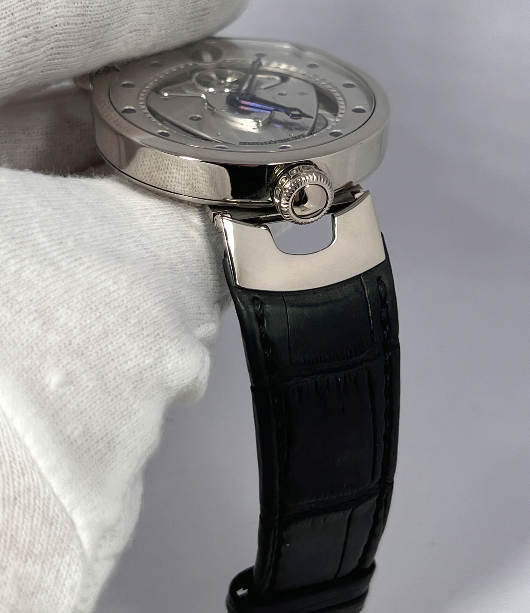 CaseRound case in 18k white gold, polished, with lower ‘bullet’ lugs and upper hinged loop for the strap attachment, fixed bezel in 18k white gold, polished, solid gold caseback fixed on 5 screws with aperture of power reserve indicator and ‘De Bethune’, De Bethune coat of arms, reference and case number engraved, crown at 3 o’clock