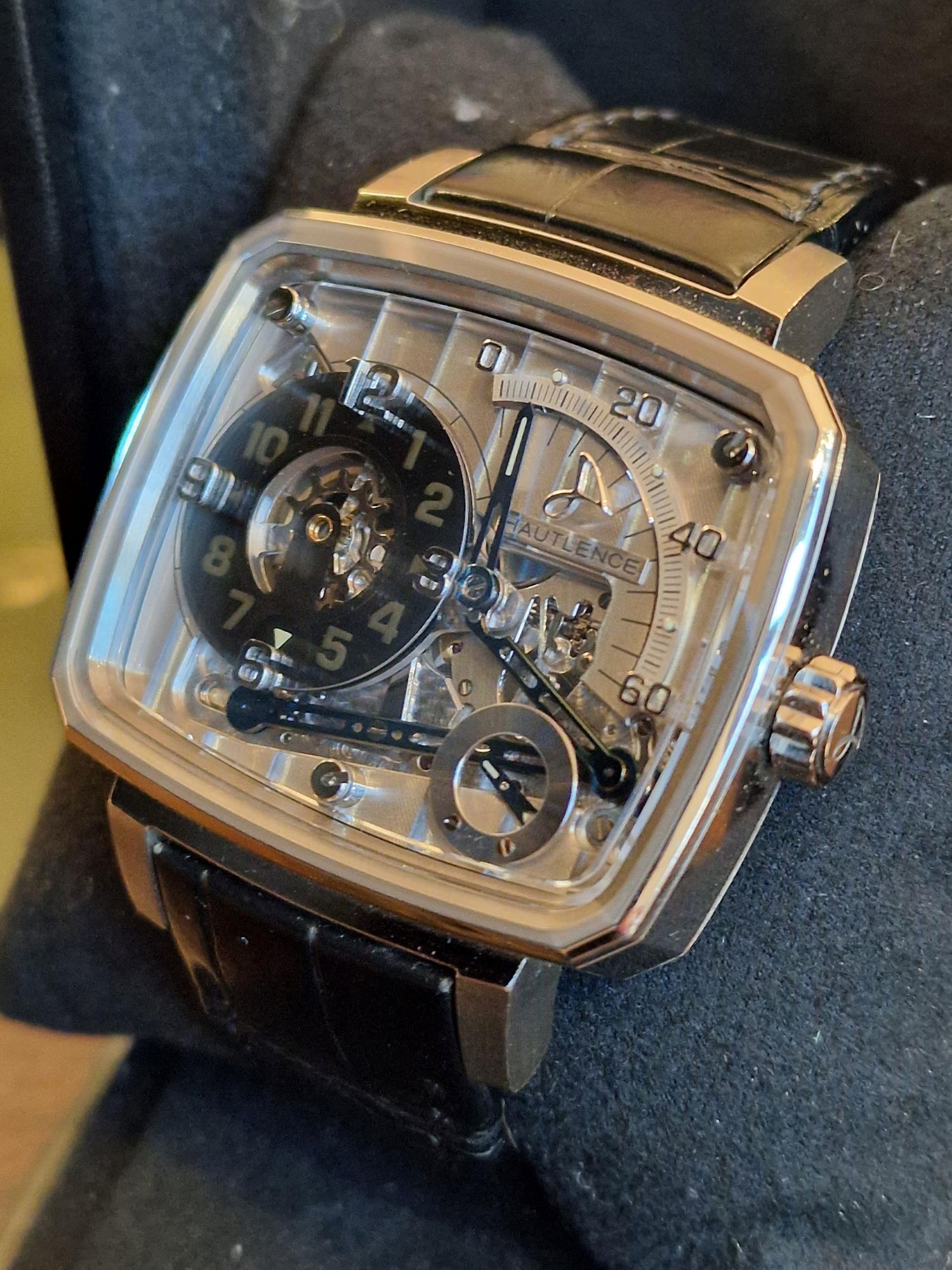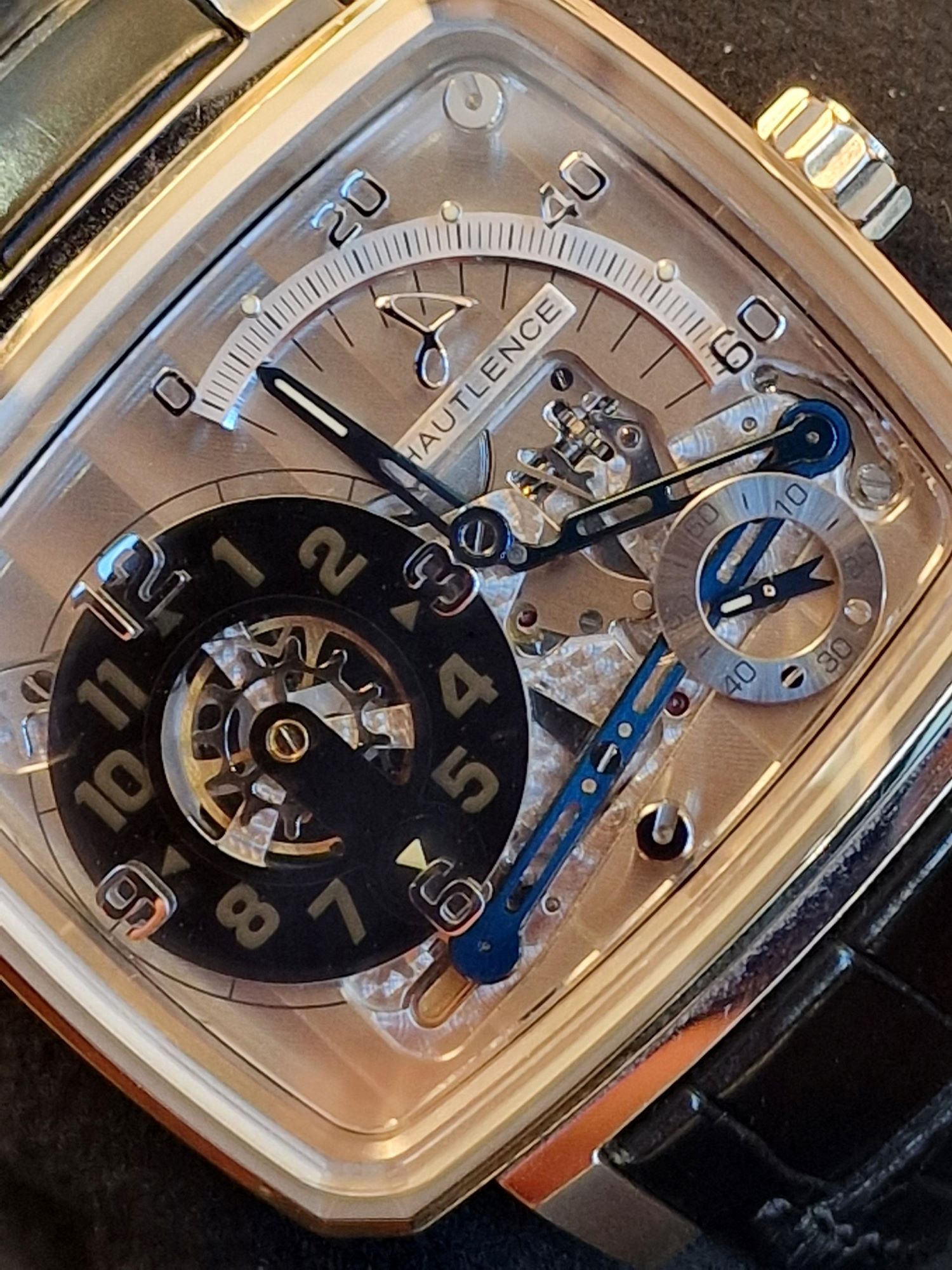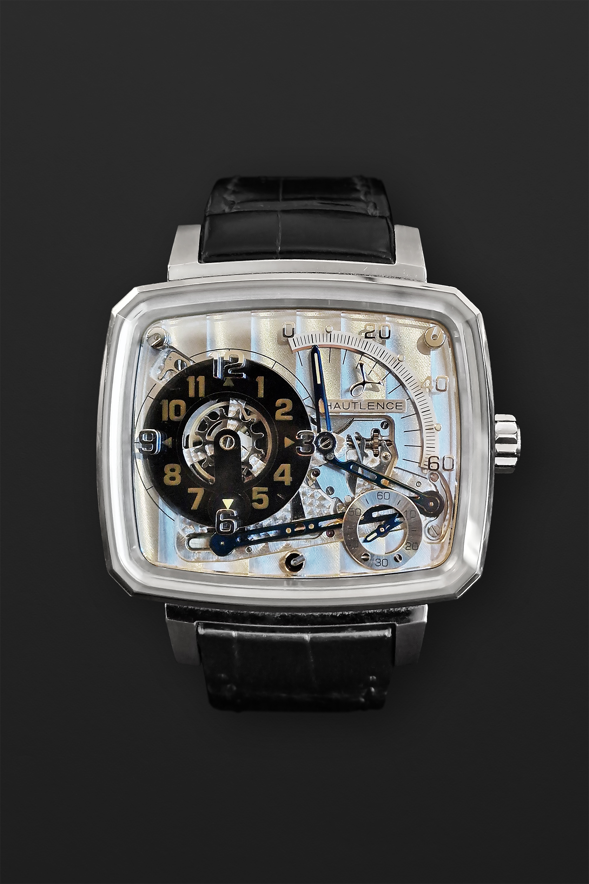 DialPartially open-worked rhodium plated dial, signed Hautlence, with cotes de Geneve stripped finish, black sub-dial of digital jumping hour display at 9 o’clock, retrograde minute hand at 3 o’clock, small seconds at 5 o’clock, applied Arabic numerals, visible jumping hour and retrograde minute mechanism