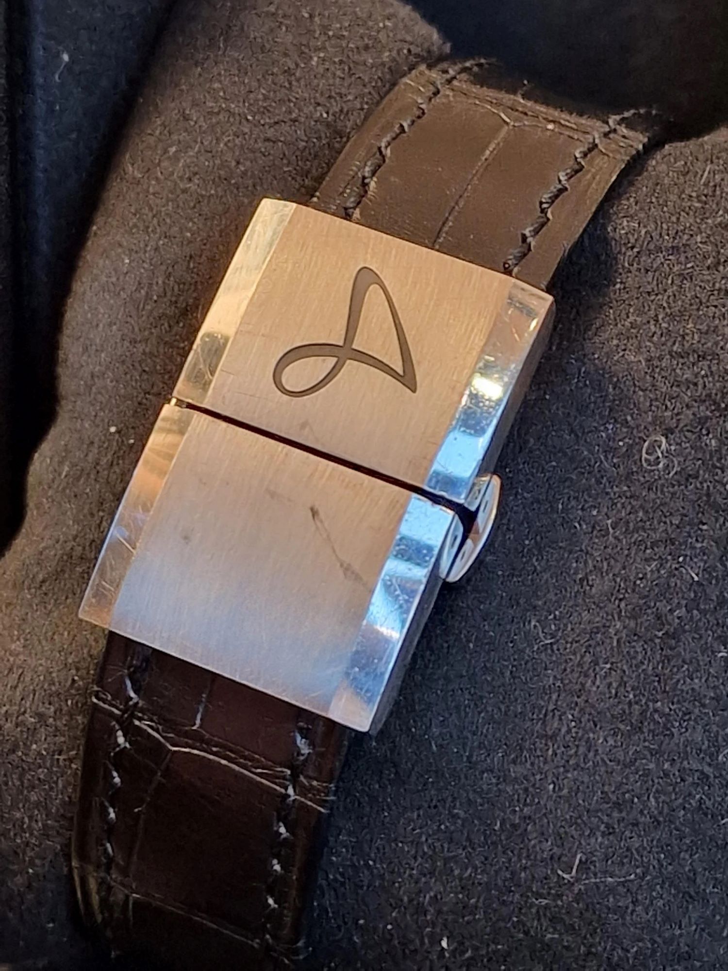 StrapBlack alligator strap signed ‘Hautlence’ and infinity symbol, triple folding clasp in 18k white gold, polished and brushed, closure with Hautlence infinity symbol engraved