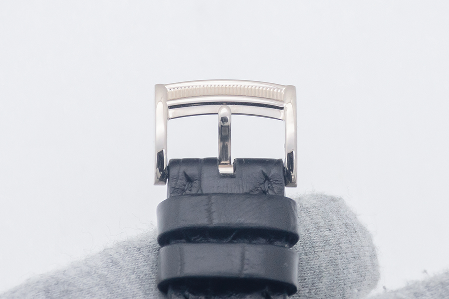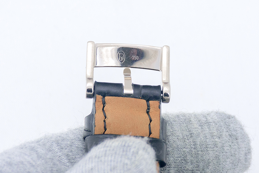 StrapBlack alligator strap, pin buckle in 18k white gold with knurled decoration, signed ‘PF’