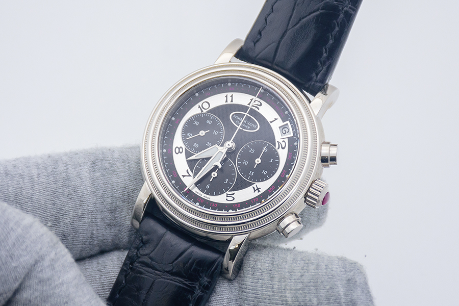 DialBlack dial with ‘grain d’orge’ guilloche pattern, signed Parmigiani Fleurier on oval cartouche at 12 o’clock, ‘Parmigiani Alpha’ hour and minute hands, luminous, ‘stick’ central chronograph seconds hand with crescent moon counterweight, white chapter ring with black Arabic numerals, date in aperture between 1 and 2 o’clock, small seconds at 9 o’clock, chrono 30-minute counter at 3 o’clock, chrono 12-hour counter at 6 o’clock, outer tachymeter scale in red