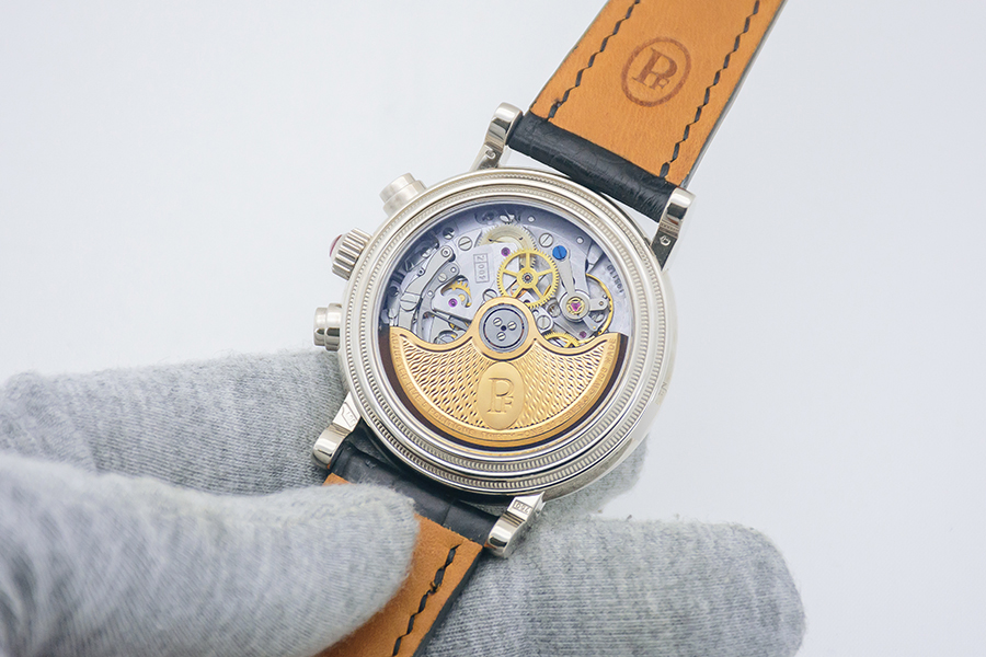 MovementSelf-winding mechanical movement, hi-beat, column wheel chronograph mechanism, rhodium plated, bridges with cotes de Geneve, mainplate with perlage, engraved inscriptions, solid gold rotor with ‘grain d’orge’ guilloche pattern and ‘PF’ logo on oval cartouche, functions: hours, minutes, seconds, date, chronograph with seconds, minute and hour counters