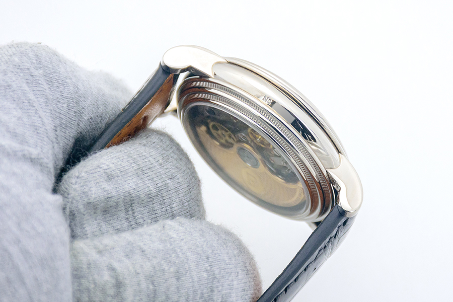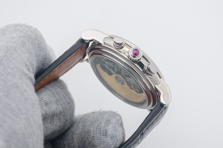 CaseRound case in 18k white gold, polished, fixed bezel in 18k white gold, double knurled, polished, snap-on exhibition caseback, double knurled, caseband with case number engraved at 9 o’clock, crown at 3 o’clock with ruby cabochon, chronograph pushers at 2 and 4 o’clock