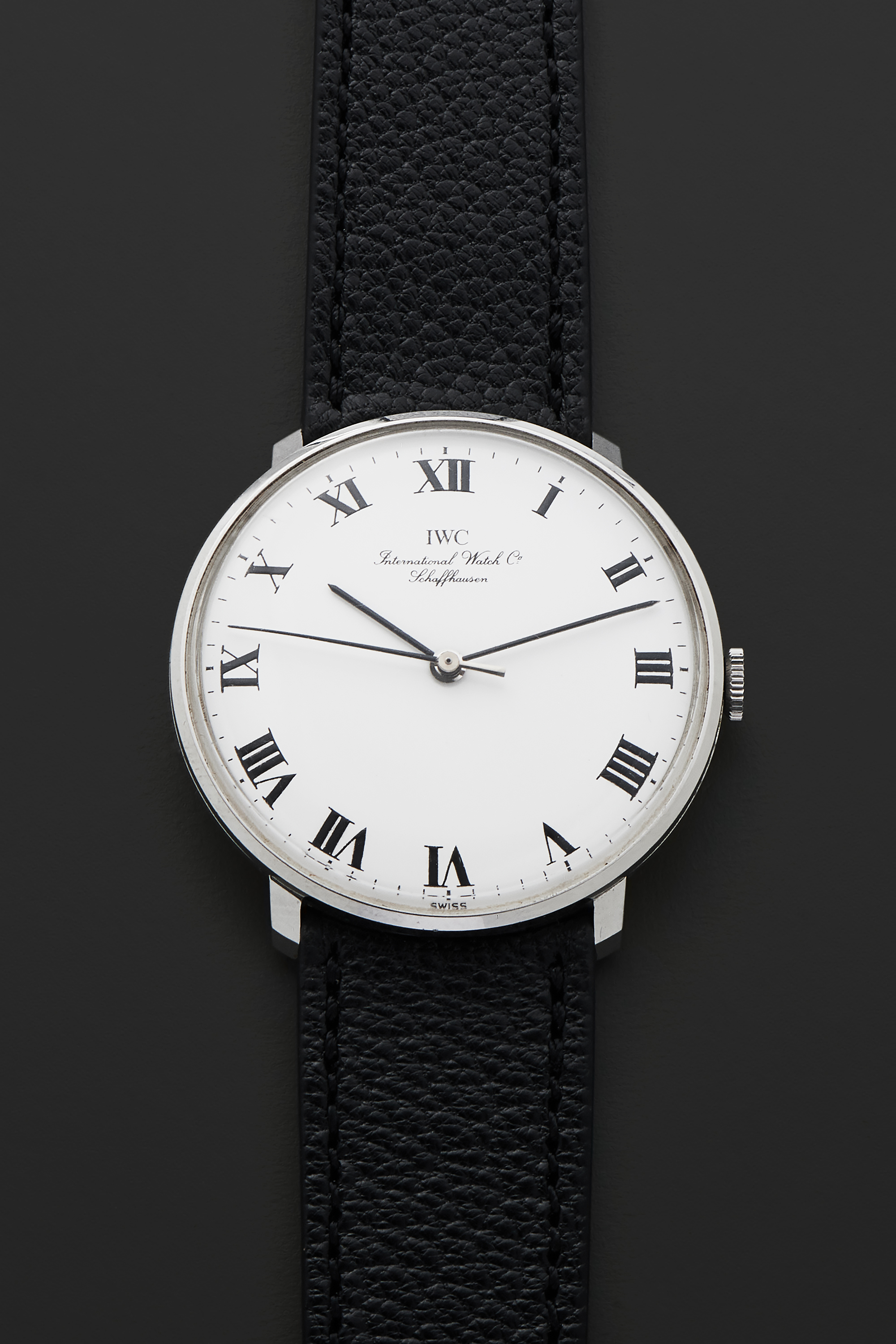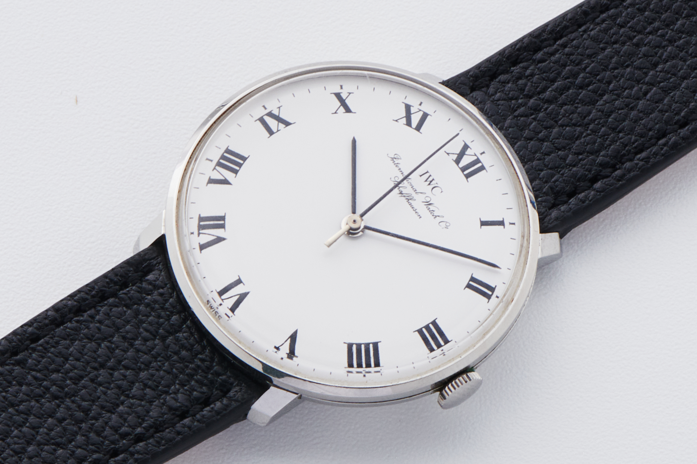 DialWhite lacquer dial with roman numerals, black stick hands, signed 'IWC - International Watch Co. Schaffhausen' at 12 o'clock