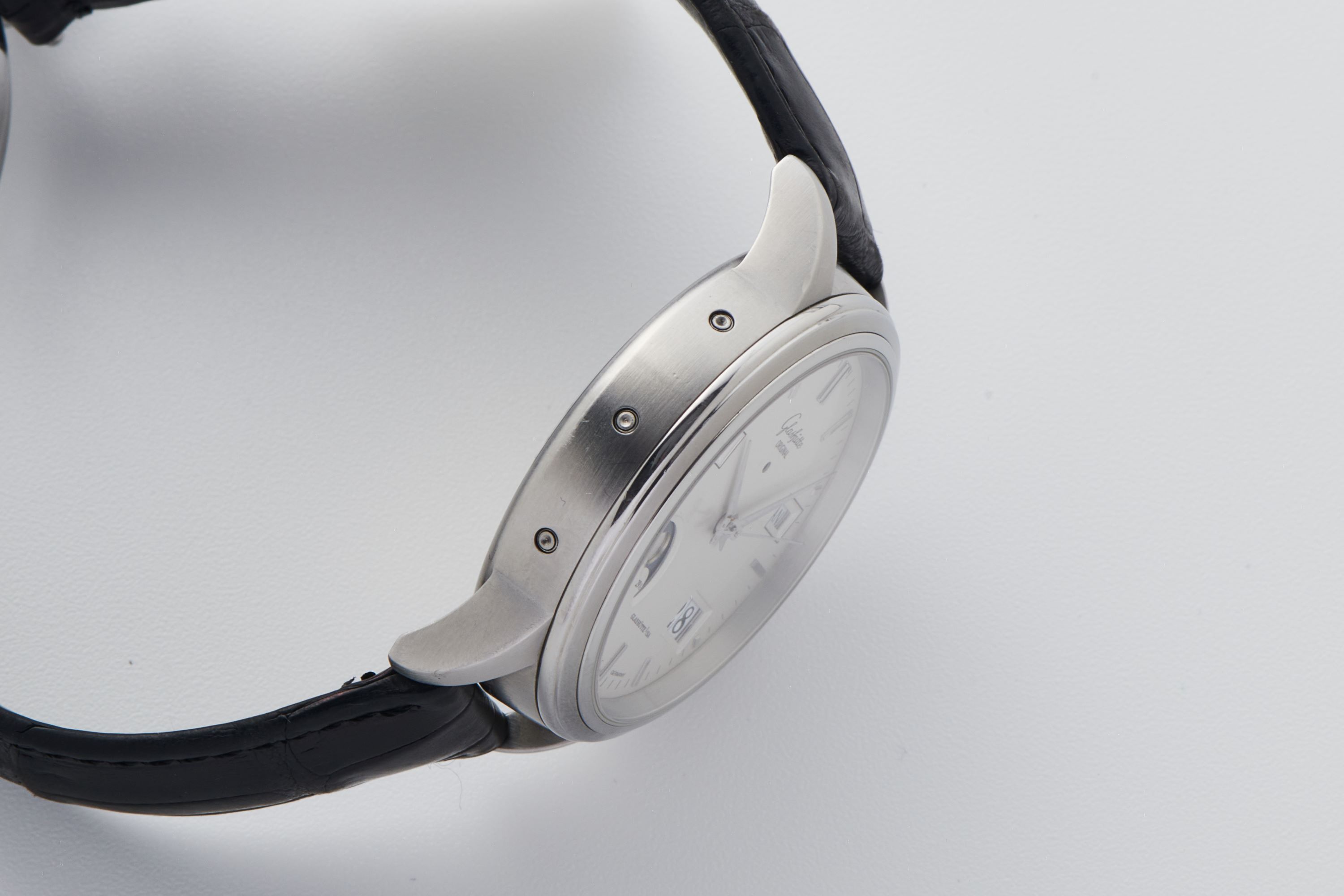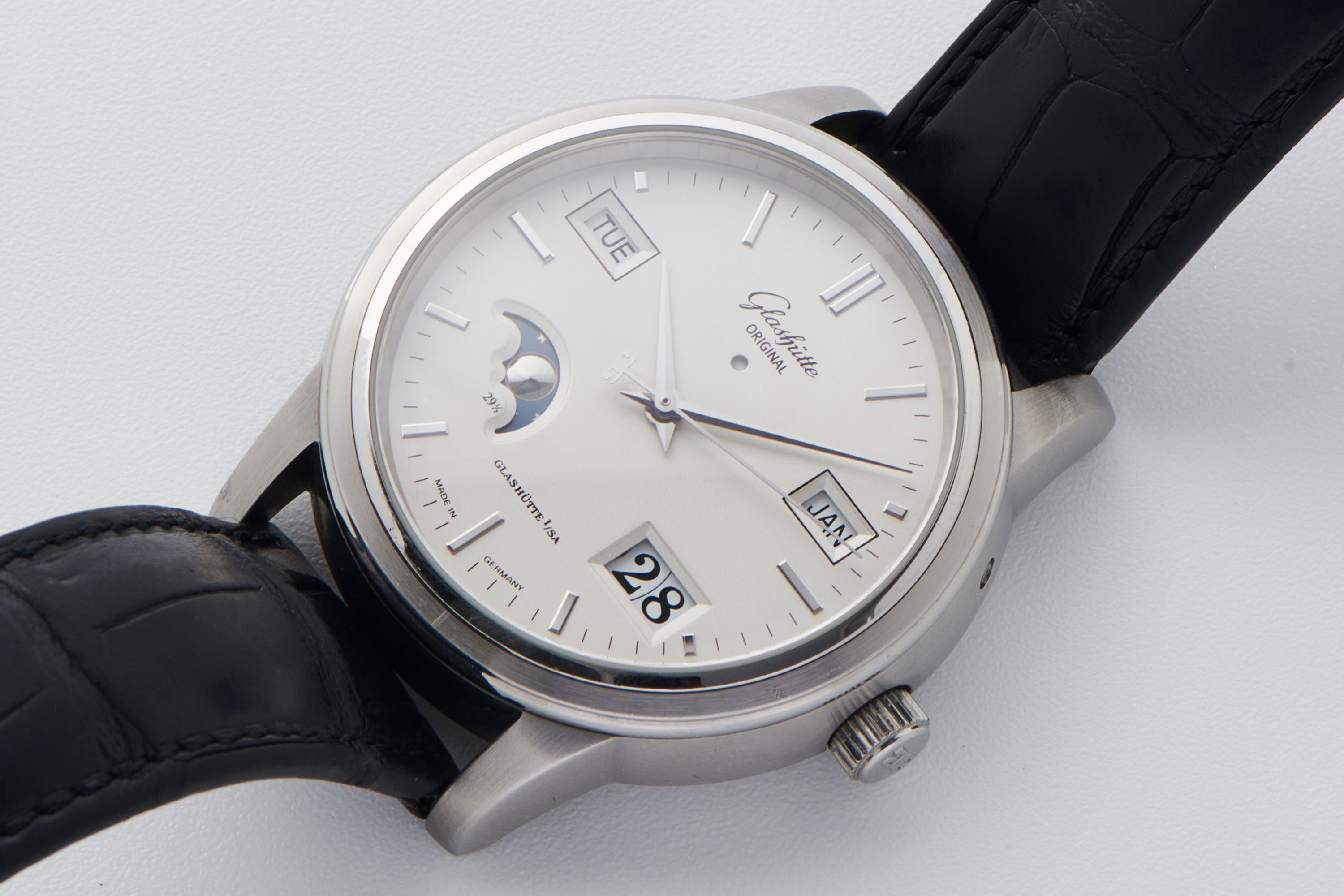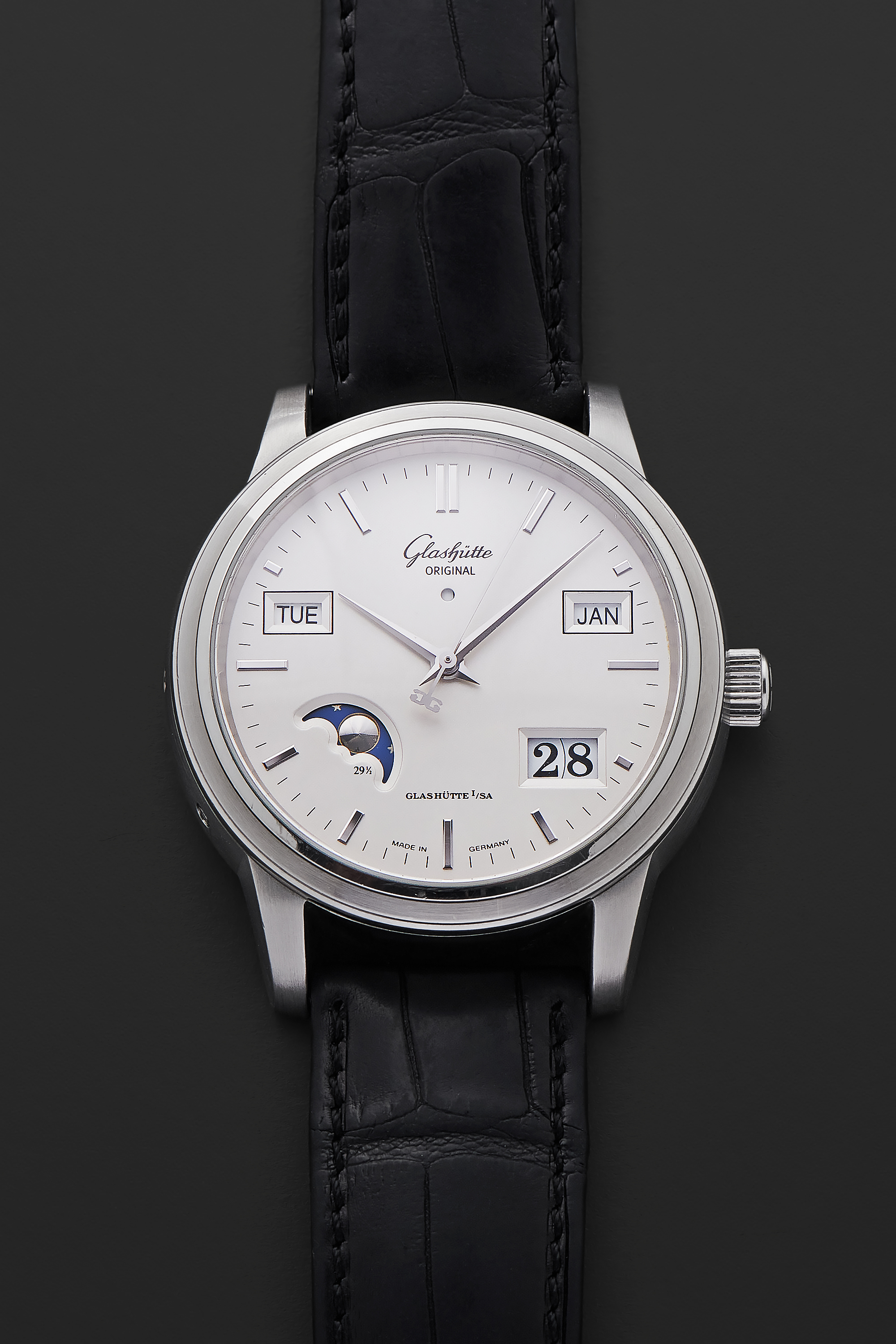 DialSilver-cream dial with applied indices, dauphine hands, moonphase at 7:30, day window at 9:30, month window at 2:30, big date at 4:30, signed 'Glashütte Original' at 12 o'clock