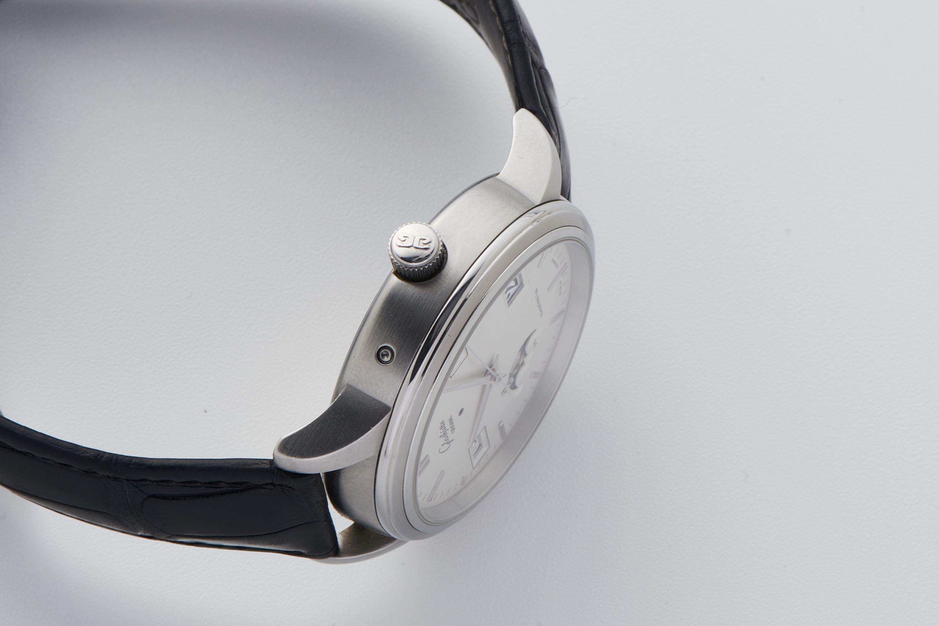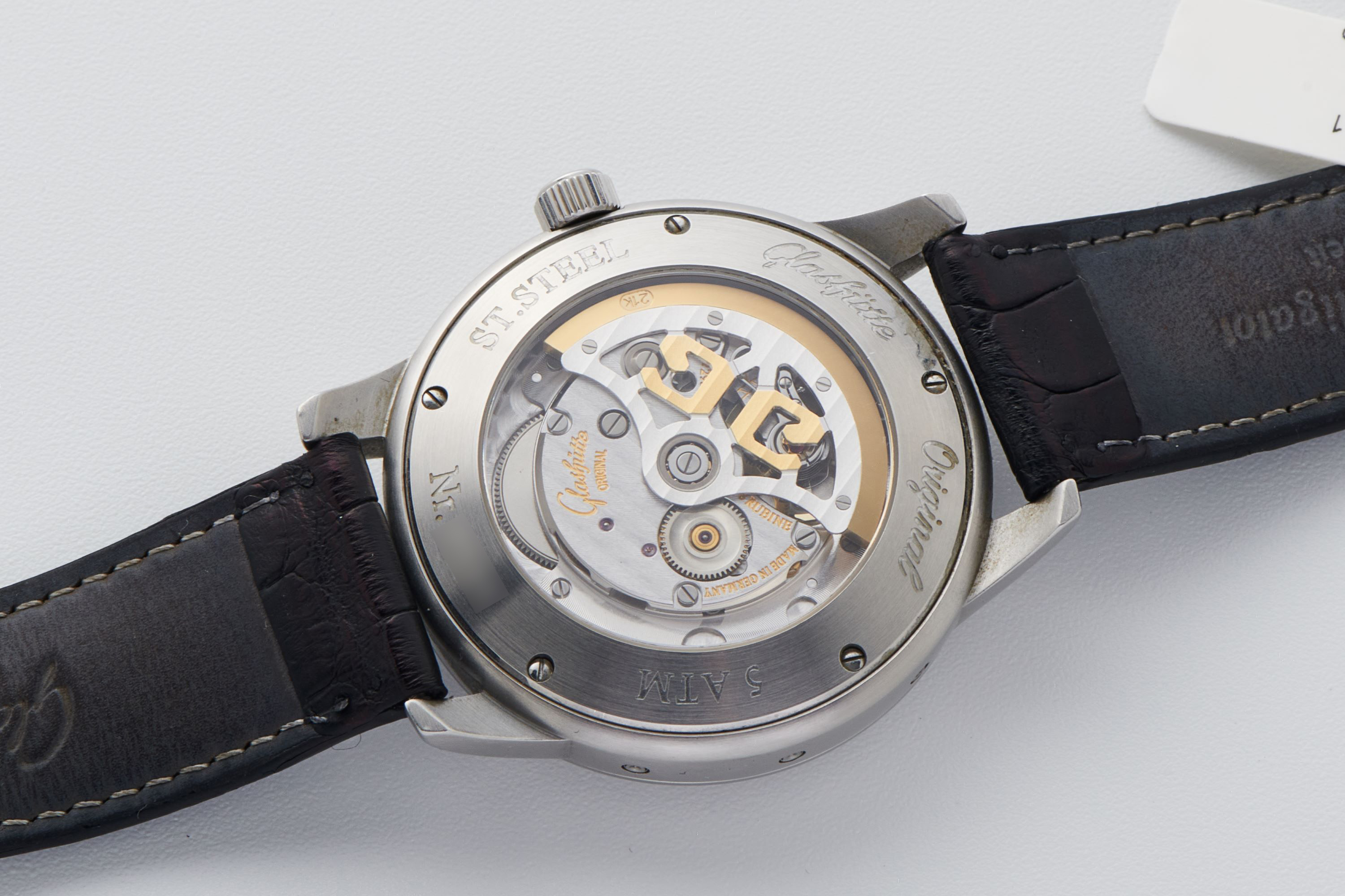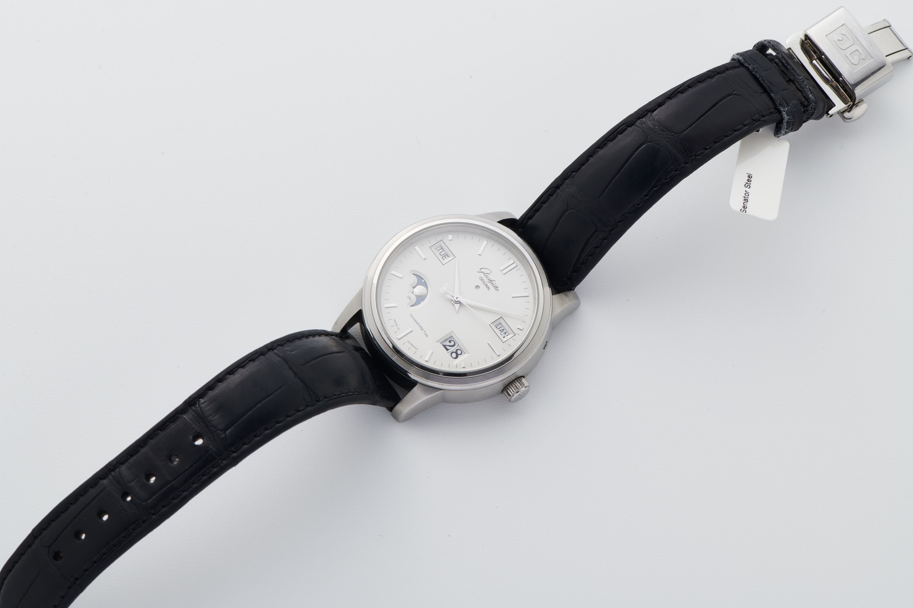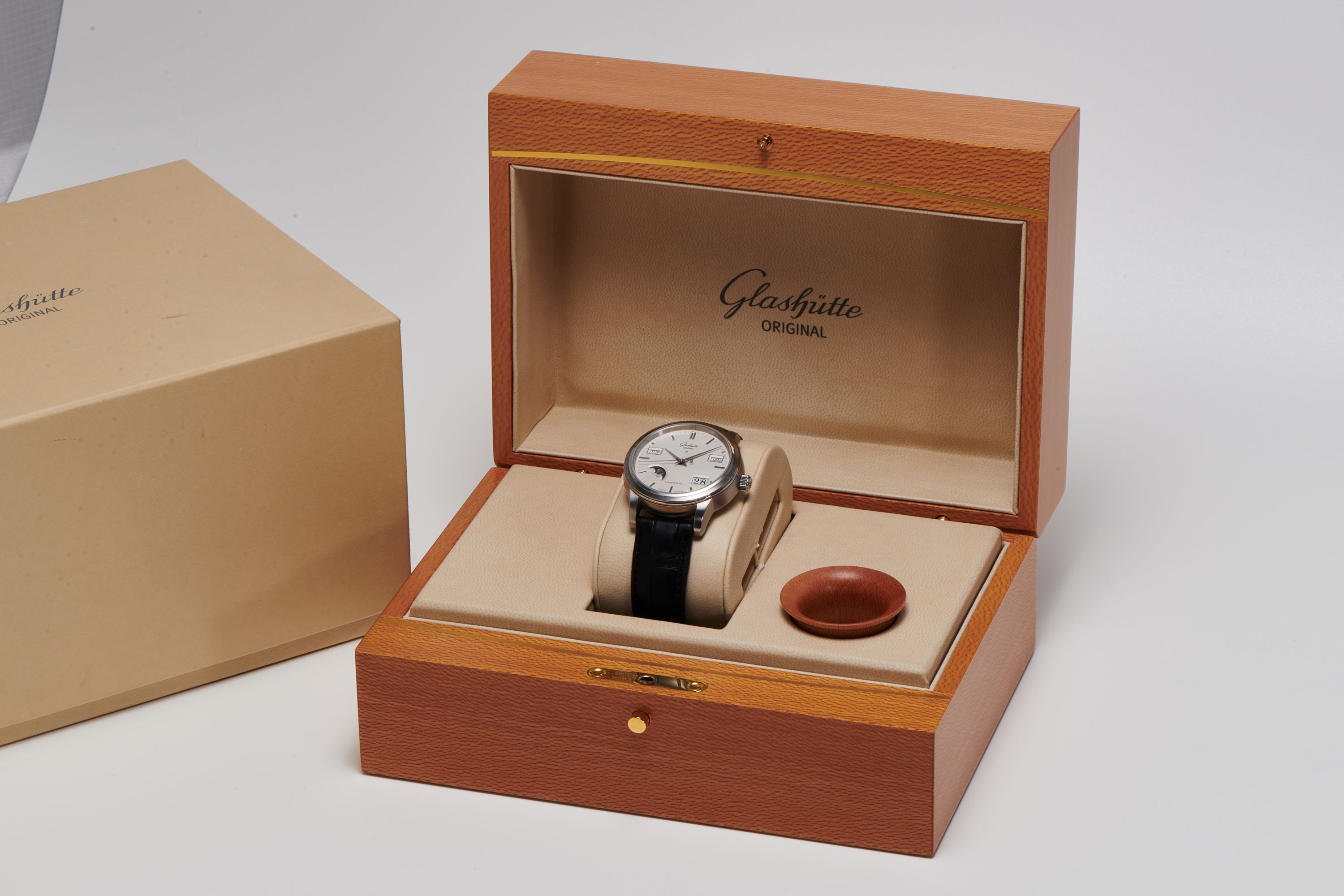 DialSilver-cream dial with applied indices, dauphine hands, moonphase at 7:30, day window at 9:30, month window at 2:30, big date at 4:30, signed 'Glashütte Original' at 12 o'clock