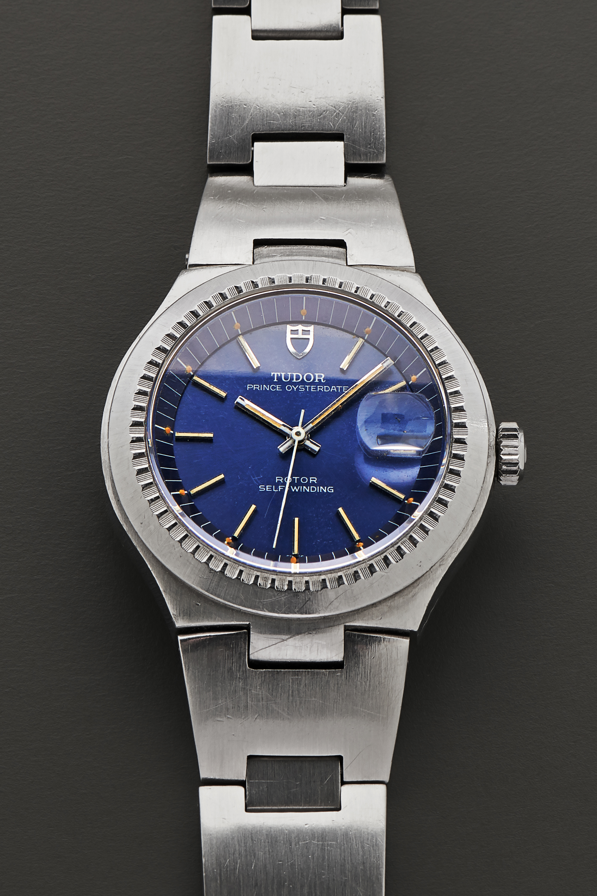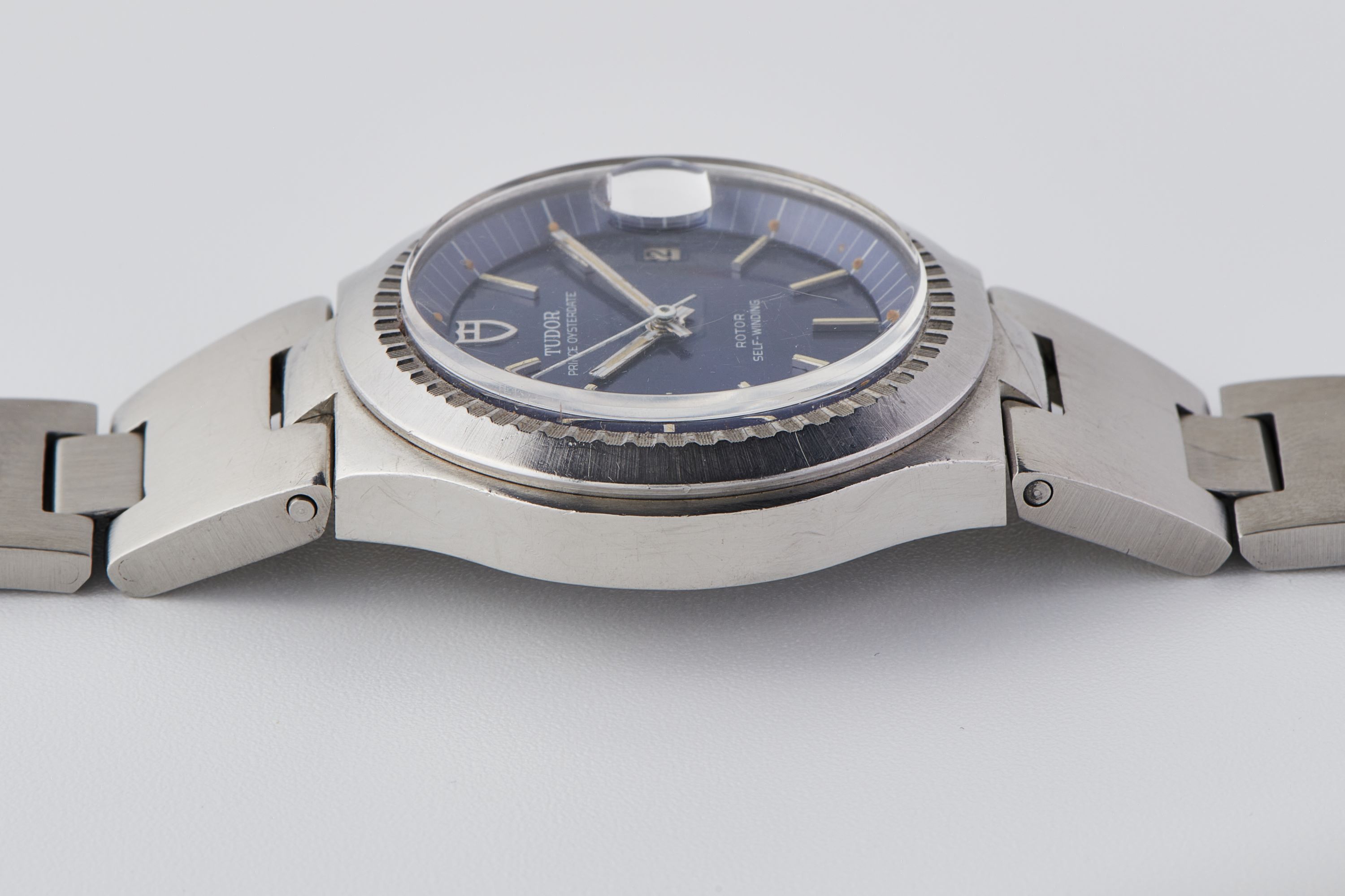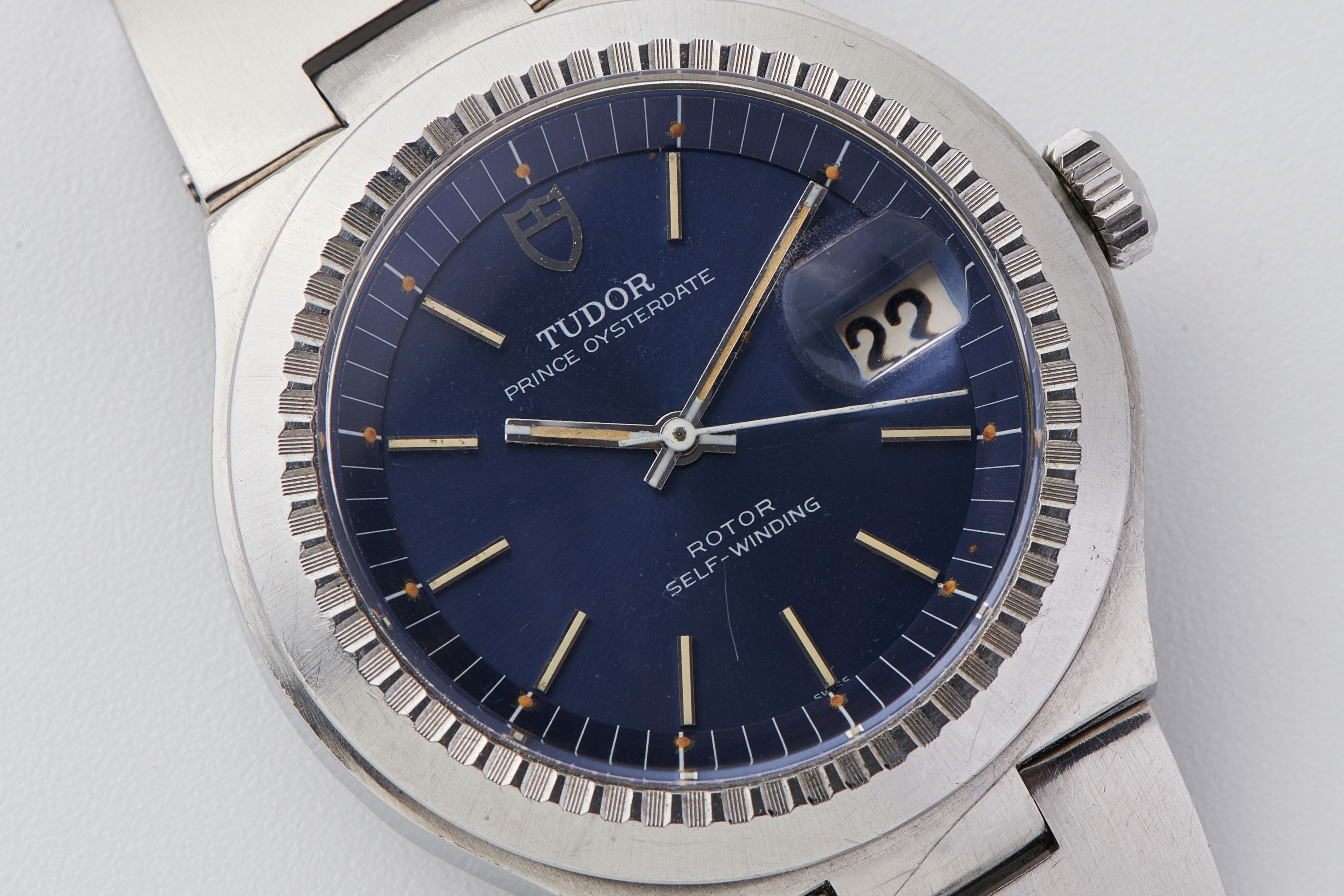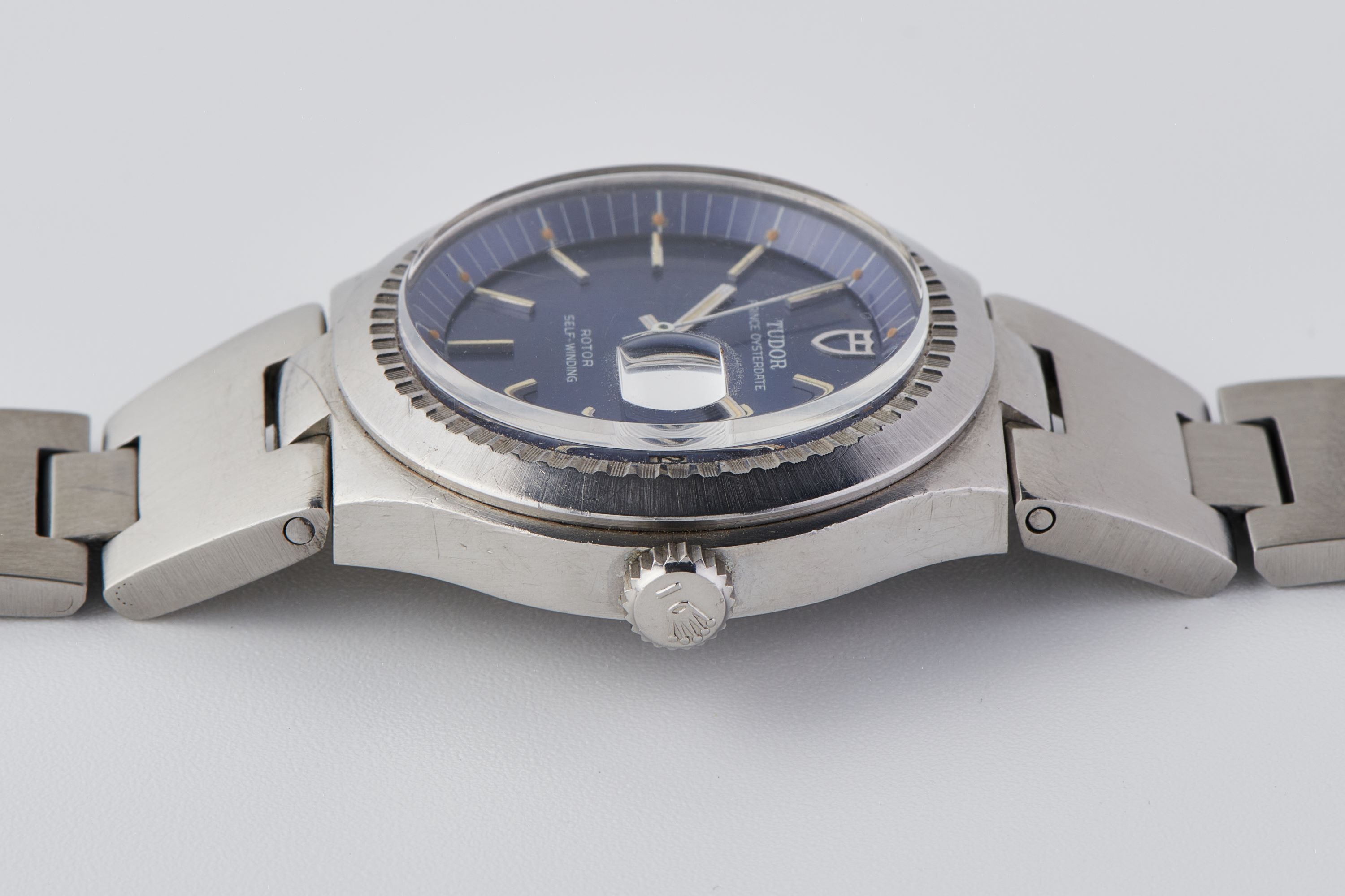 DialBlue sunburst dial with applied indices, luminous hands, magnified date window at 3 o'clock, signed 'Tudor' at 12 o'clock