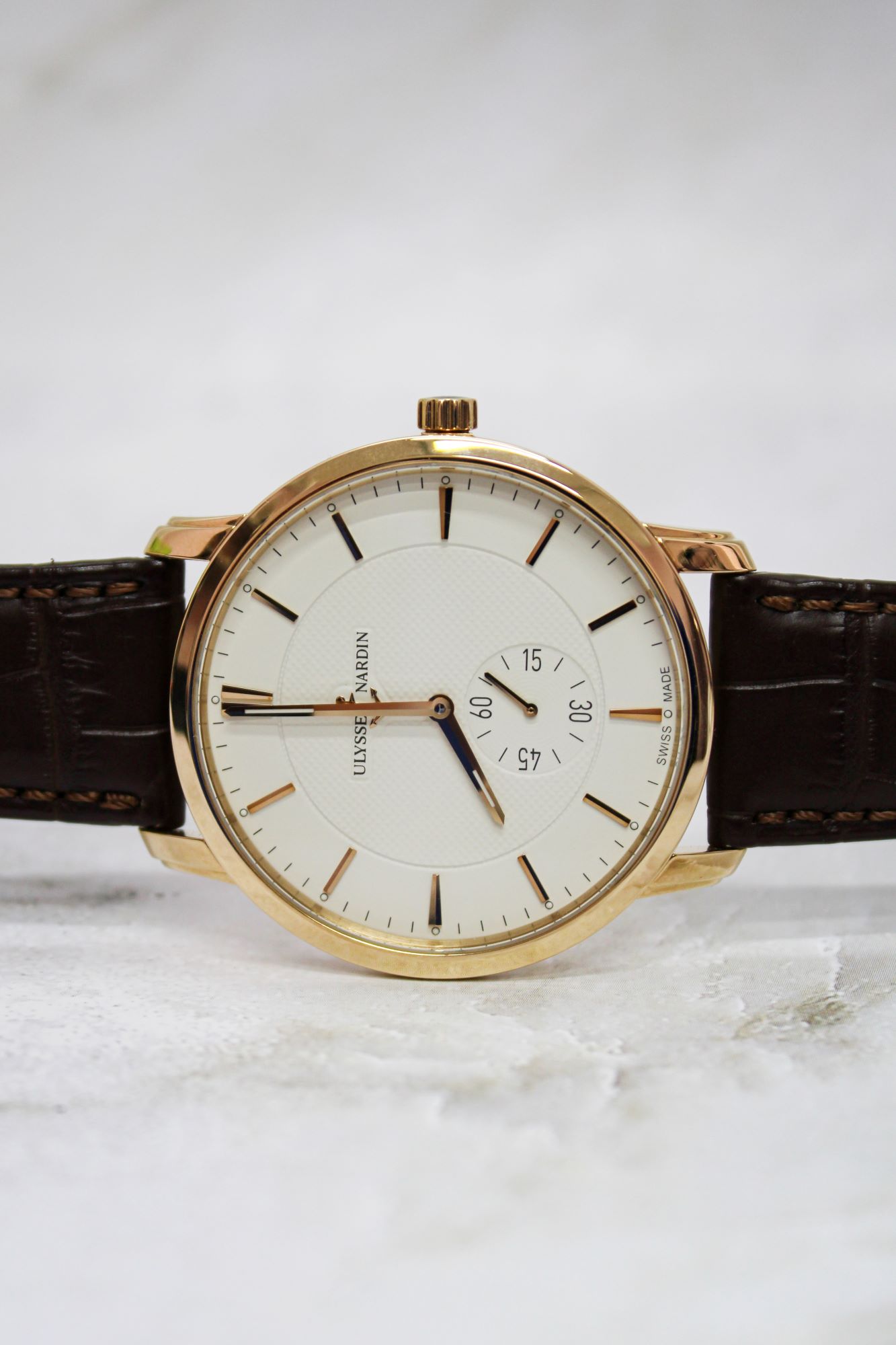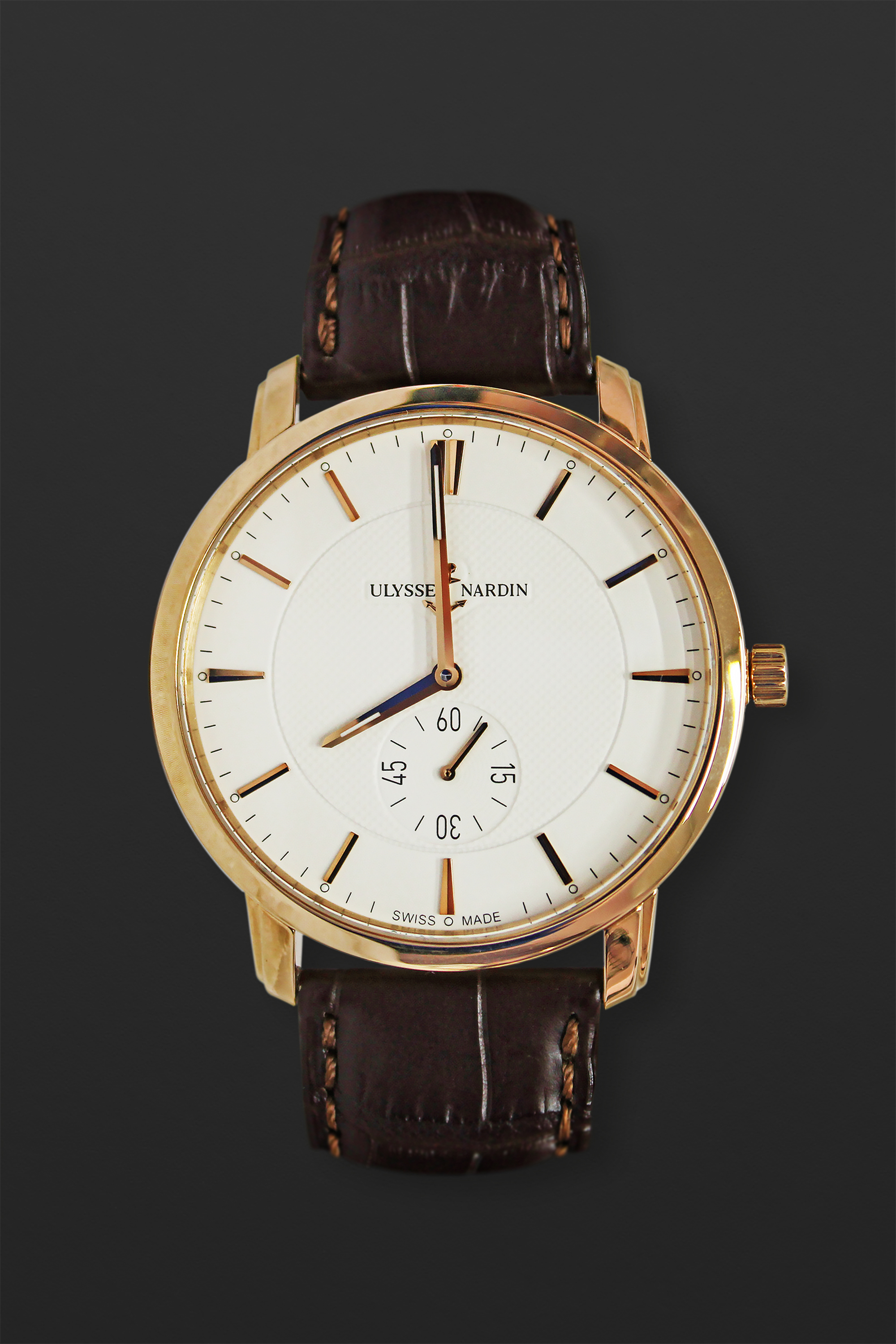 DialWhite dial, signed ‘Ulysse Nardin, applied ‘sea anchor’ at 12 o’clock, faceted ‘obelisk’ hour and minute hands, luminous, applied faceted ‘stick’ indexes with luminous dots, outer minute track, small seconds at 6 o’clock